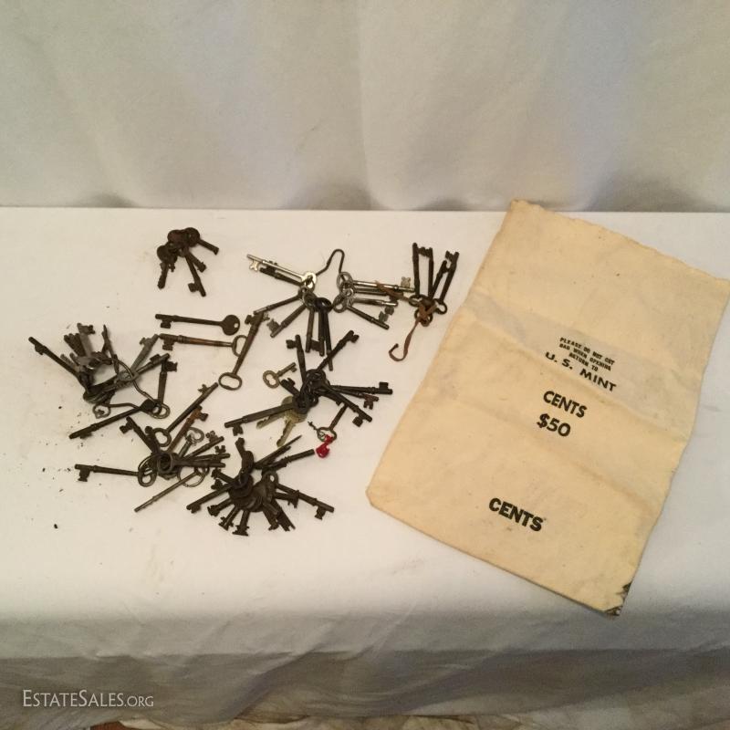 Large lot of skeleton keys.Also includes U.S. Mint $50 Coin Bag. Lot is available for shipping or local pick up in Saluda, NC.