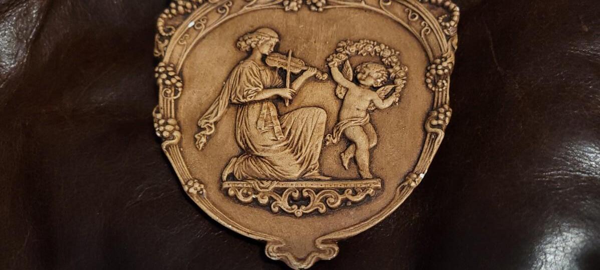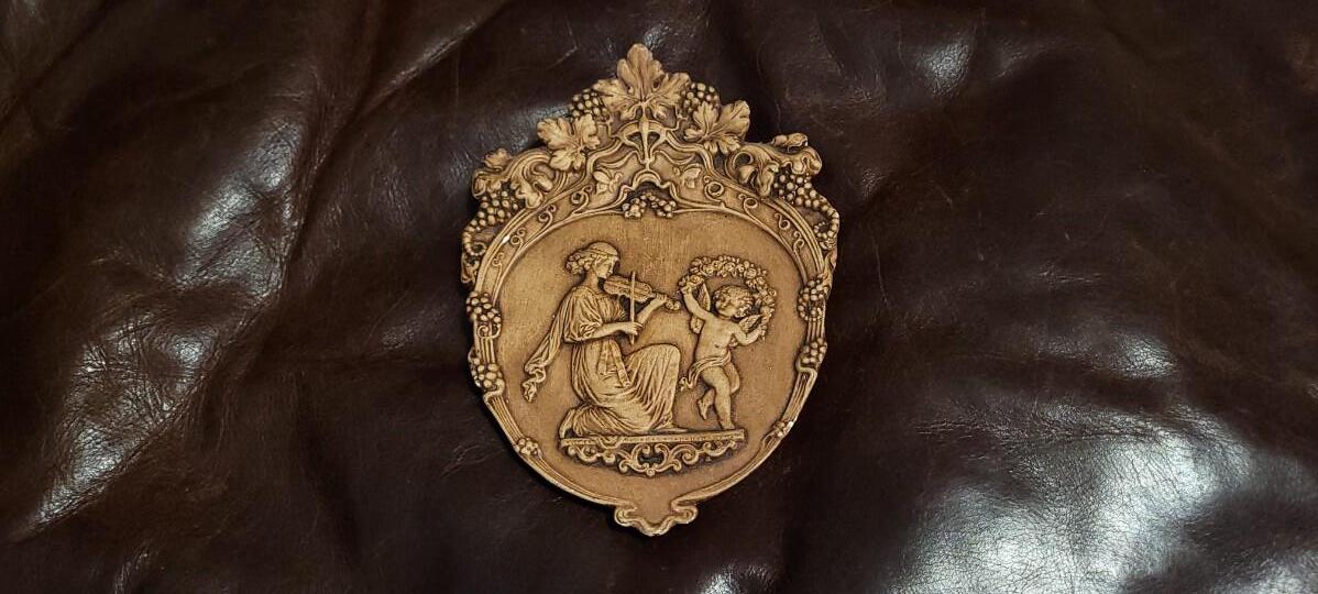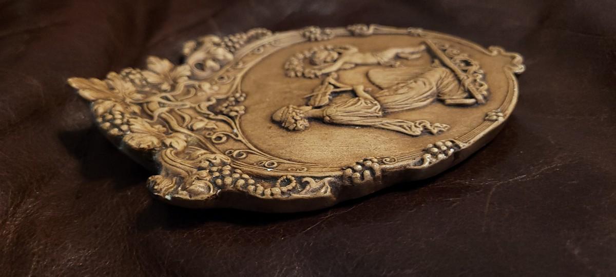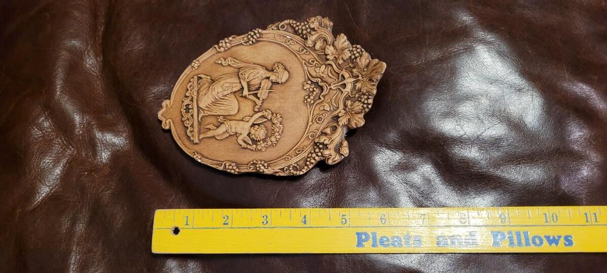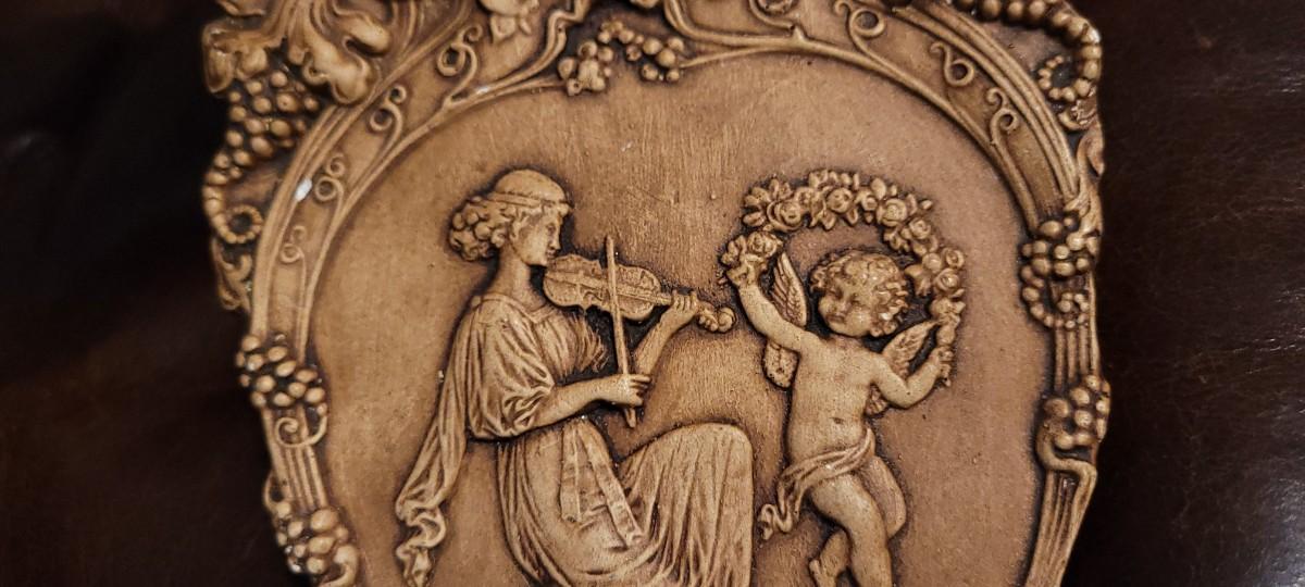 Victorian Carved Hanging Plaque of woman playing instrument while cherub angel dances.