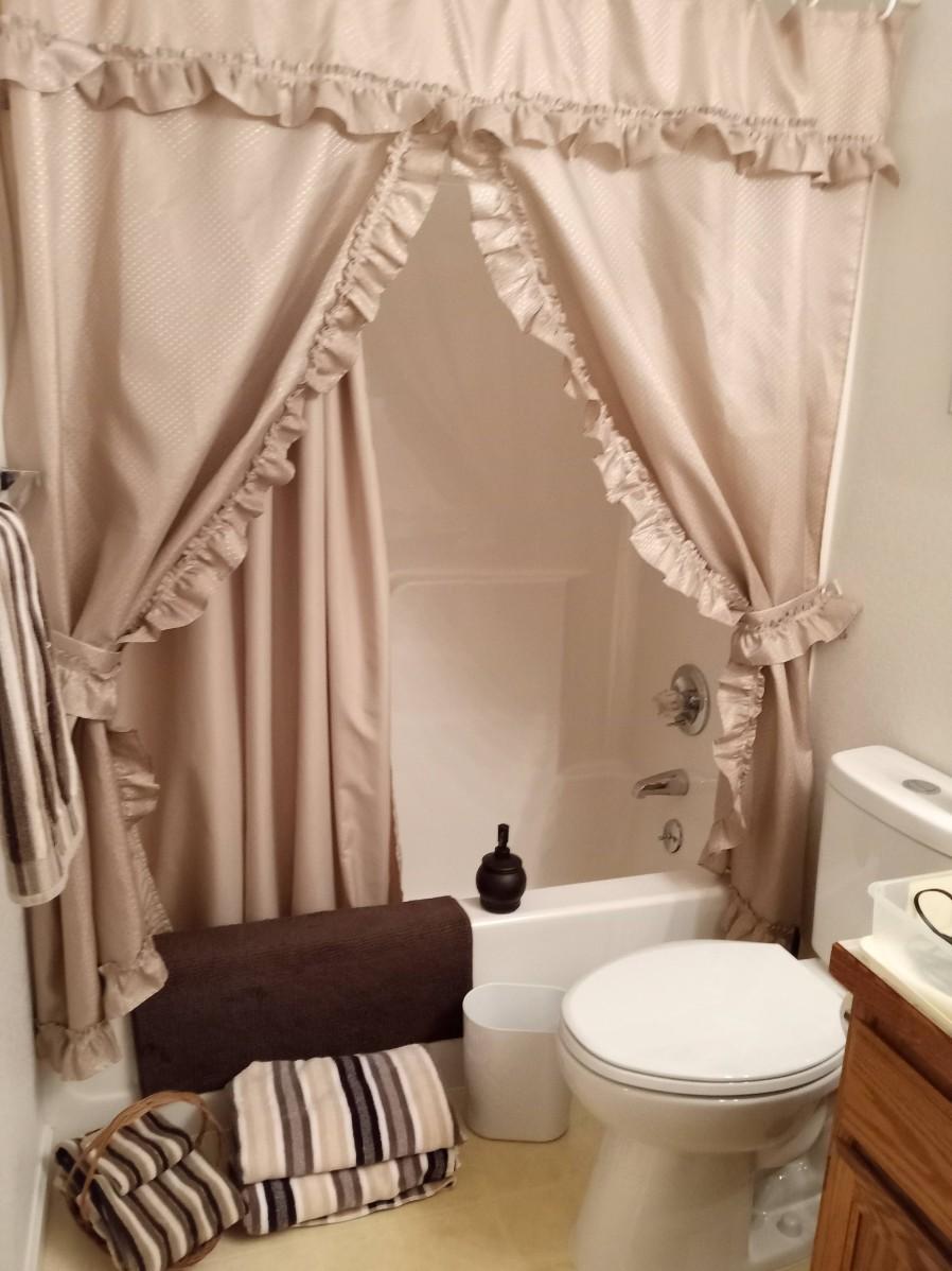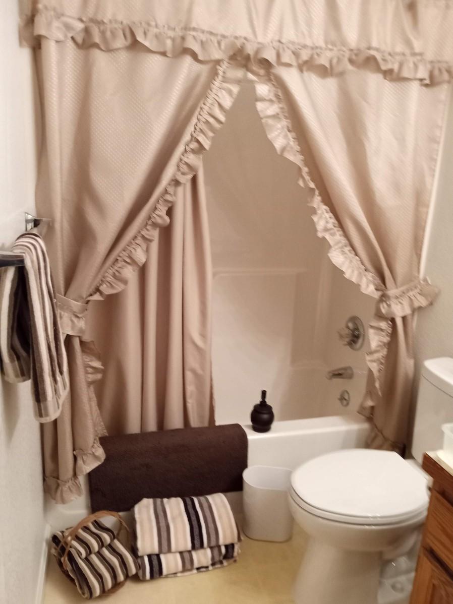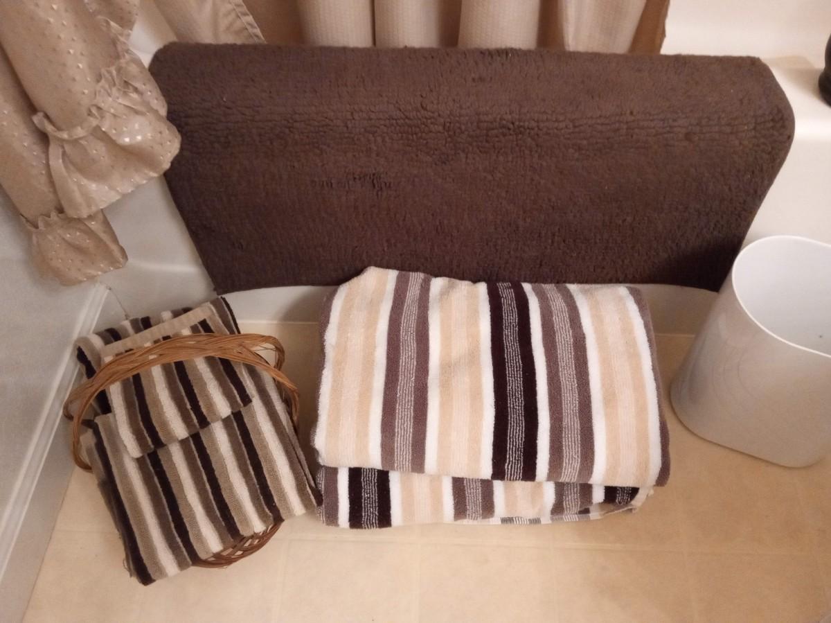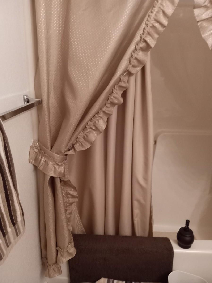 SHOWER CURTAIN, BATH RUG, METAL PUMP DISPENSER, TOWELS, WASTE CAN