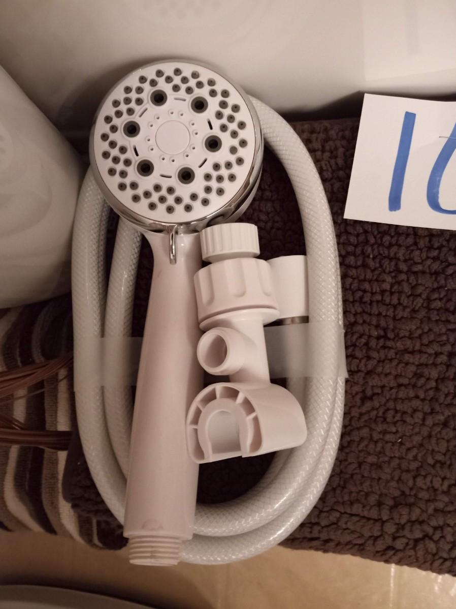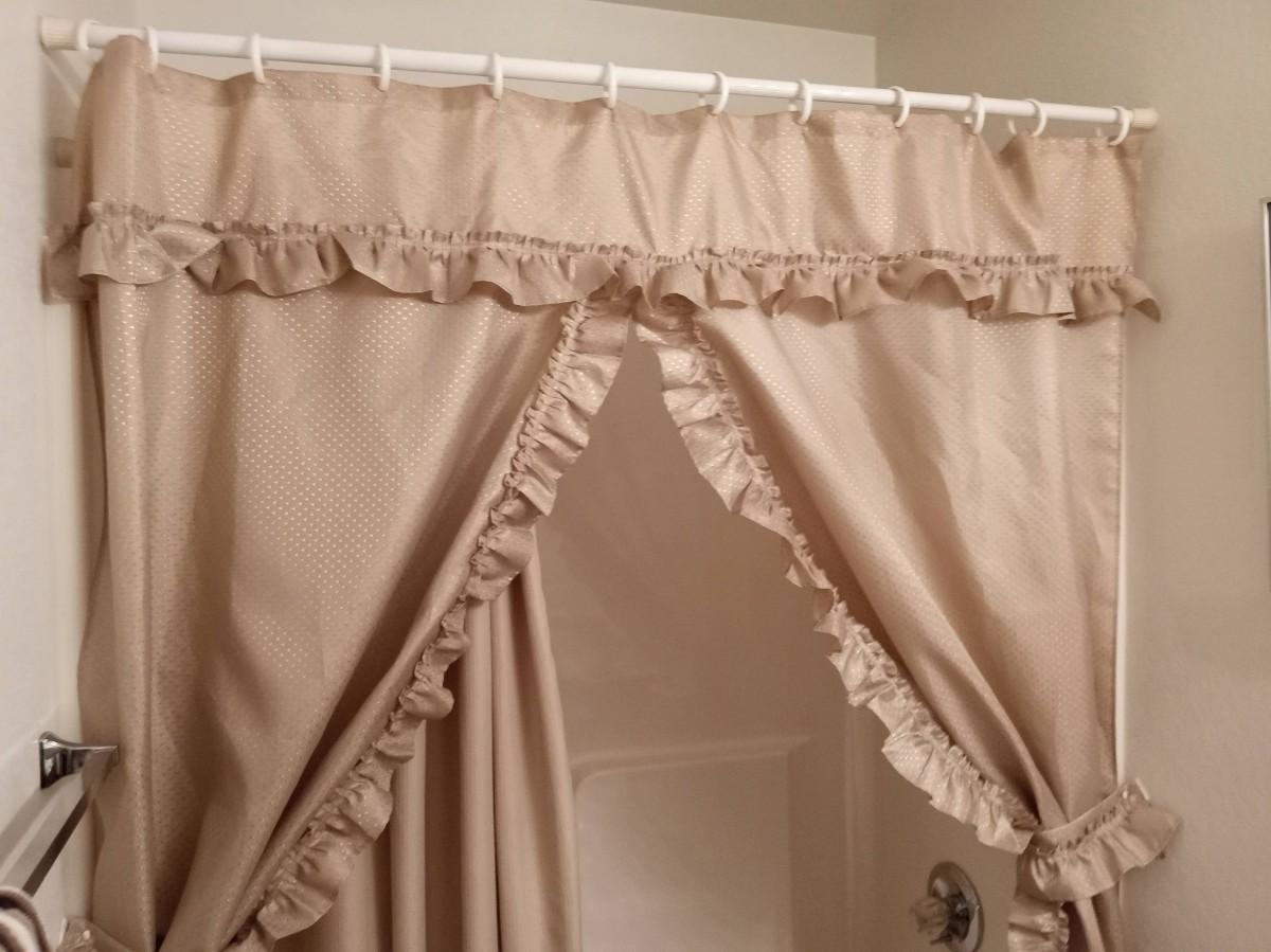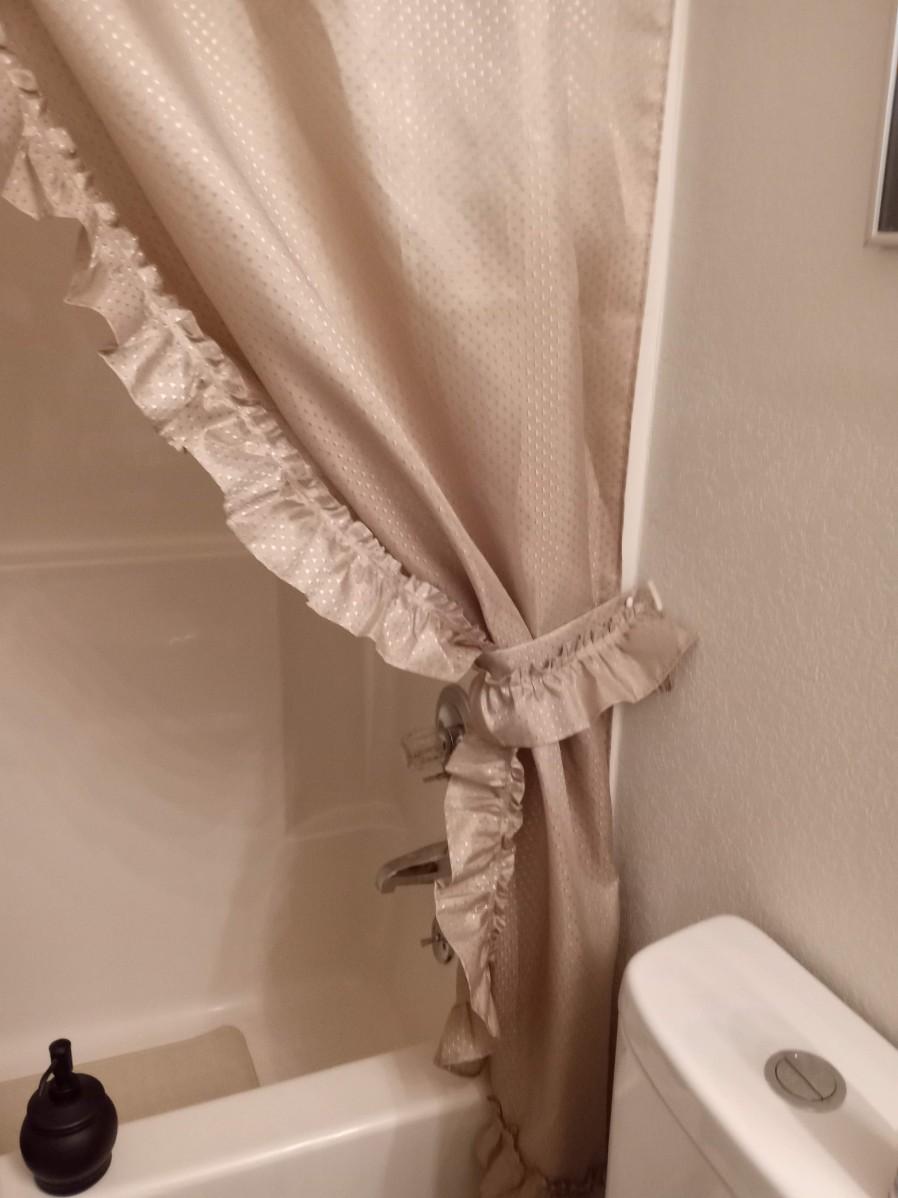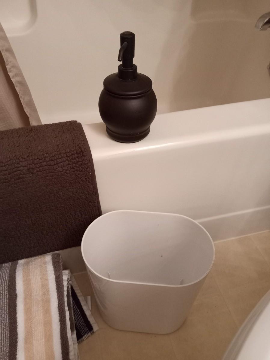 SHOWER CURTAIN, BATH RUG, METAL PUMP DISPENSER, TOWELS, WASTE CAN