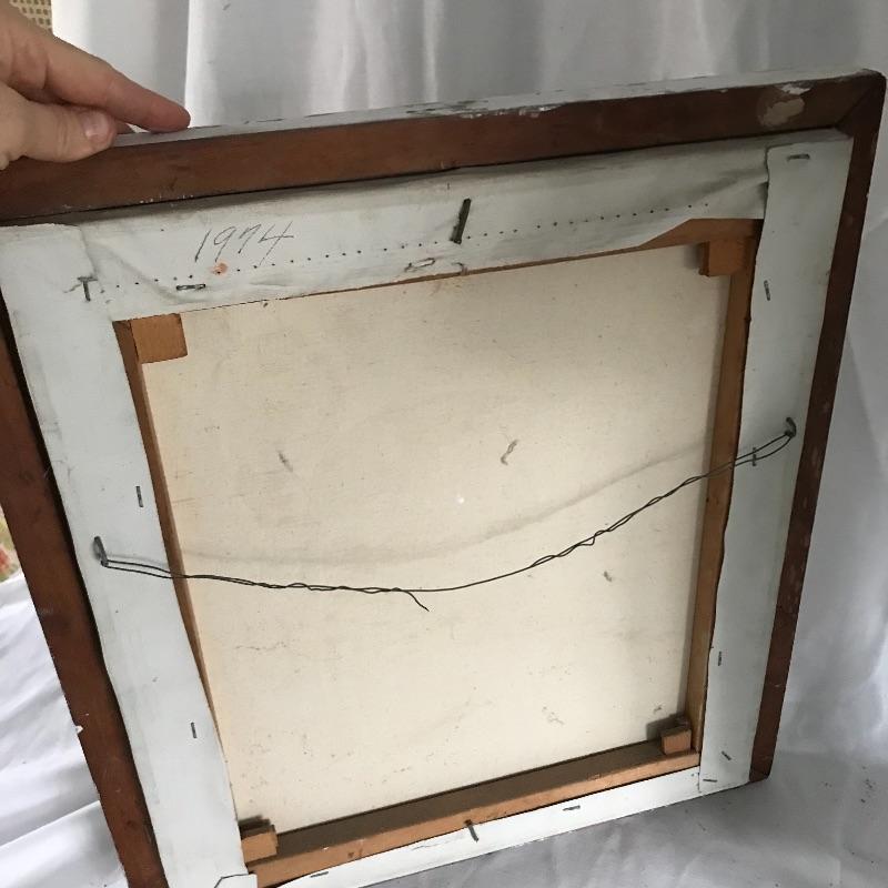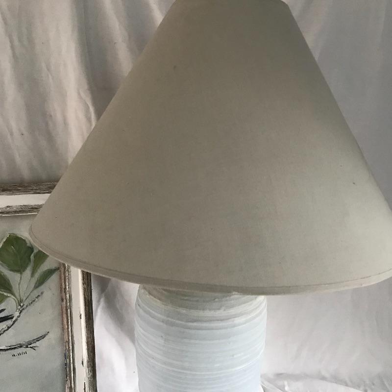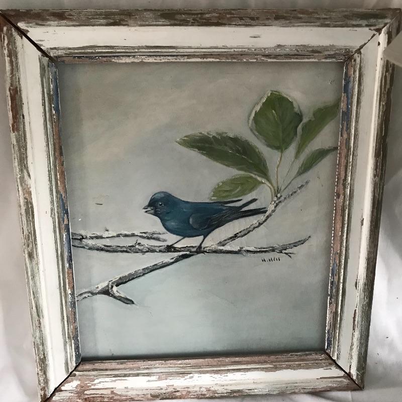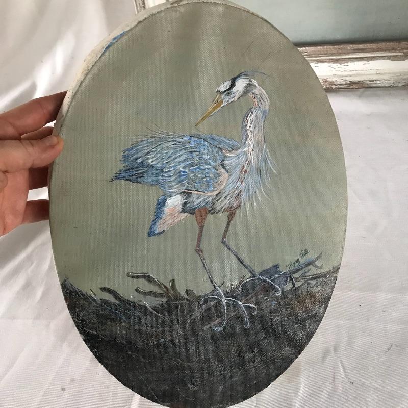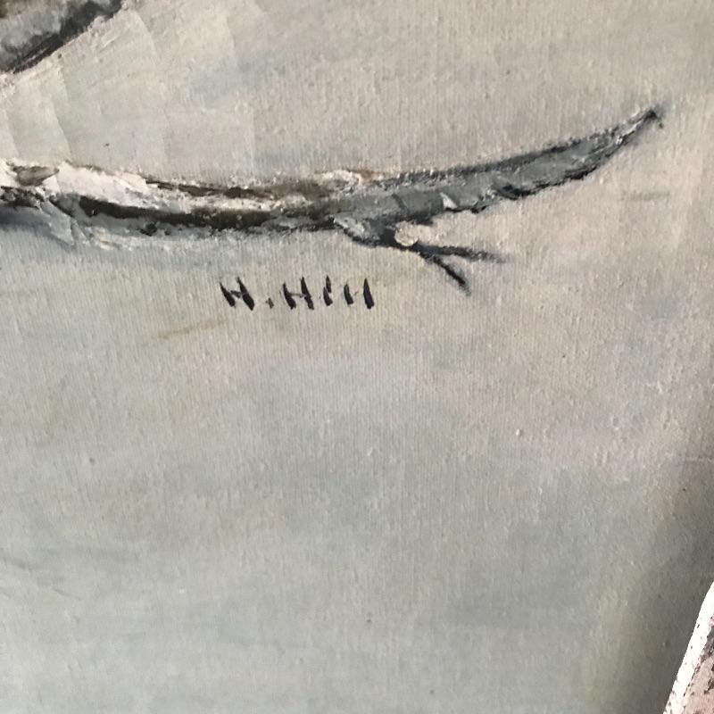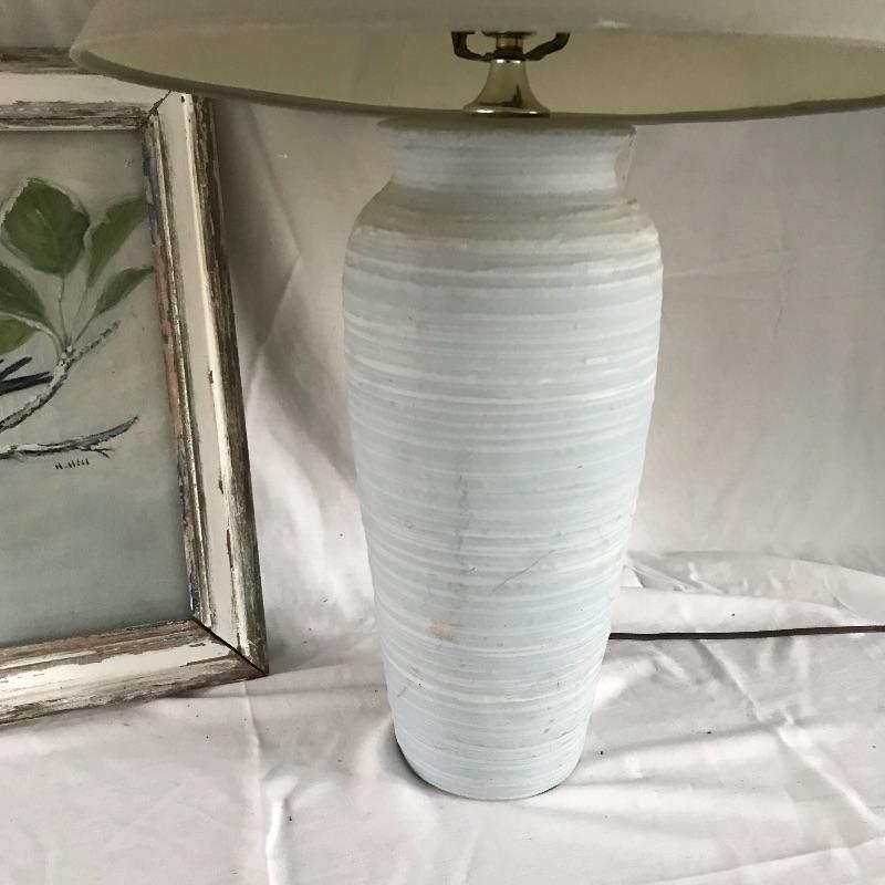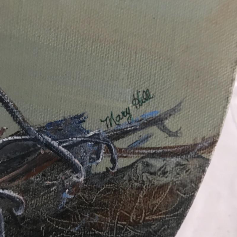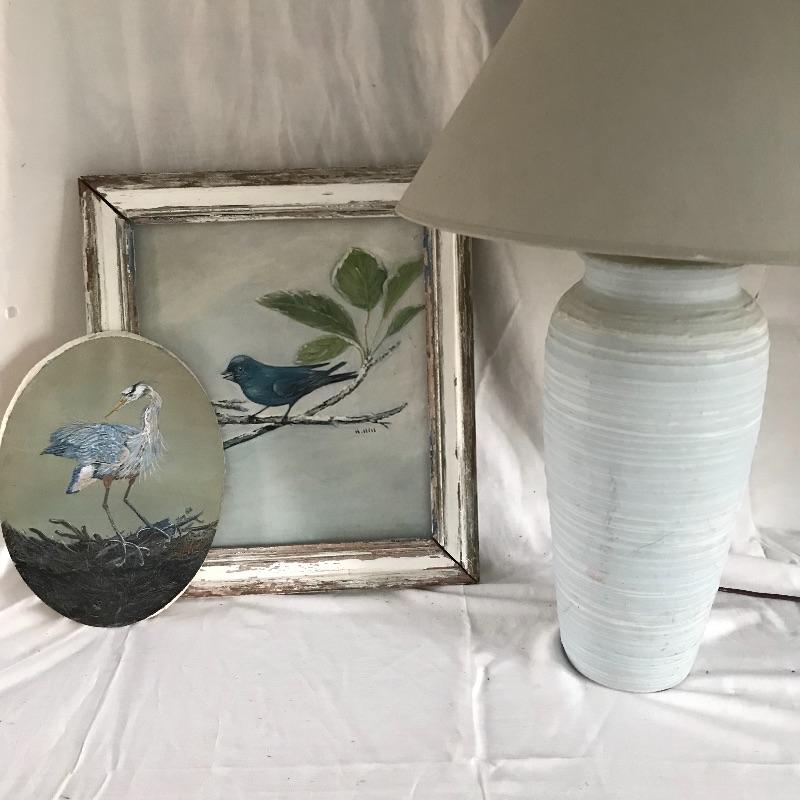 Lot includes two oil paintings and one lamp, all with similar light blue hues. Larger painting is approx. 18” x 16” and signed by Helen Hill. Smaller painting is approx. 12” tall and signed by Mary Hill. Lamp is approx. 28” tall. Local pickup only.