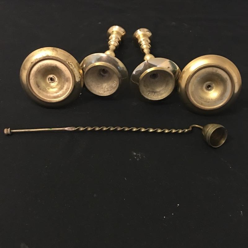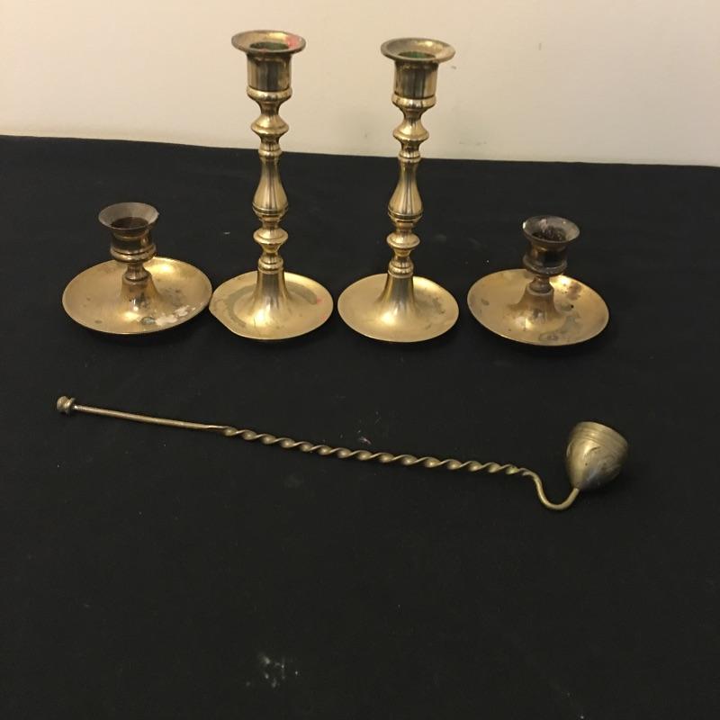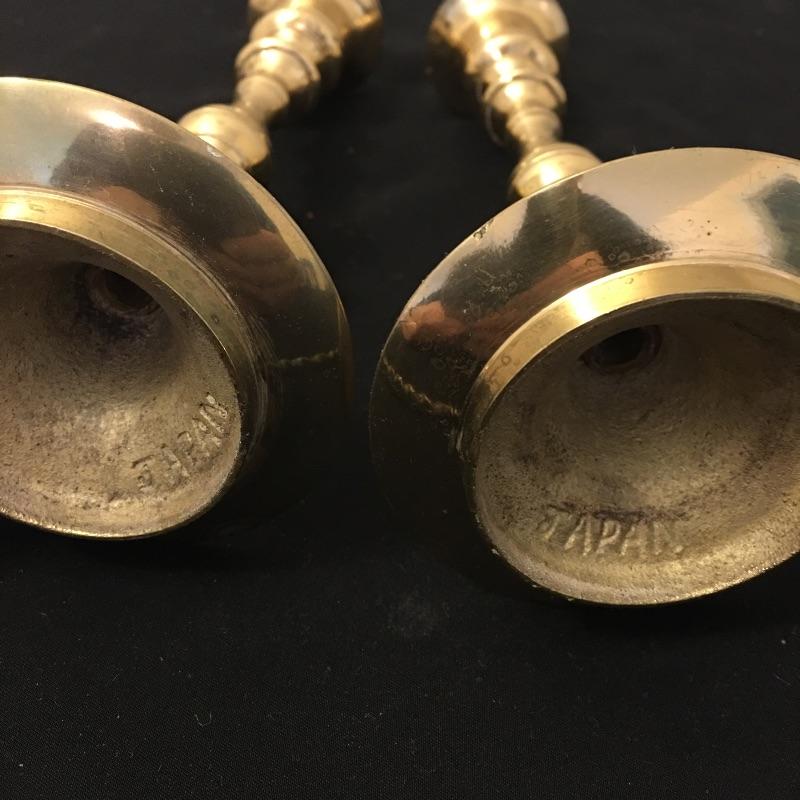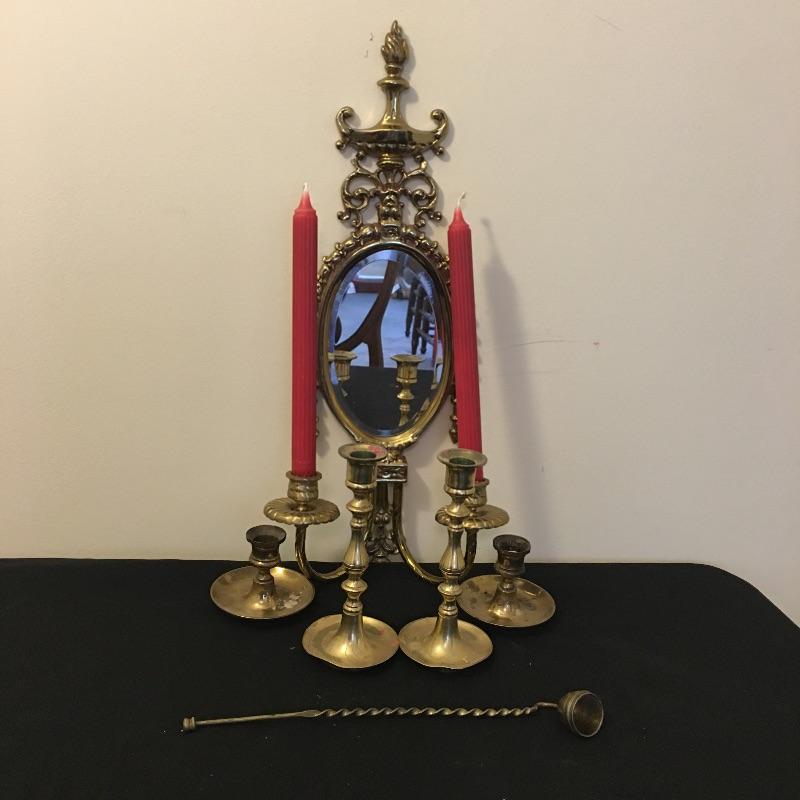Be ready for the power outages this year with this selection of candlesticks and wall sconce. Lot includes two short brass candlestick holders that are unmarked, two tall brass candlestick holders marked Japan, brass mirrored wall sconce candleholder and six candles. Wall sconce measures 4.75” x 9” x 22”.
