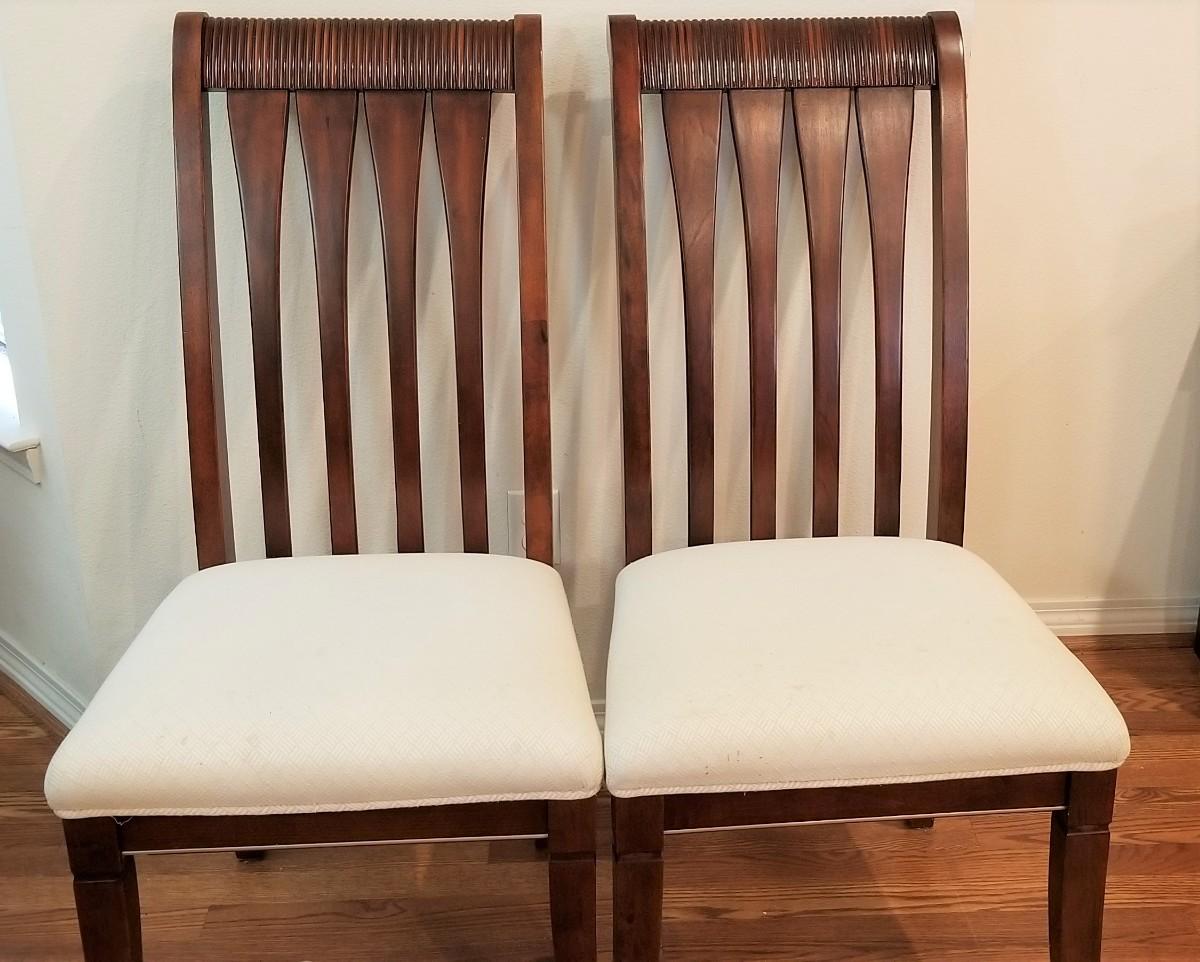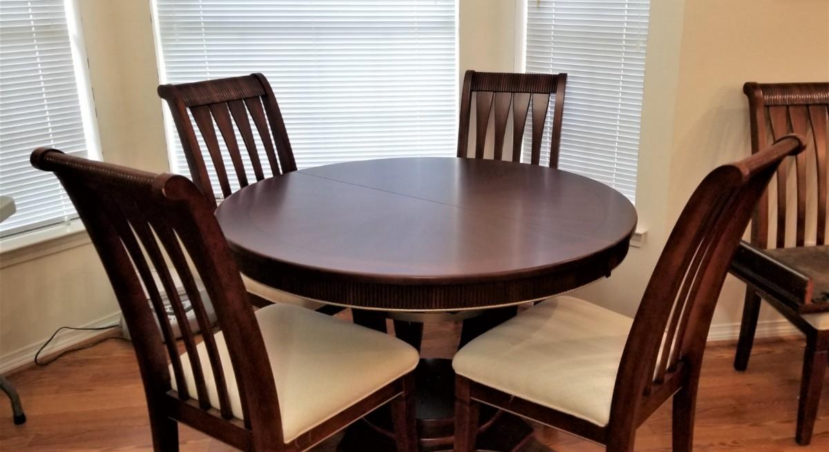 Very attractive contemporary dining set - table comes with one leaf (round to oval) and six slat back chairs. No maker noted. Chairs are 20.5" wide and 41" tall. Table measures 4 feet across without leaf - leaf adds another 18". Chair bottoms are upholstered - set has been used, so they could use a light clean.