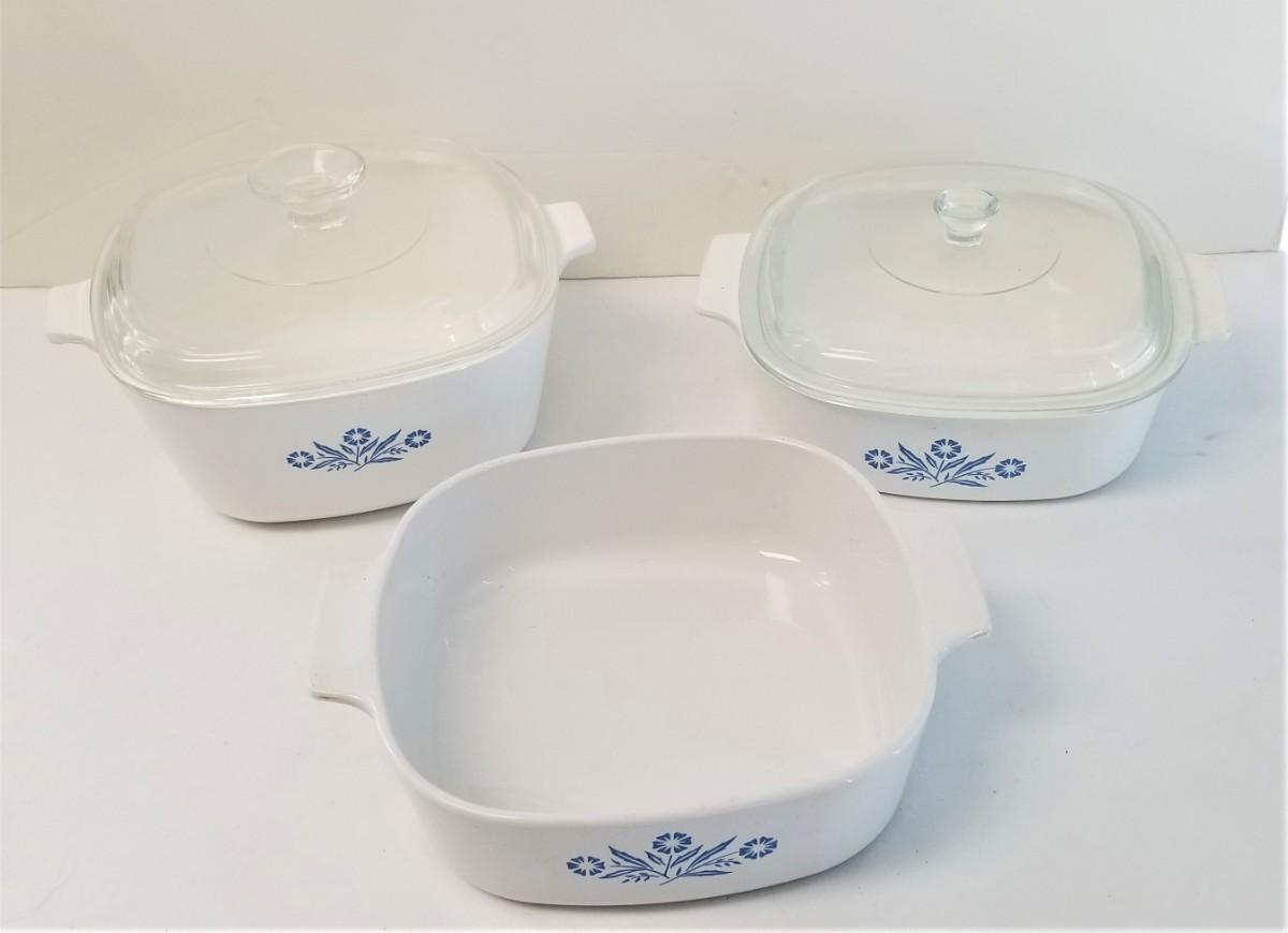 You get all you see here - three pieces of Cornflower Corning Ware - Two 2-quart casseroles (one has lid) and a 2.5 quart casserole with lid. Used condition.