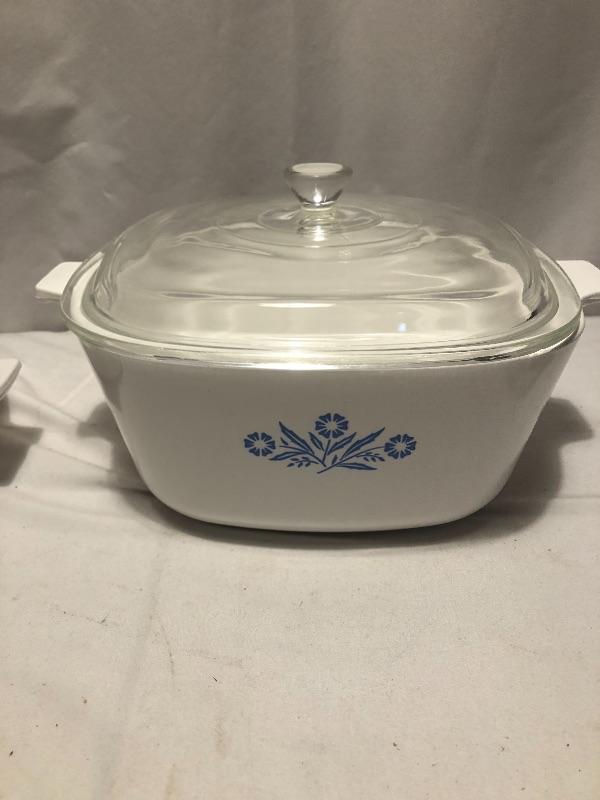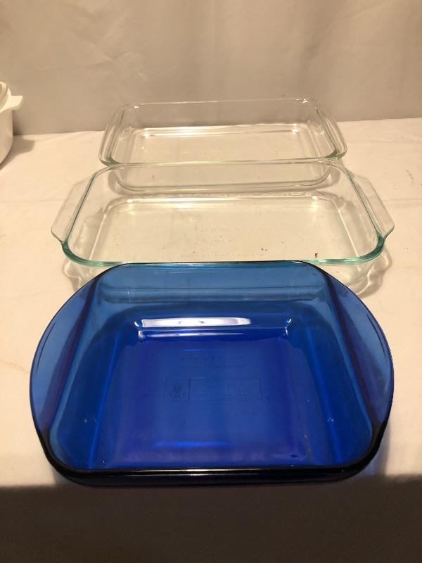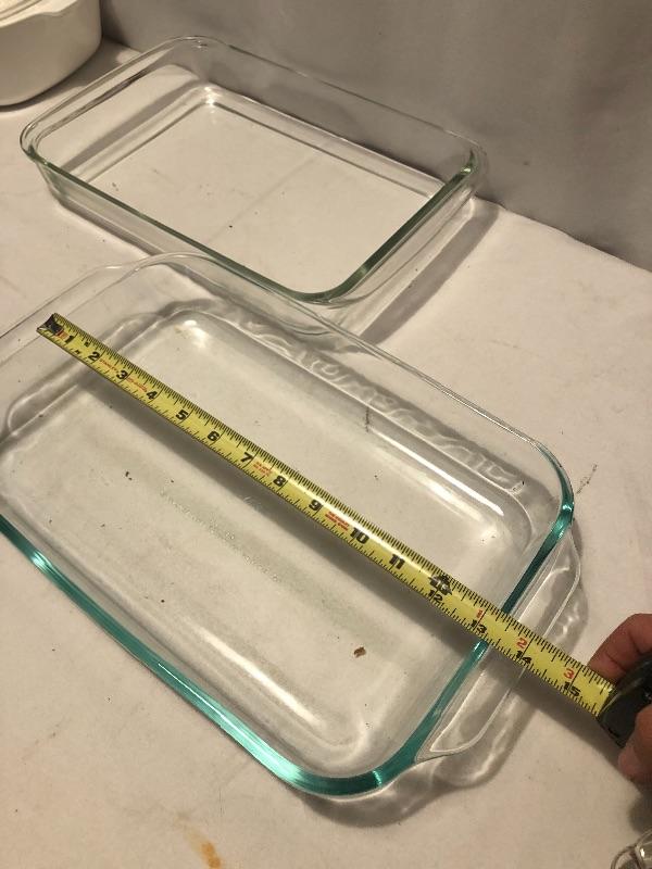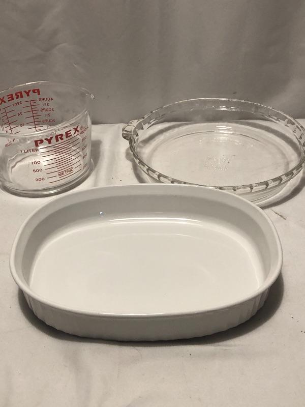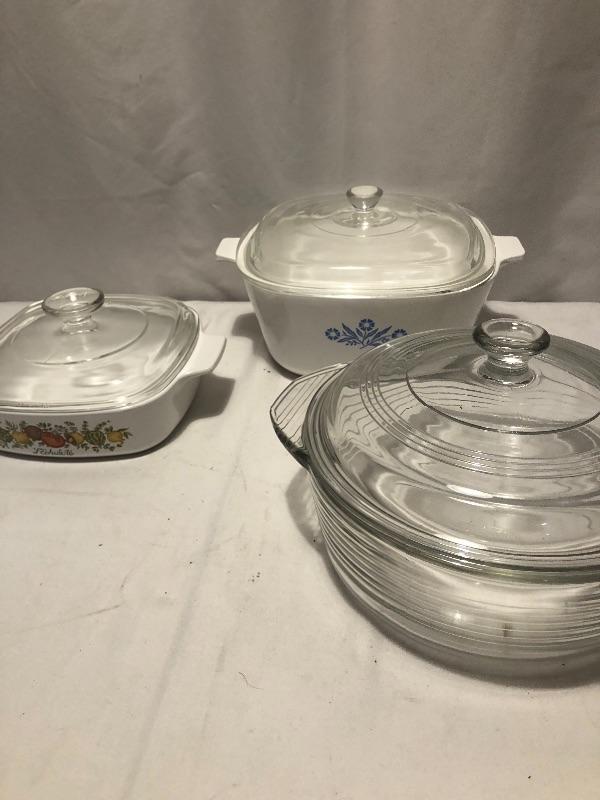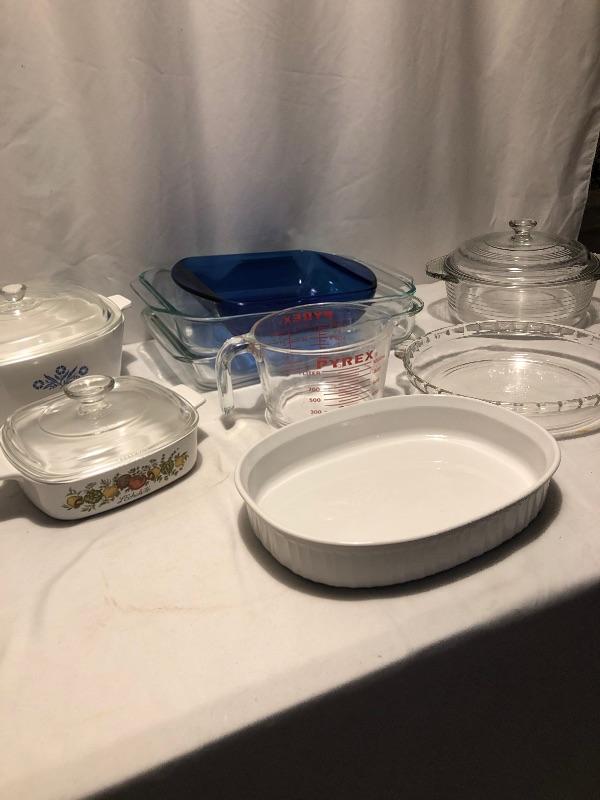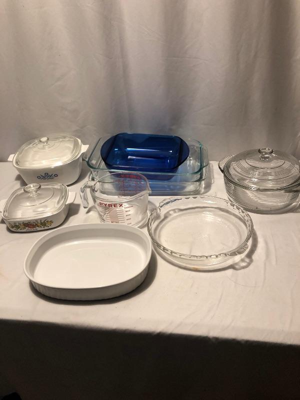 Every kitchen needs this lot! It includes two clear baking dishes, one blue baking dish, a 4 cup Pyrex glass measuring cup to corning ware covered dishes a pie dish and a serving dish. Local pick up only.