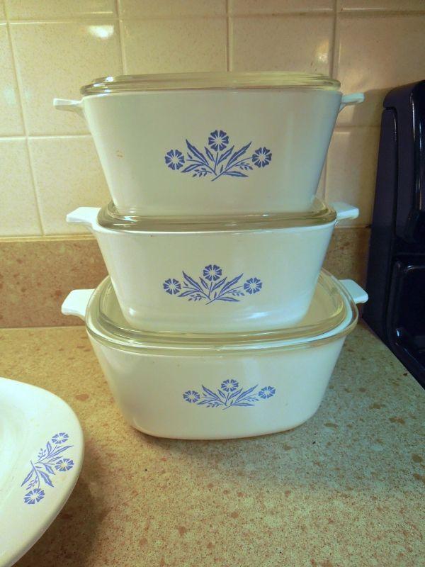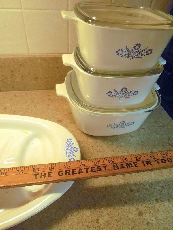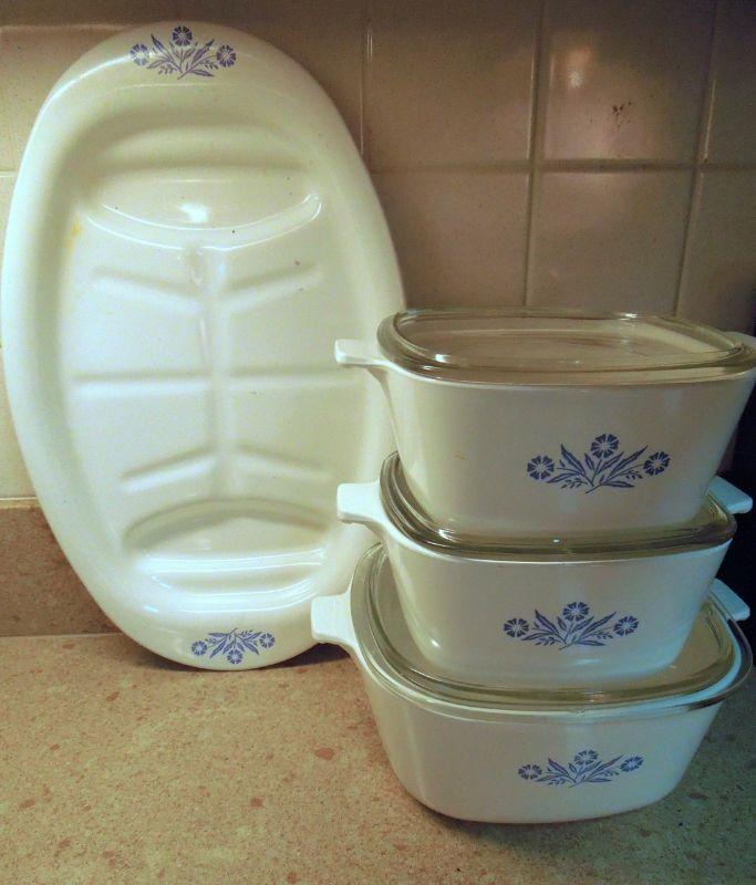 Two 1.75 quart covered casserole dishes; a 2.5 quart covered dish; and a 16" platter. No chips or cracks. Clean.