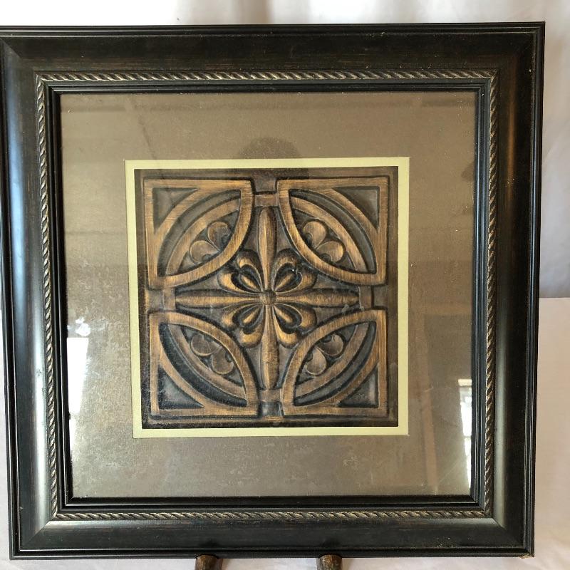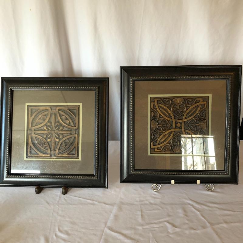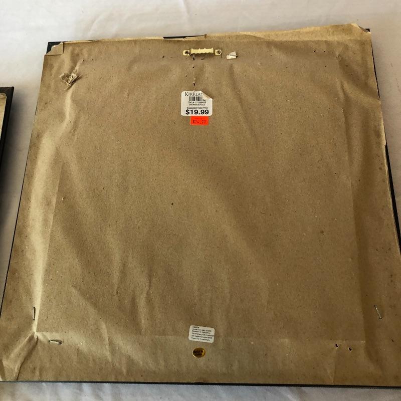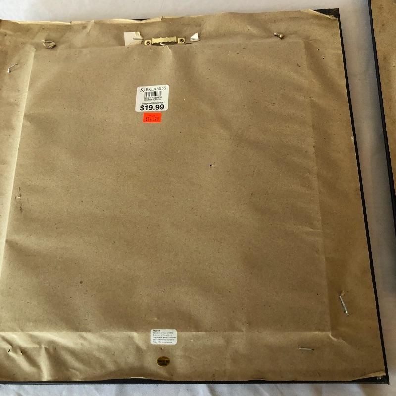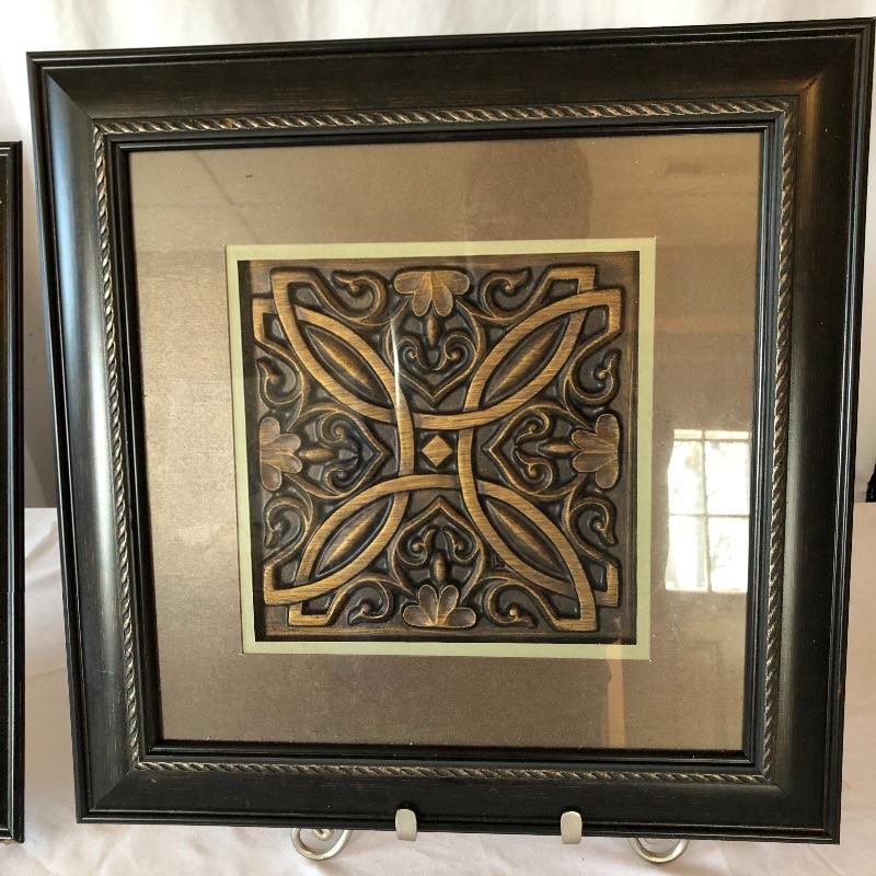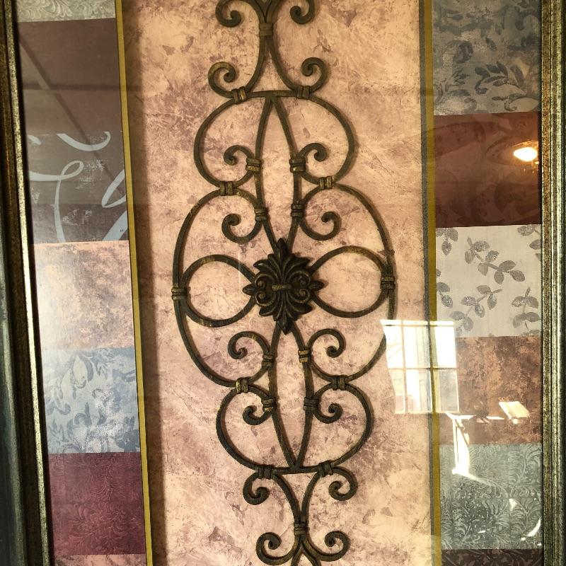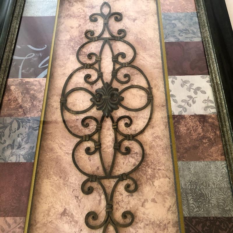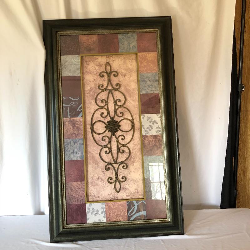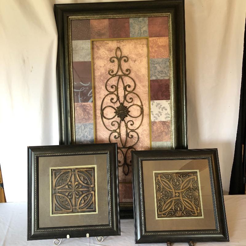 This grouping of metal and wood artwork will be an unique addition to your home. The decorative centerpiece of the large picture appears to be metal and measures 25” x 42”. It can be hung diagonally or horizontally. The two smaller complimentary pictures appear to have a wooden centerpiece and measures 15.5” X 15.5”. Local pick up only.