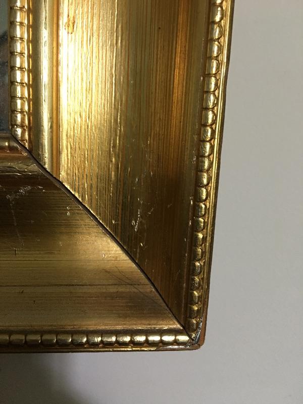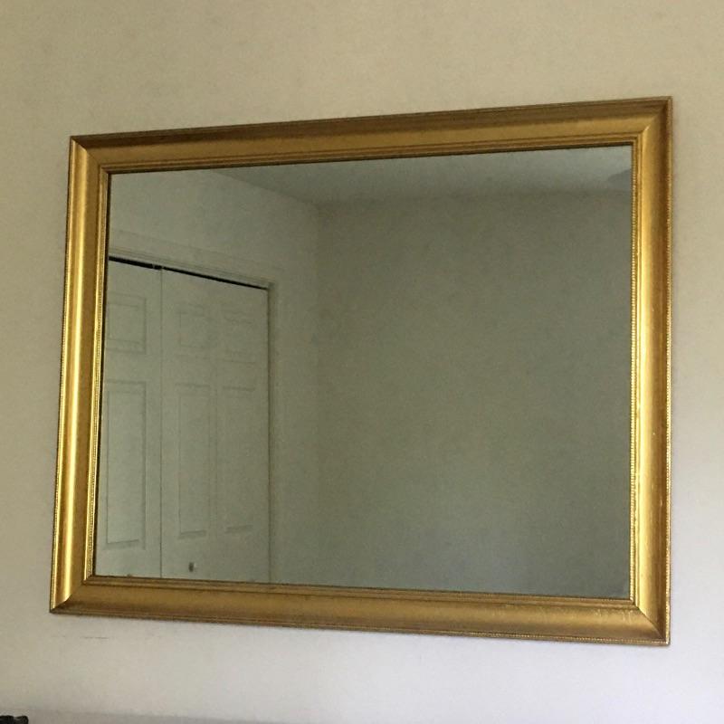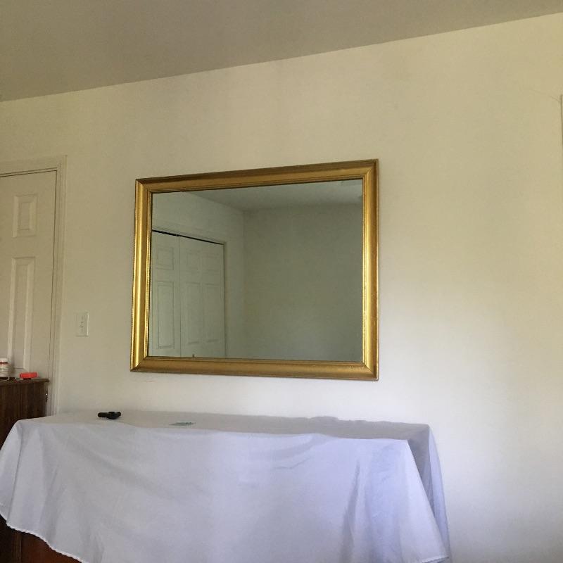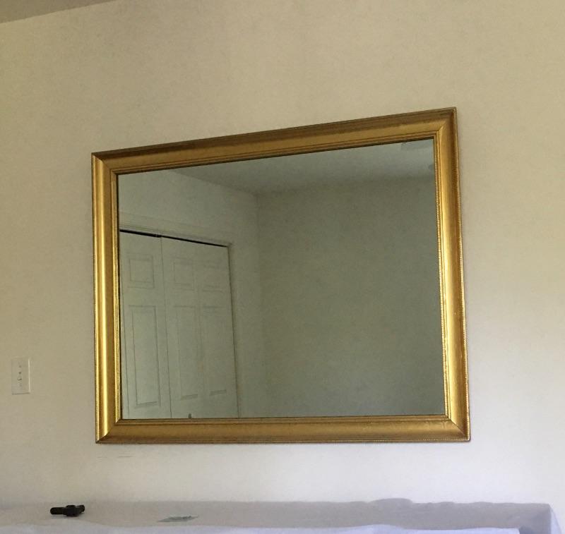 The best way to add square footage to a room is a beautiful mirror! Large gold framed mirror will add style and function to any room in your home. Frame measures 35.5” x 45”.