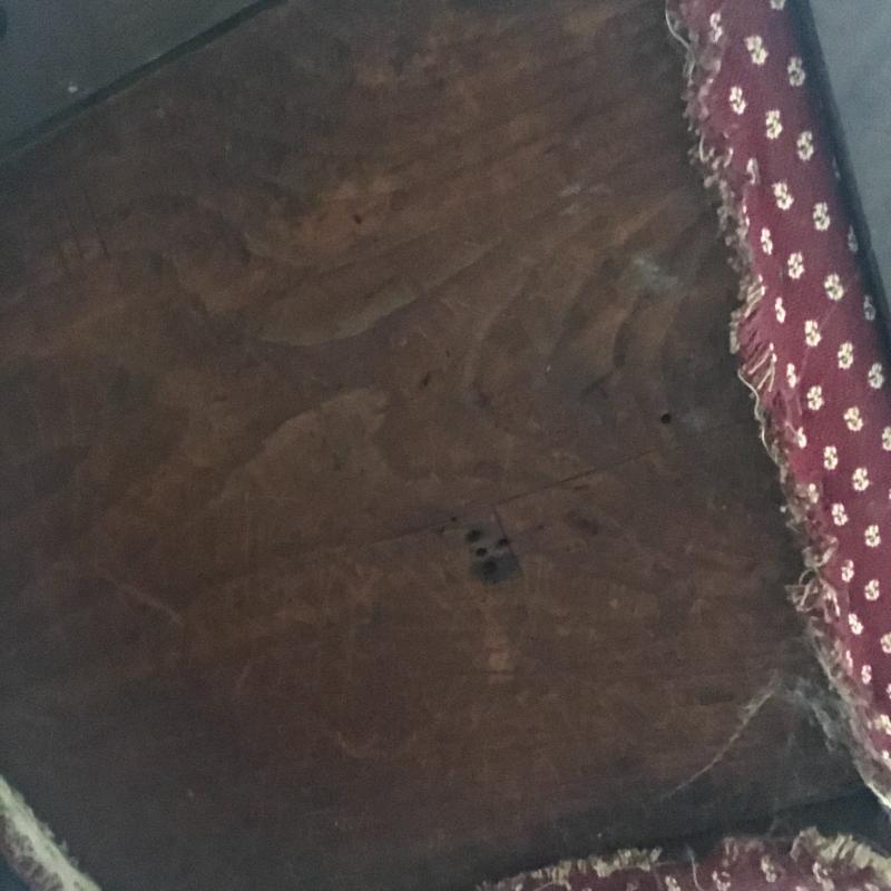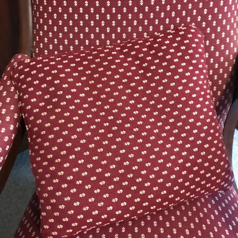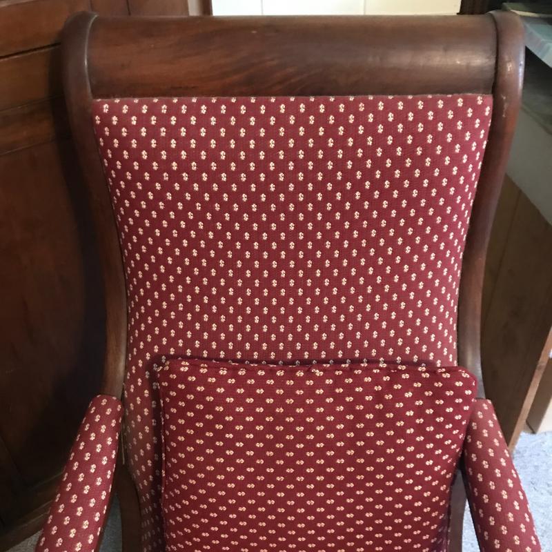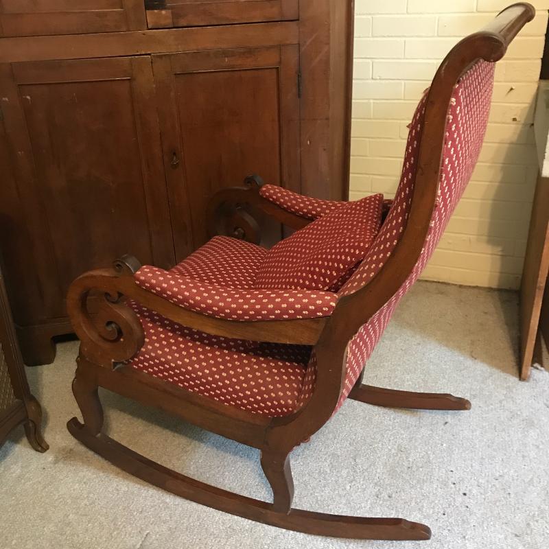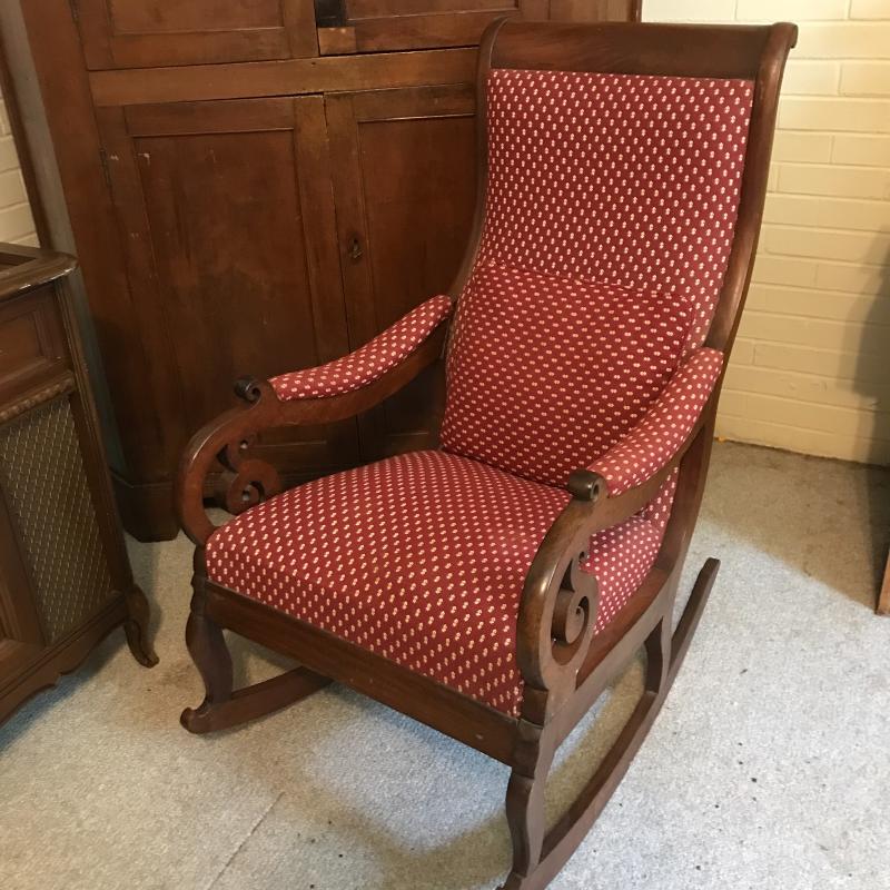 The curved wood lines on this rocking chair are a piece of art. The wood and fabric are in great condition. Includes a matching pillow. The springs are a bit pokey when sitting on the seat although they are covered well with the fabric. No shipping. Measures 23” x 33” x 39.5”