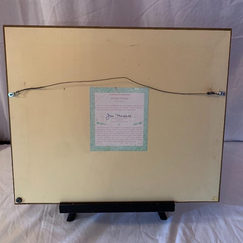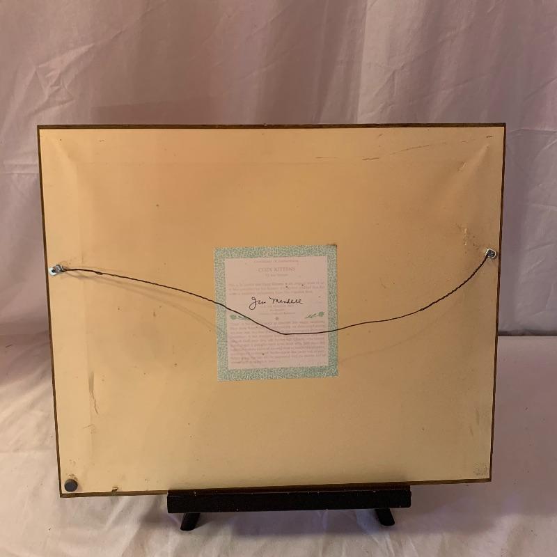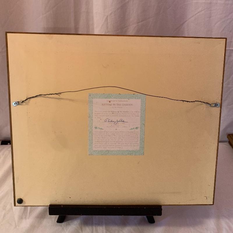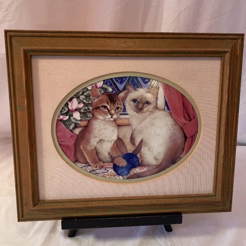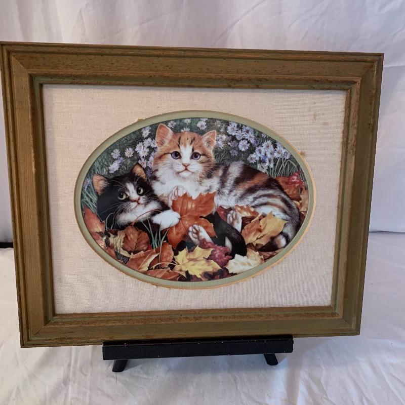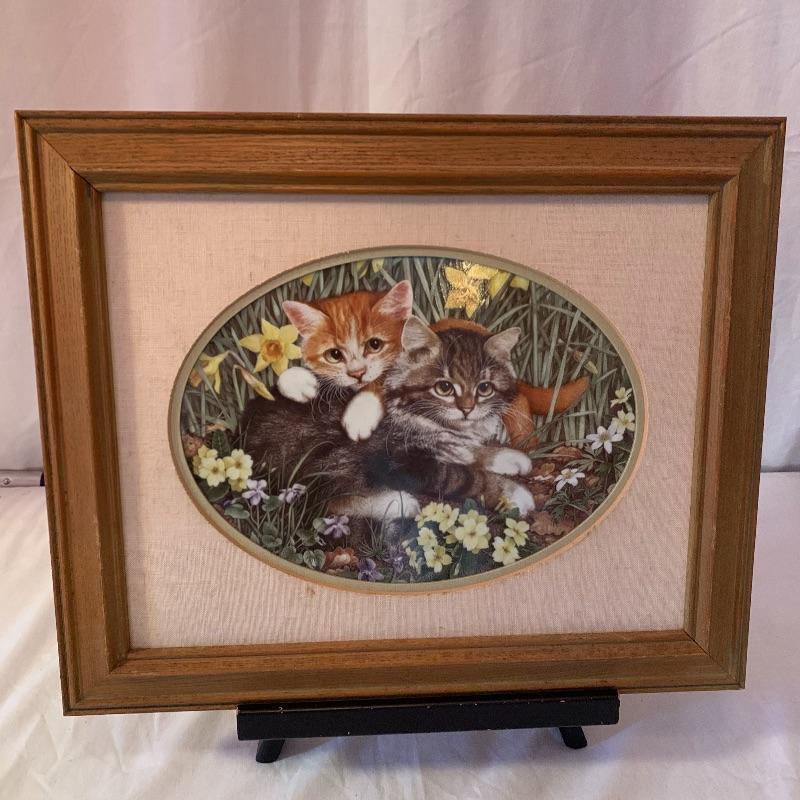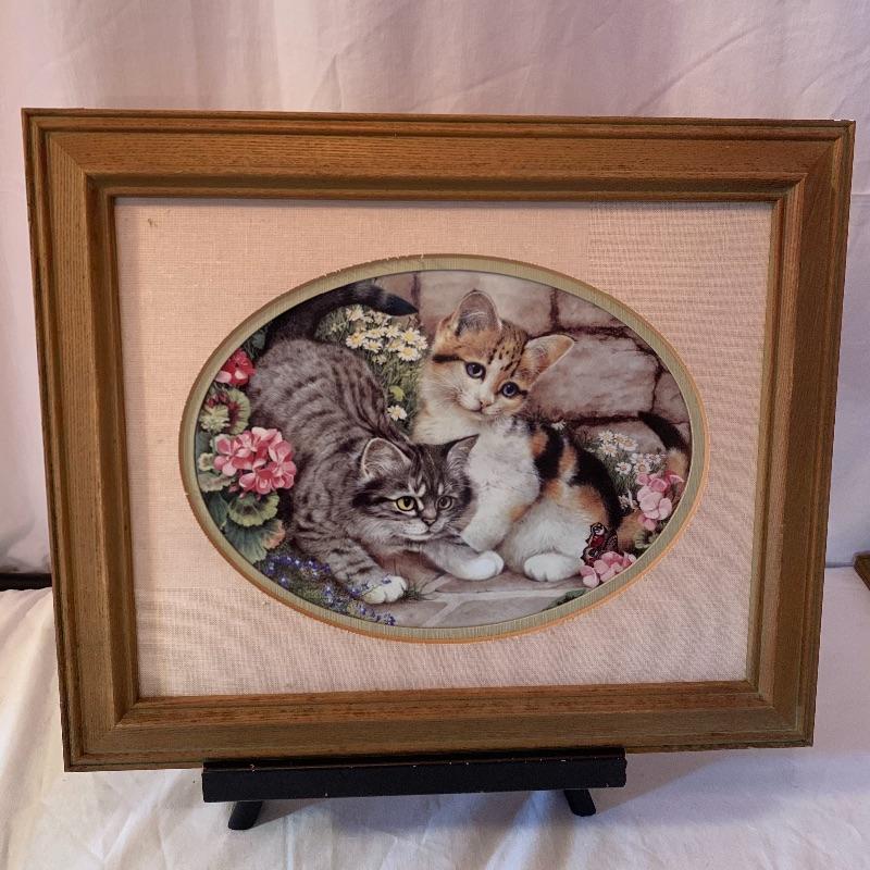 This lot includes 4 framed and mated Jan Huston cat art pieces and two cat figurines. Included in the cat art pieces are “Cozy Kittens”, “Kittens in the Garden”, “Captivated Kittens”, and “Kitten Frolic”. The art pieces are made out of porcelain and have certificates of authenticity. They all measure about 17in x 14in. There is one cat figurine made by Anna-Perenna Porcelain and is named “Oliver’s Birthday”. It is numbered 275/5000. The other cat figurine is made by Arden Sculptures. Local pick up only.