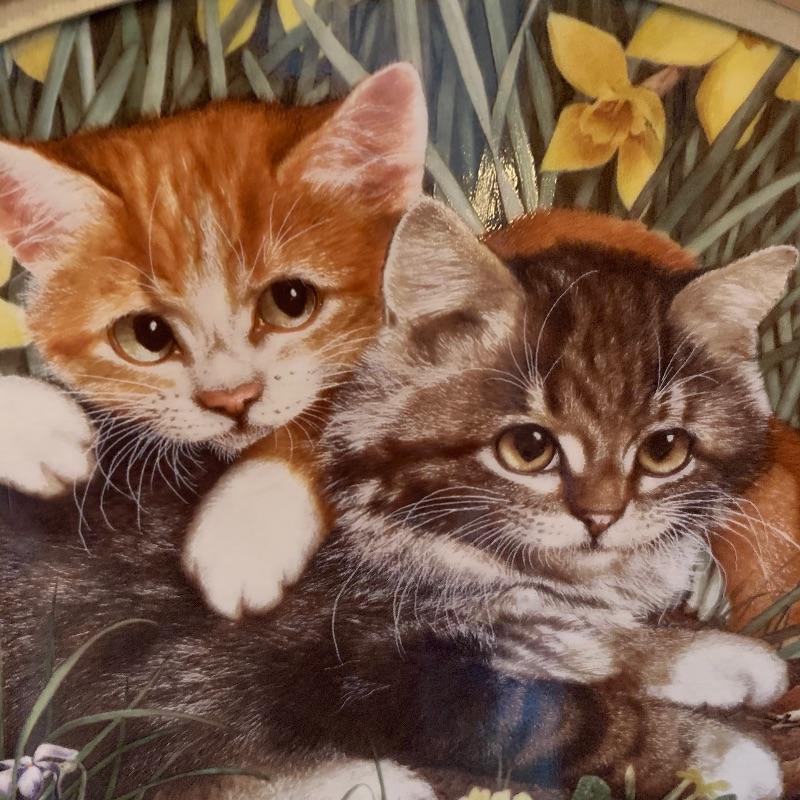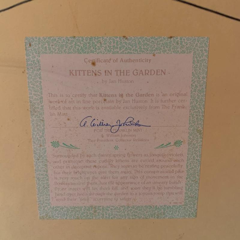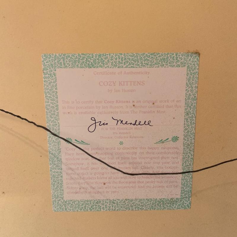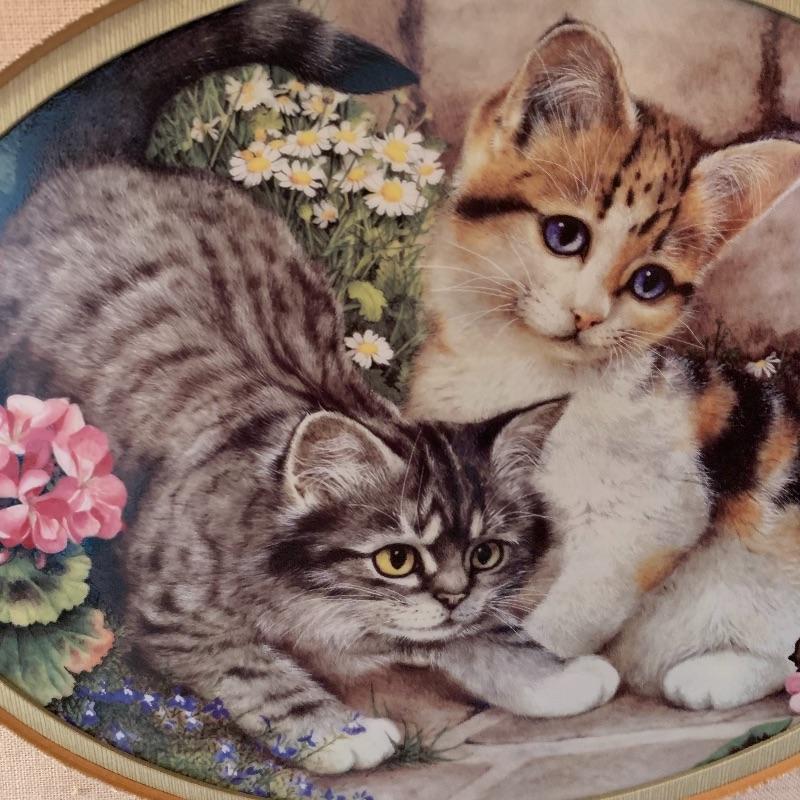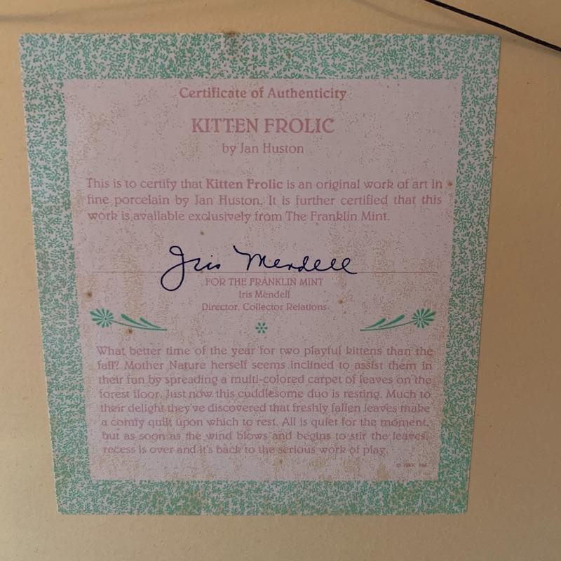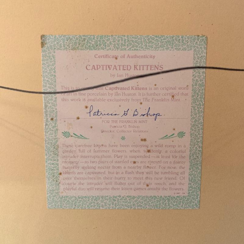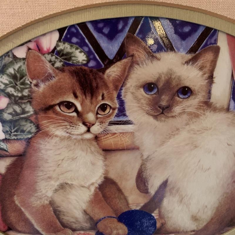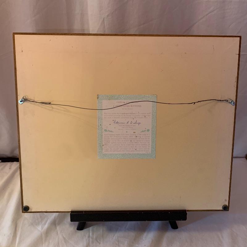 This lot includes 4 framed and mated Jan Huston cat art pieces and two cat figurines. Included in the cat art pieces are “Cozy Kittens”, “Kittens in the Garden”, “Captivated Kittens”, and “Kitten Frolic”. The art pieces are made out of porcelain and have certificates of authenticity. They all measure about 17in x 14in. There is one cat figurine made by Anna-Perenna Porcelain and is named “Oliver’s Birthday”. It is numbered 275/5000. The other cat figurine is made by Arden Sculptures. Local pick up only.
