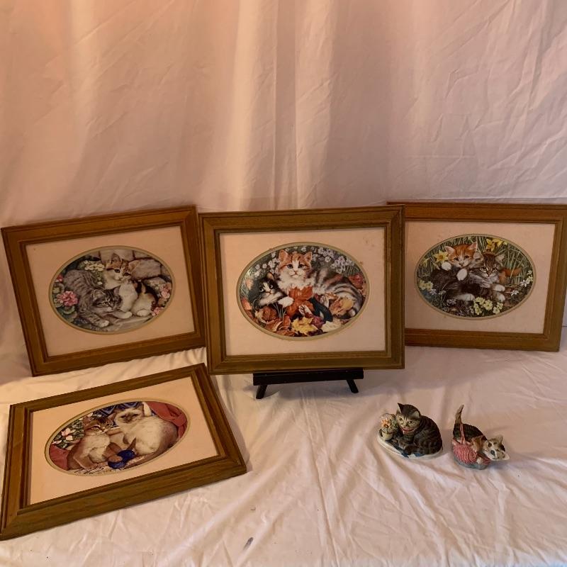 Lot 163 - Jan Huston 4 Framed Cat Pictures with Pair of Figurines