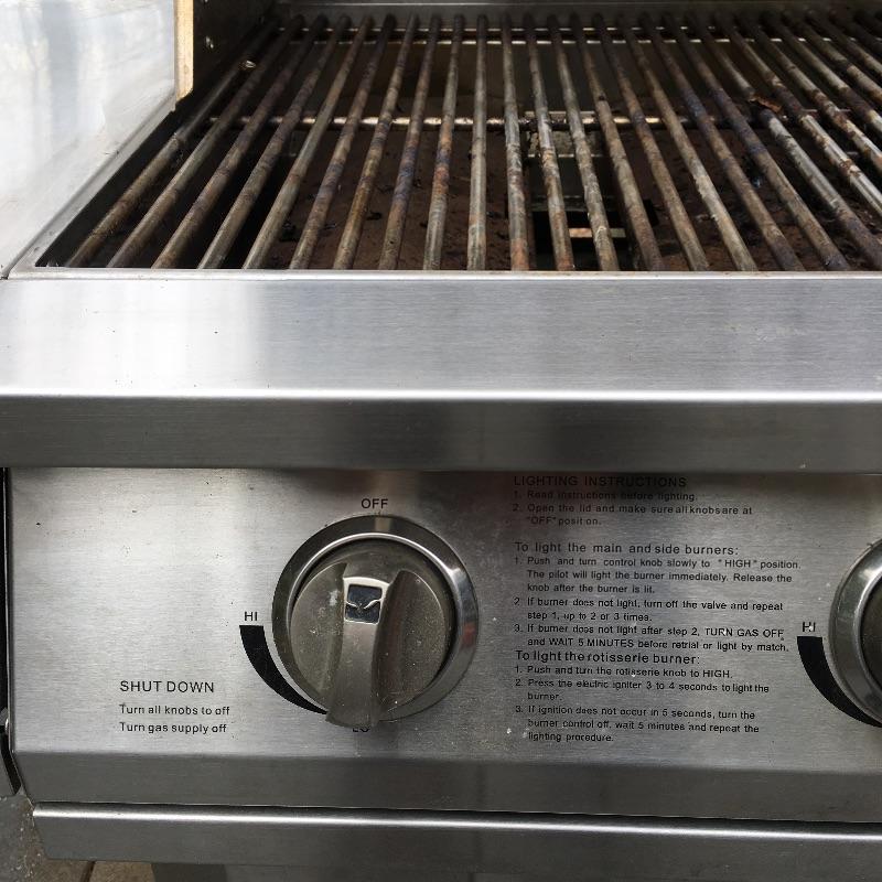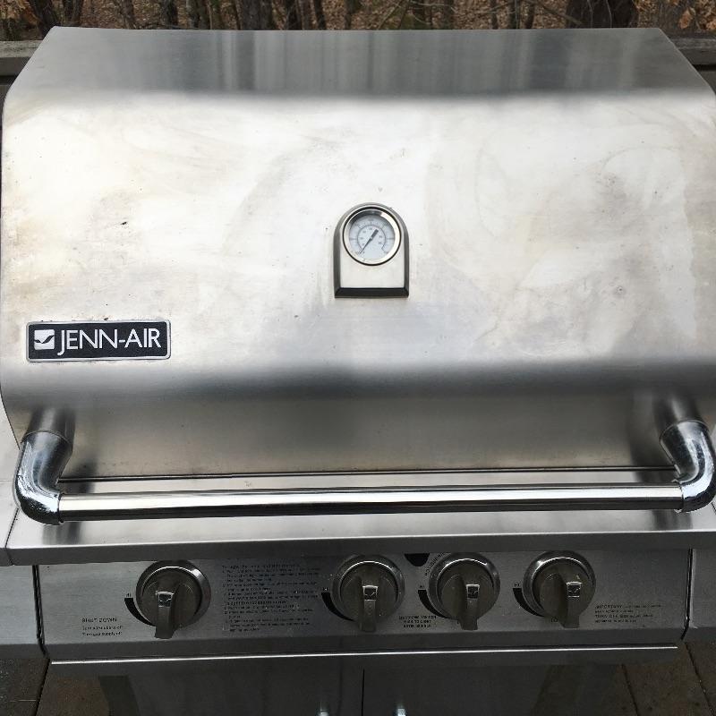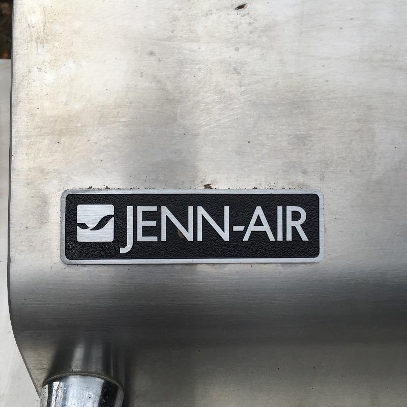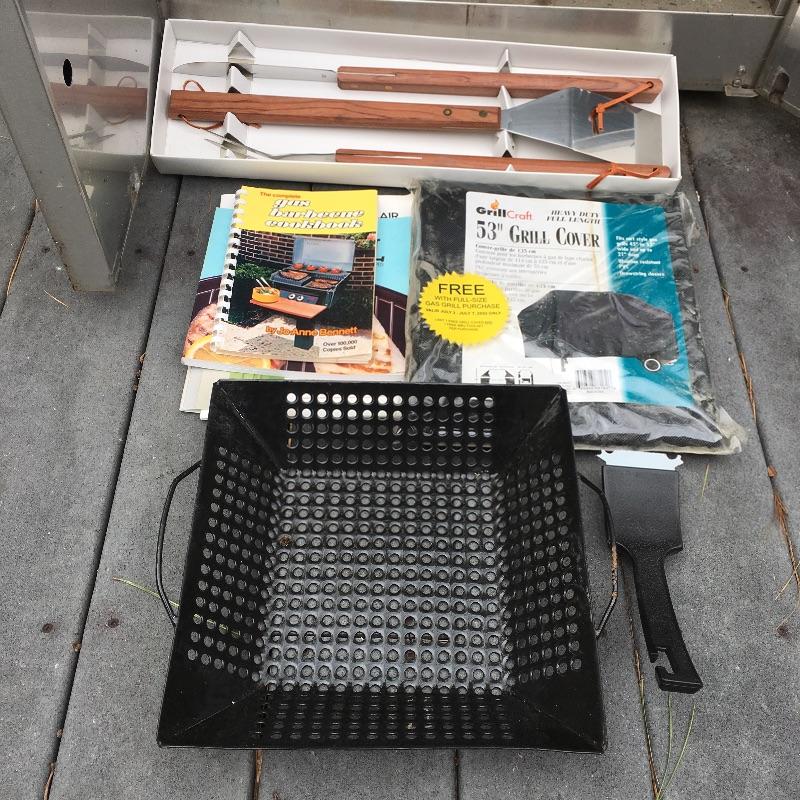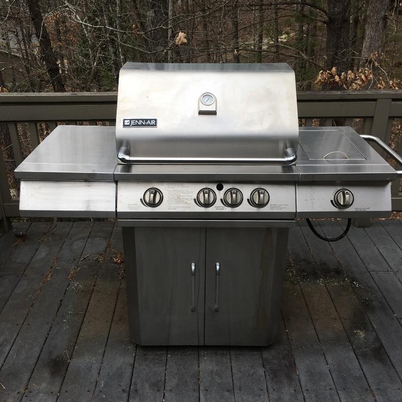 Jenn-Air grill. Grill comes with Brookstone BBQ utensils, vegetable tray, new and old cover. The grill has side burner with cabinet underneath. Grill was not tested as there is no gas tank. The cooking surface is dirty and may have rust, it is hard to tell as it is quite dirty. All hoses and attachments seem in good shape though. Grill measures 23” x 55” x 48”.