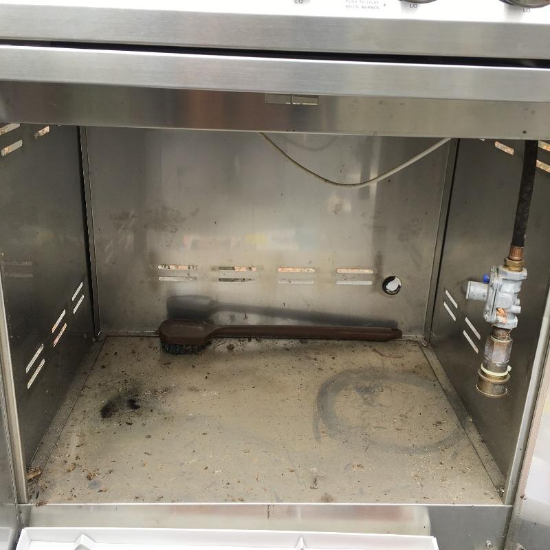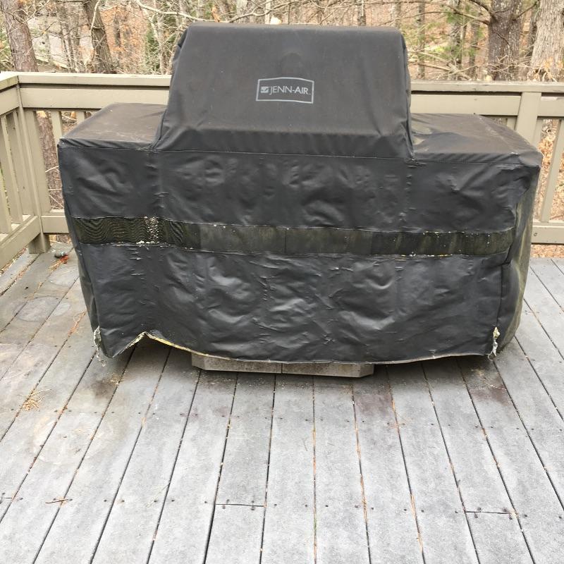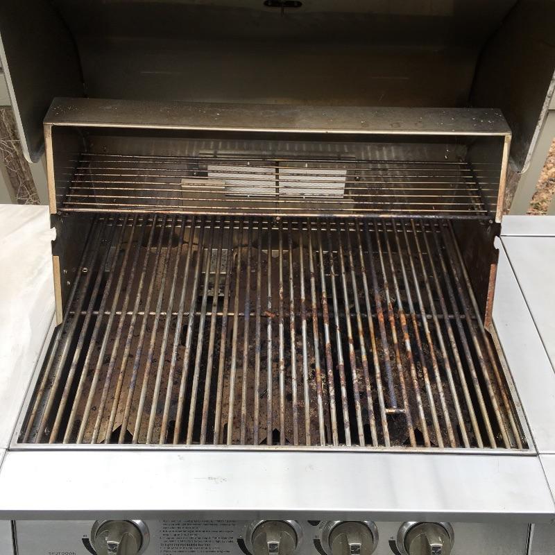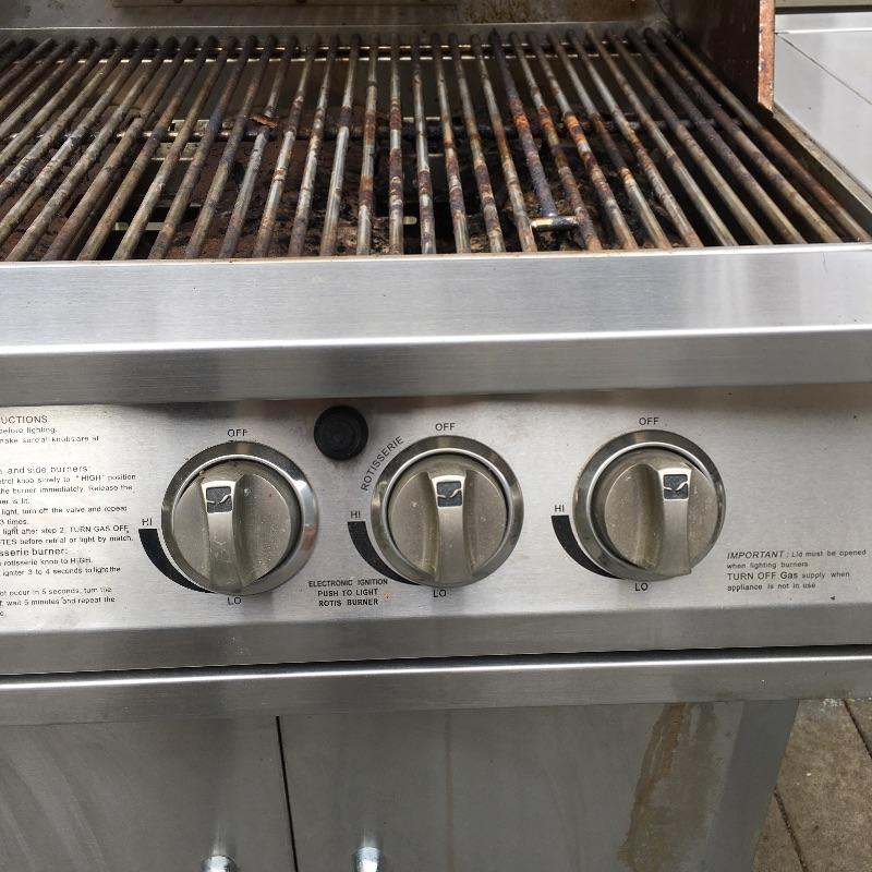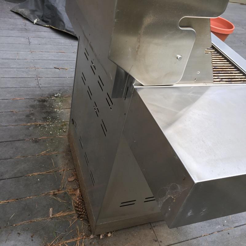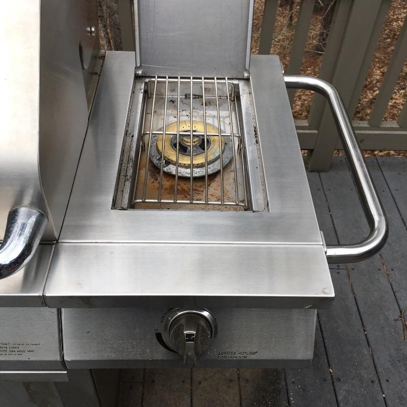 Jenn-Air grill. Grill comes with Brookstone BBQ utensils, vegetable tray, new and old cover. The grill has side burner with cabinet underneath. Grill was not tested as there is no gas tank. The cooking surface is dirty and may have rust, it is hard to tell as it is quite dirty. All hoses and attachments seem in good shape though. Grill measures 23” x 55” x 48”.
