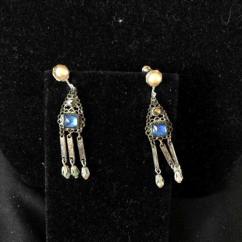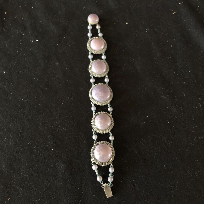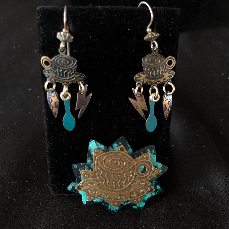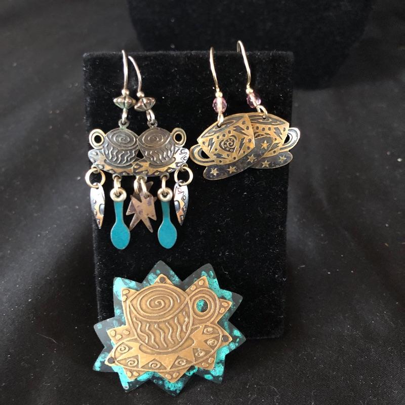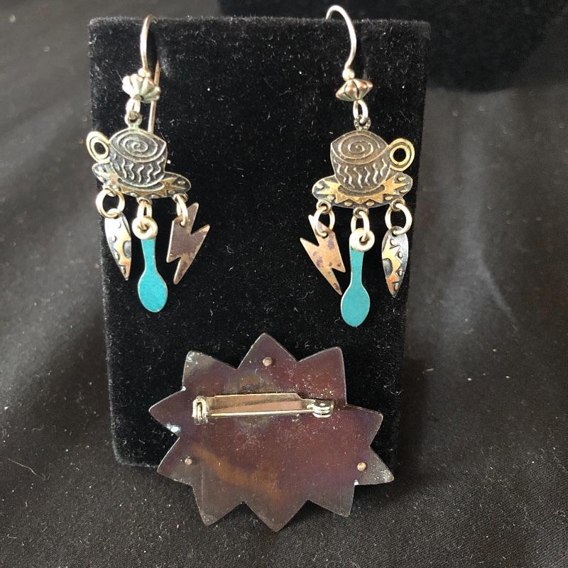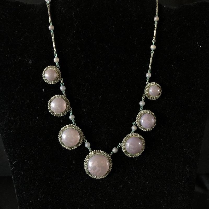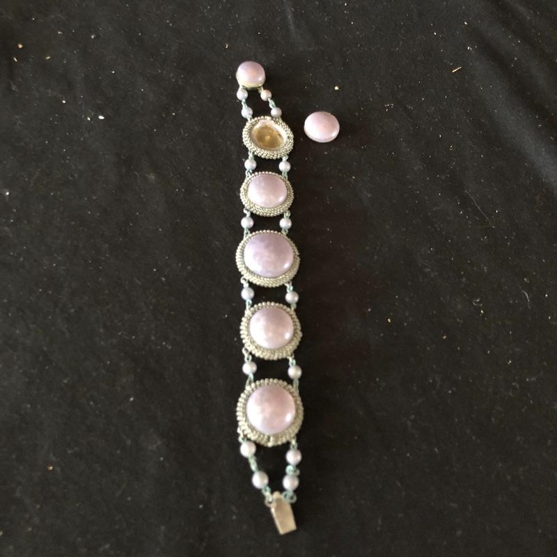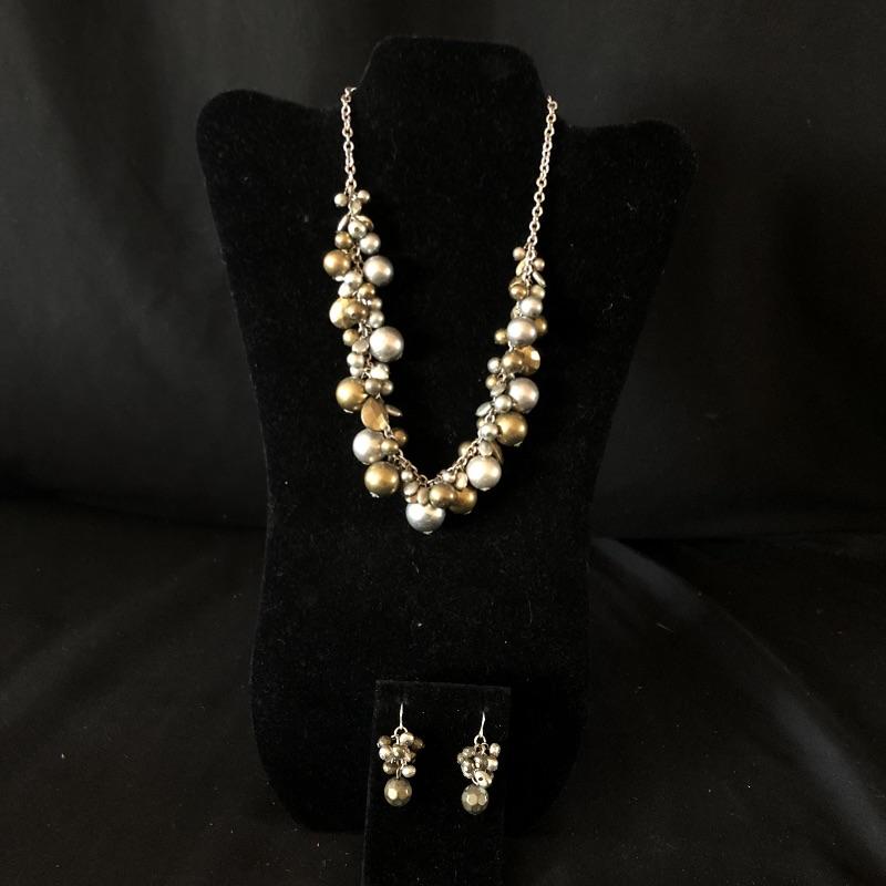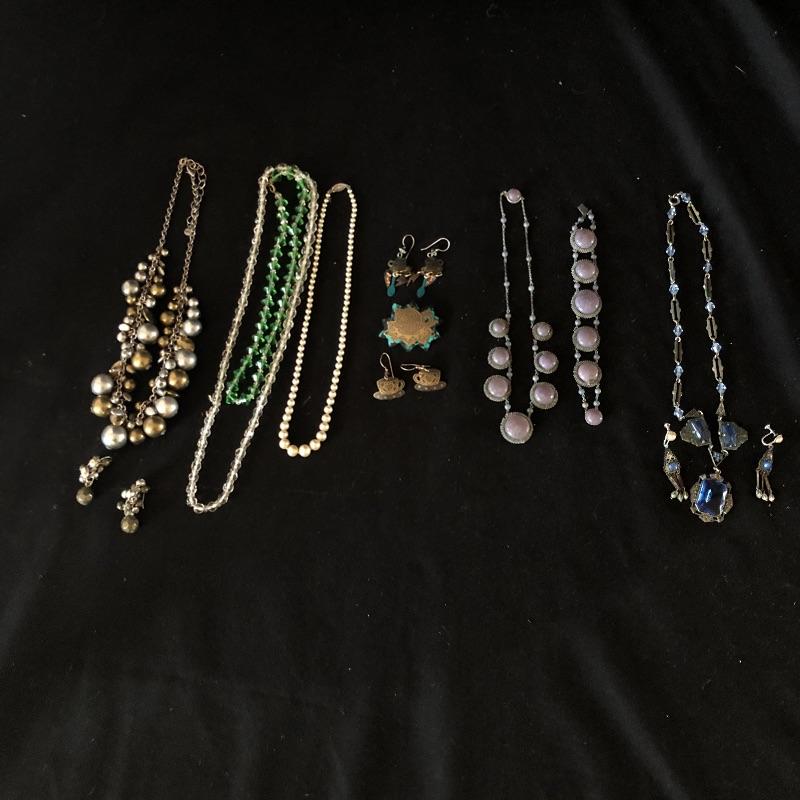 A lovely array of jewelry sets. Lot includes silver colored earrings and necklace with sapphire colored stones, necklace and bracelet with mauve colored stones, bracelet has one loose stone. Also includes coffee themed set wit two pair of earrings and pin, diver and gold colored ball necklace and earrings, two beaded necklaces in clear and emerald color and a faux pearl necklace.