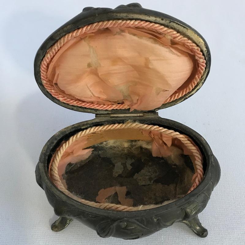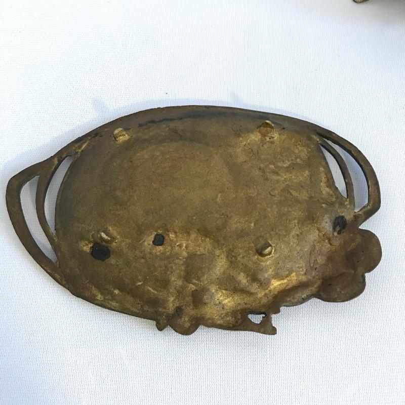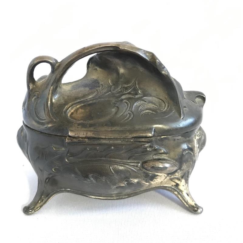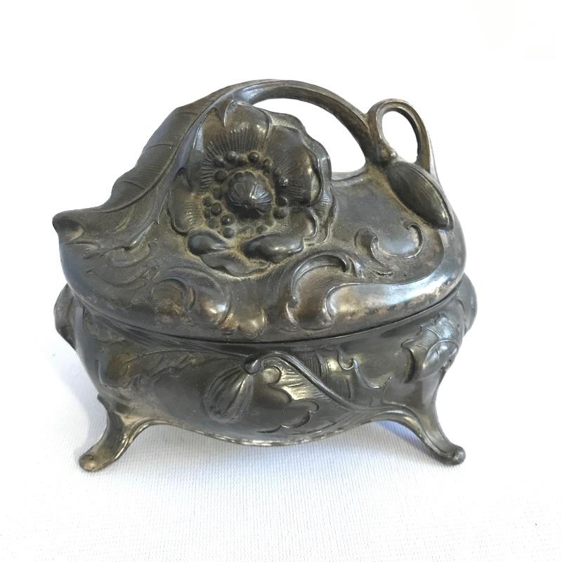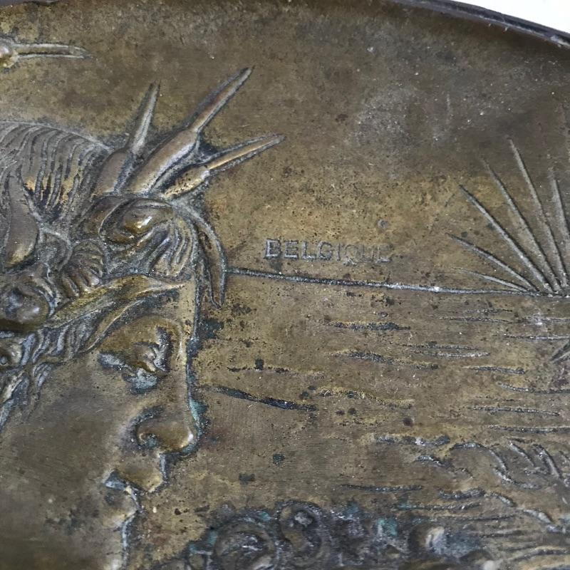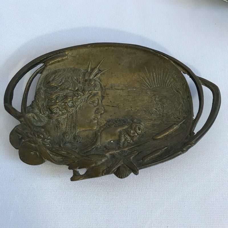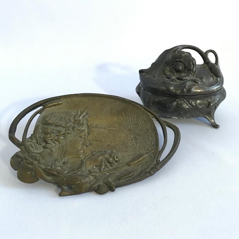 Two stunning metal pieces for your viewing and purchasing pleasure. First an intricate plate featuring a water goddess ocean theme. Plate is marked Belgique. It measures approximately 7.5” x 5” and appears to be a heavy metal. Next in our line up is a Jennings Brothers’ vintage art nouveau vanity box. Piece is marked JB and 1082 with flowing flowers and foliage. Inner lining shows age and character. See photos.