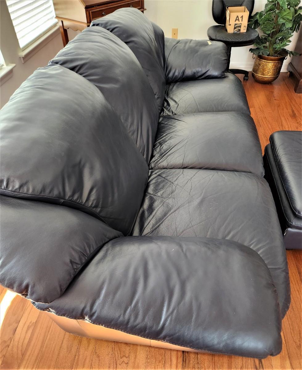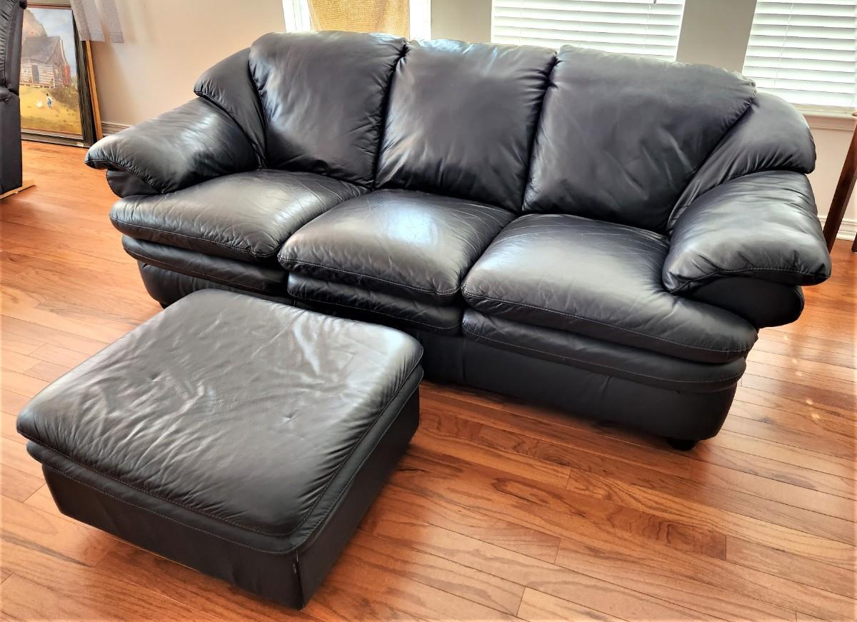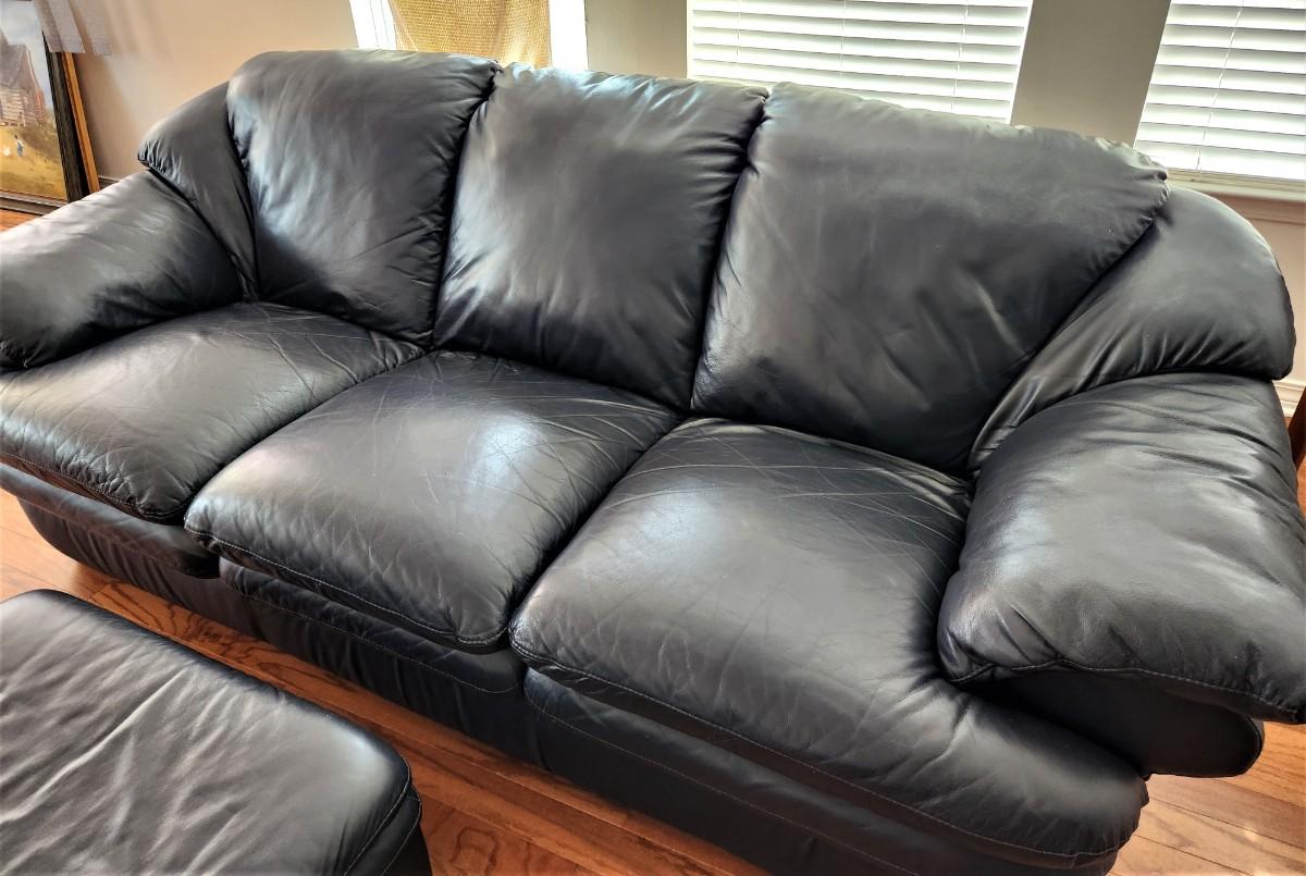 Very comfy - navy blue leather sofa and matching ottoman - finished all the way around (sign of quality). Good gently used condition. Ottoman is 29" x 24", 14" tall. Sofa is 3 feet tall at the back, 34" deep, 80" across - long enough to stretch out on.