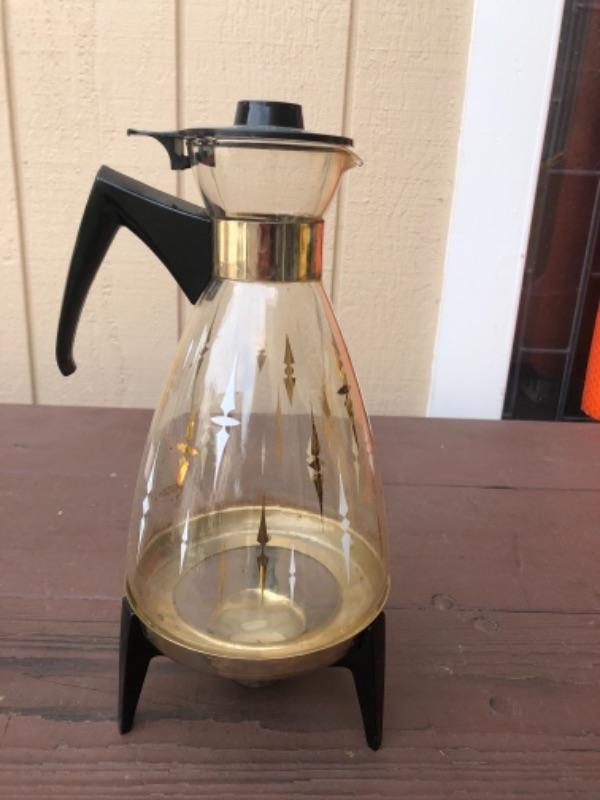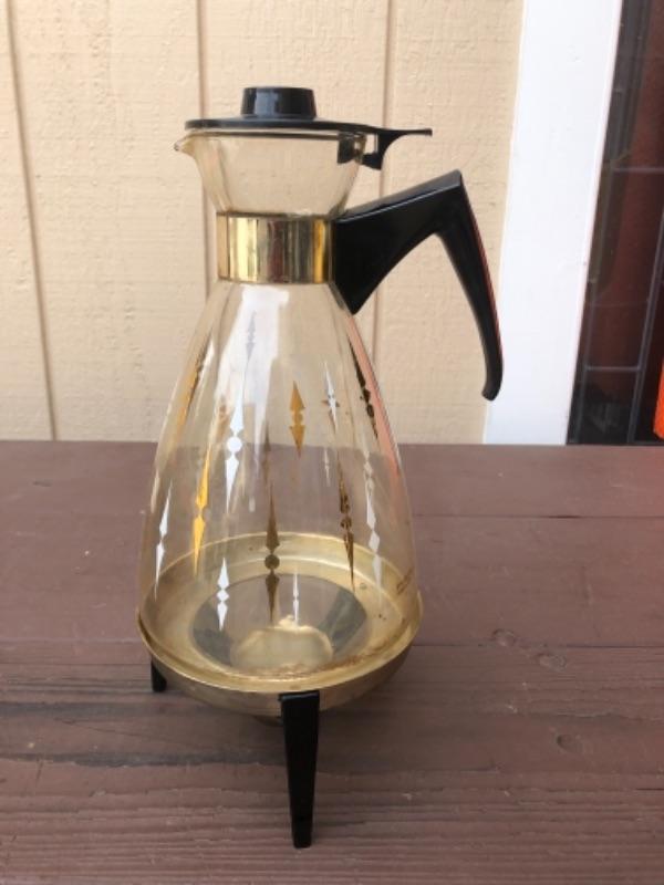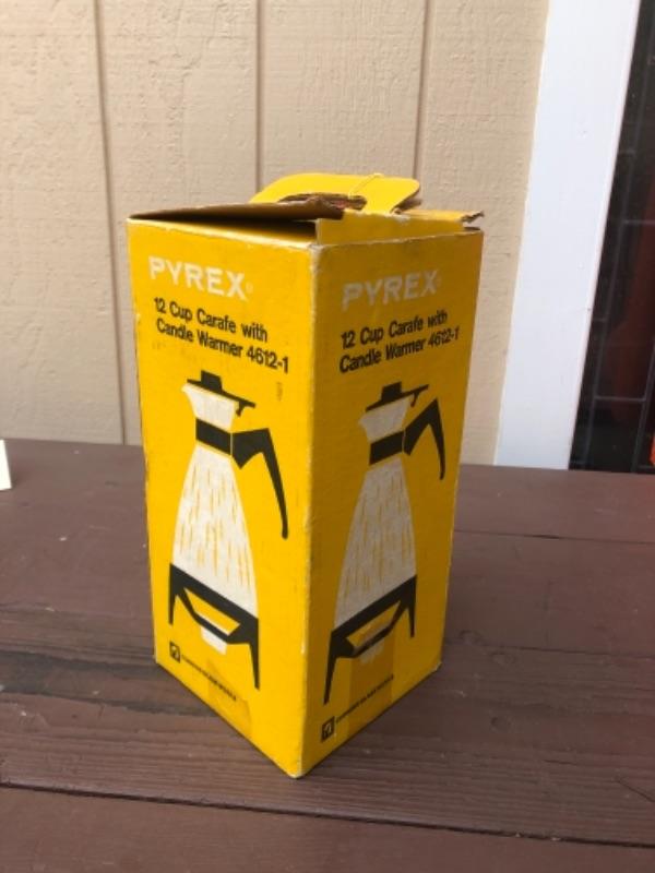 Lot 163: Pyrex Carafe: 12 Cup With stand, Boxed, Gold and White Diamond Ogees, 1950-60’s