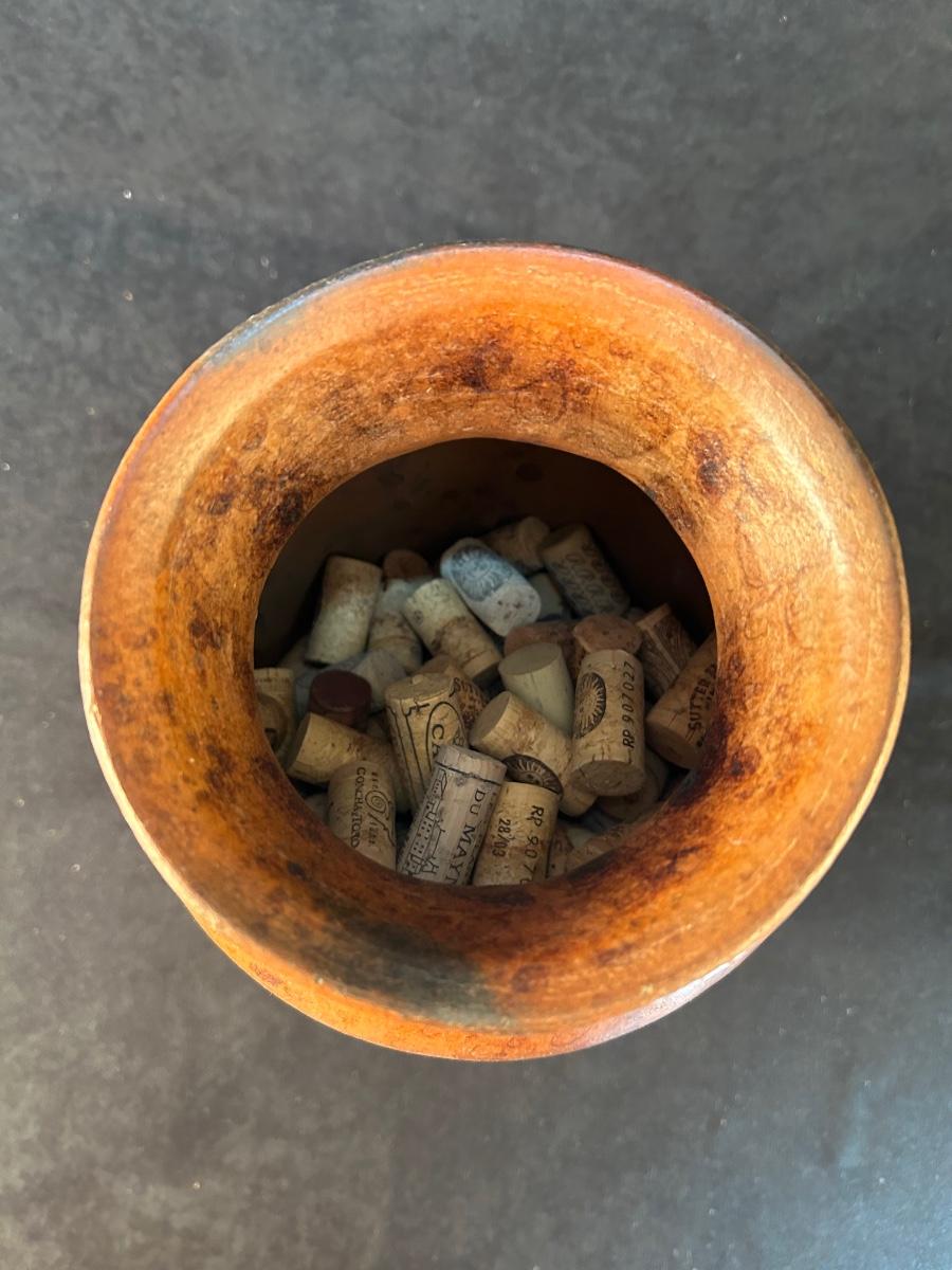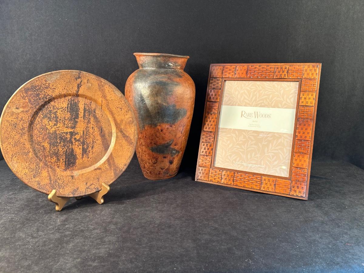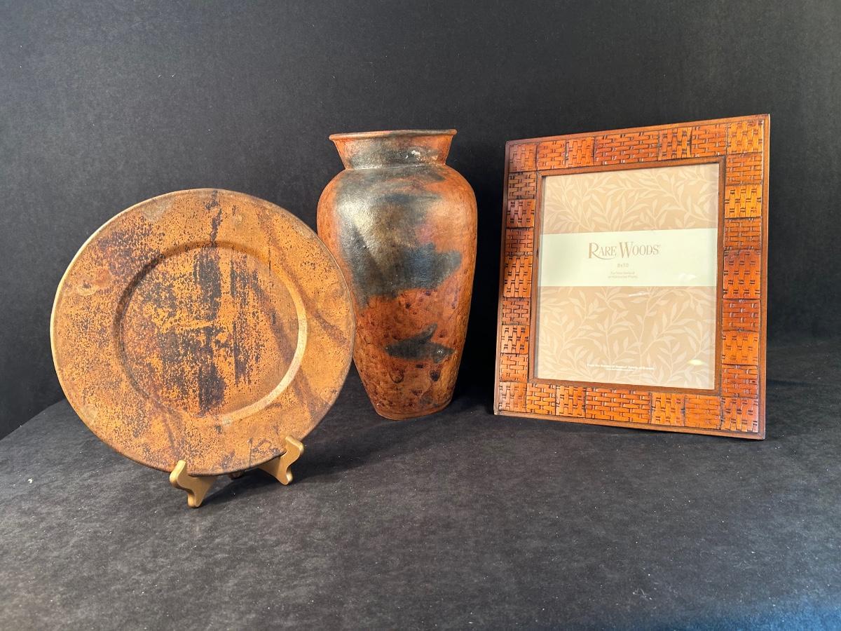 Lot includes a Rare Woods wood 8" x 10" frame, 11" metal rust colored plate with gold stand and a vase with wine corks 13 1/2" x 7 1/2