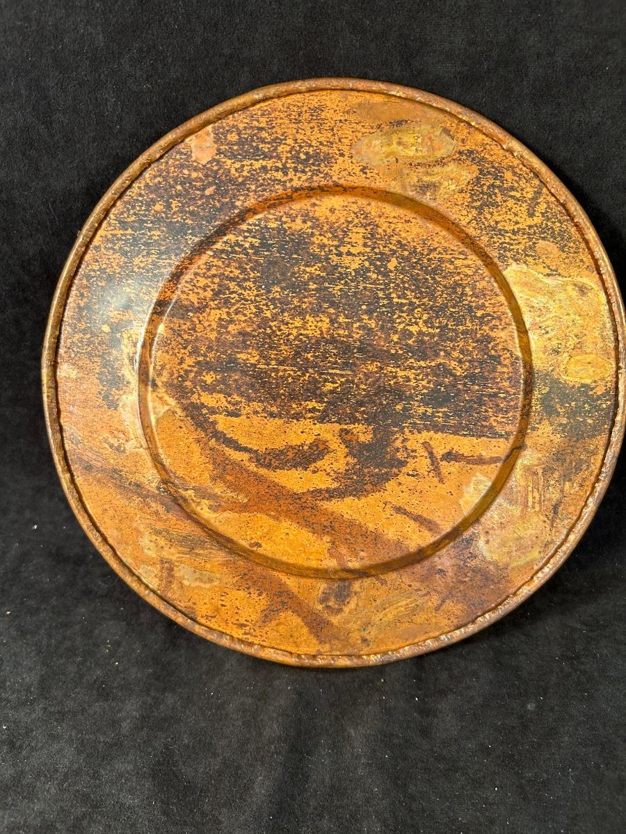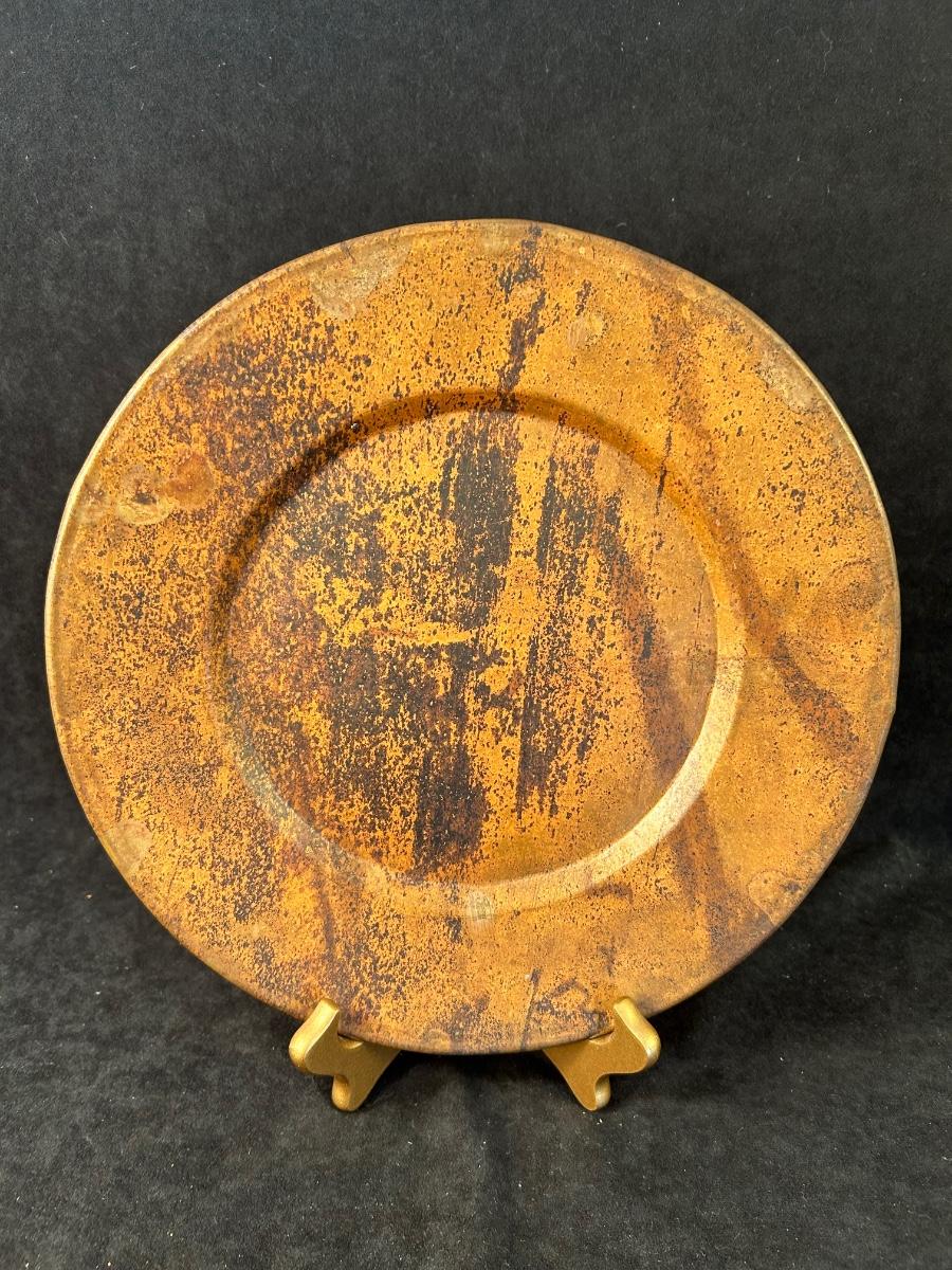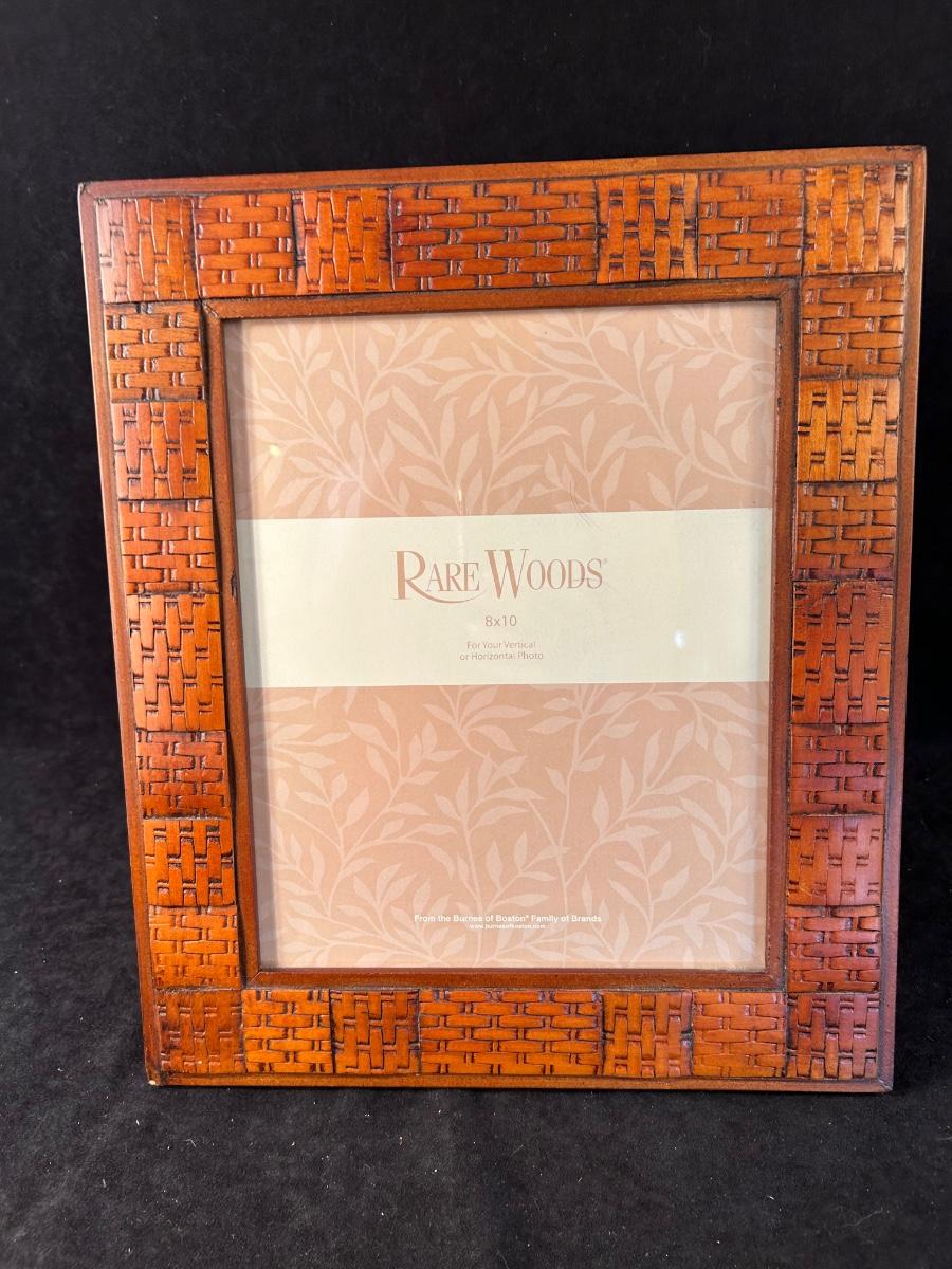 Lot includes a Rare Woods wood 8" x 10" frame, 11" metal rust colored plate with gold stand and a vase with wine corks 13 1/2" x 7 1/2