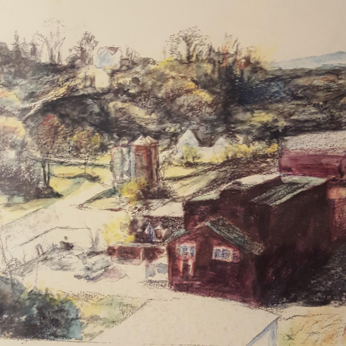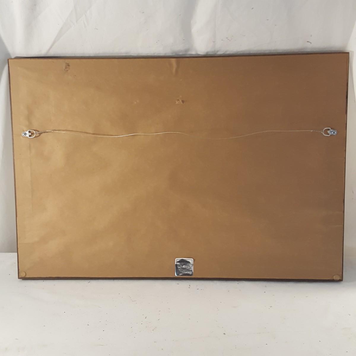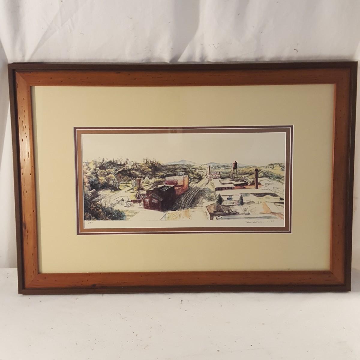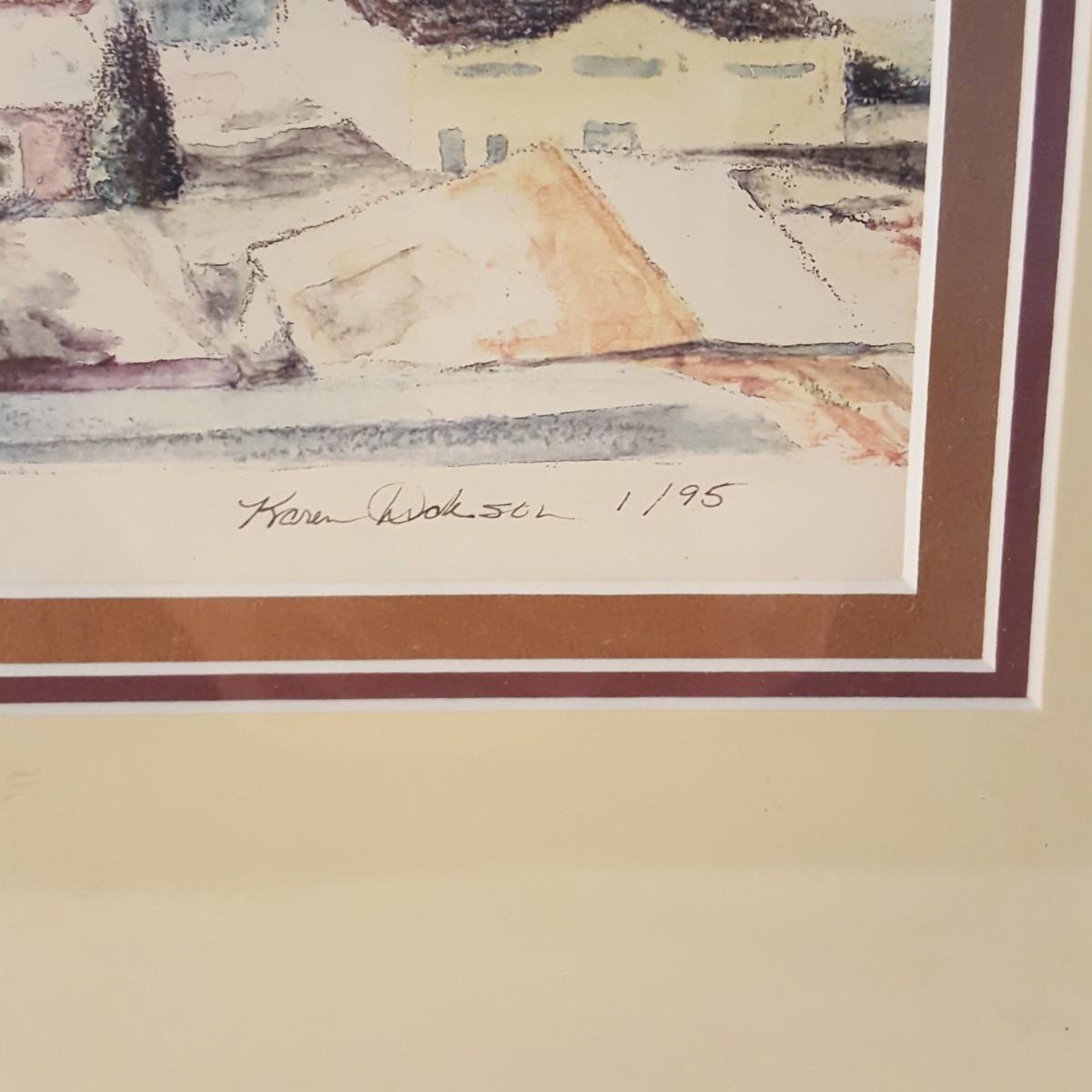 This beautiful piece is framed in a solid two toned wood frame. The piece measures 27x18x1 inches and depicts a town scene of unknown location. It appears to be a print of a watercolor painting. Add this unique piece to your collection. Signed by artist Karen Dickson. Shipping available.