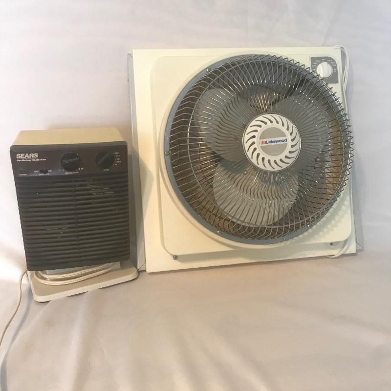 We’ve got your temperature needs covered here. Sears oscillating heater/fan with various switches for oscillating, heating and cooling. Piece is small enough to store easily when not in use 7.75” x 5.75” x 11.5”. The label is slightly separating. See photos. Next in the lot is a Lakewood window fan with airflow changing ability. As pictured, fan measures 19” x 18” and is about 8” deep. This fan has capability to extend to fit larger window, but the extensions are screwed in place and exact measurements unknown. Both fans turned on when tested. Local pick up only.