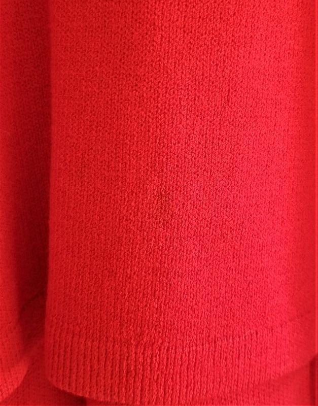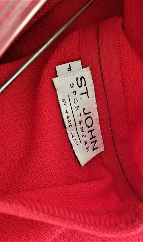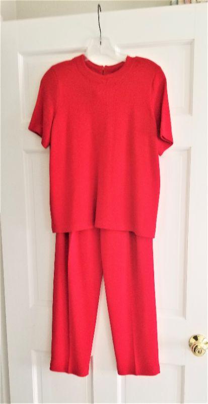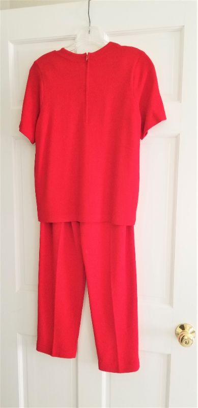 This Cherry red St. John Knits top and slacks set is a size 4 but I think someone who is a 6 could wear it. There appears to be a light stain on the front of the top near the bottom. Again, very faint but it you look hard you can see it. We have not tried to clean these garments.