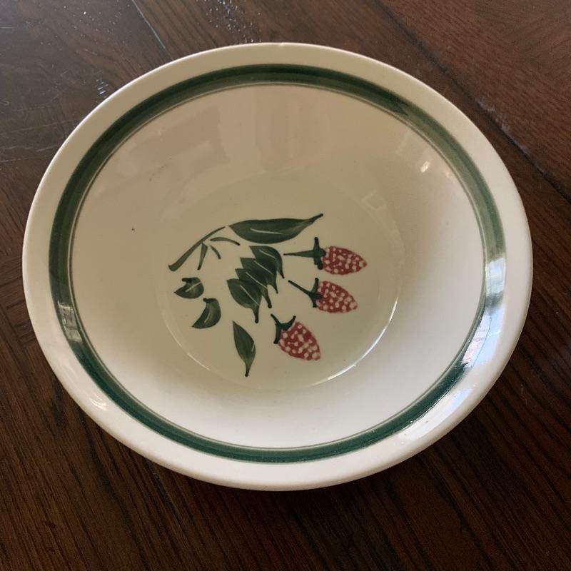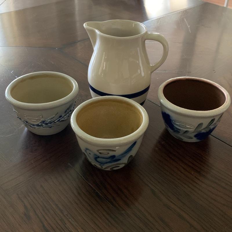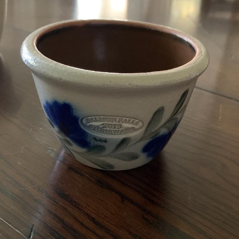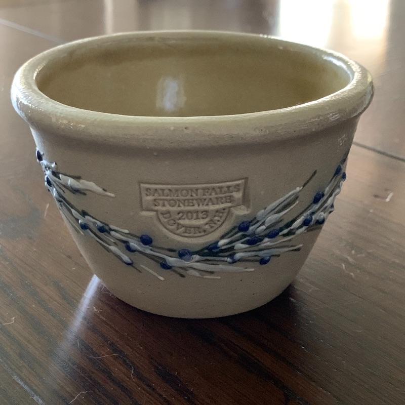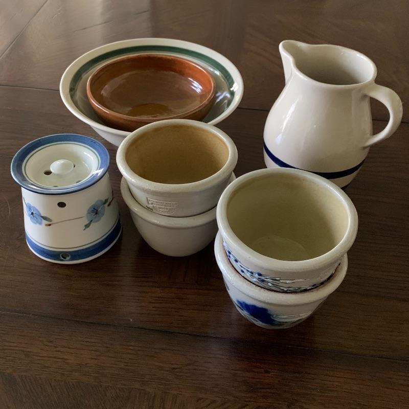 This lot includes a set of four Salmon Falls Stoneware bowls, a brown hand thrown ceramic bowl, a larger white bowl with strawberries painted on the bottom, a ceramic pitcher, and a ceramic garlic container. Shipping available
