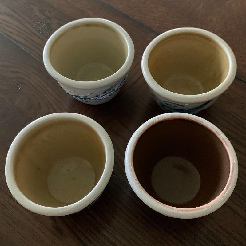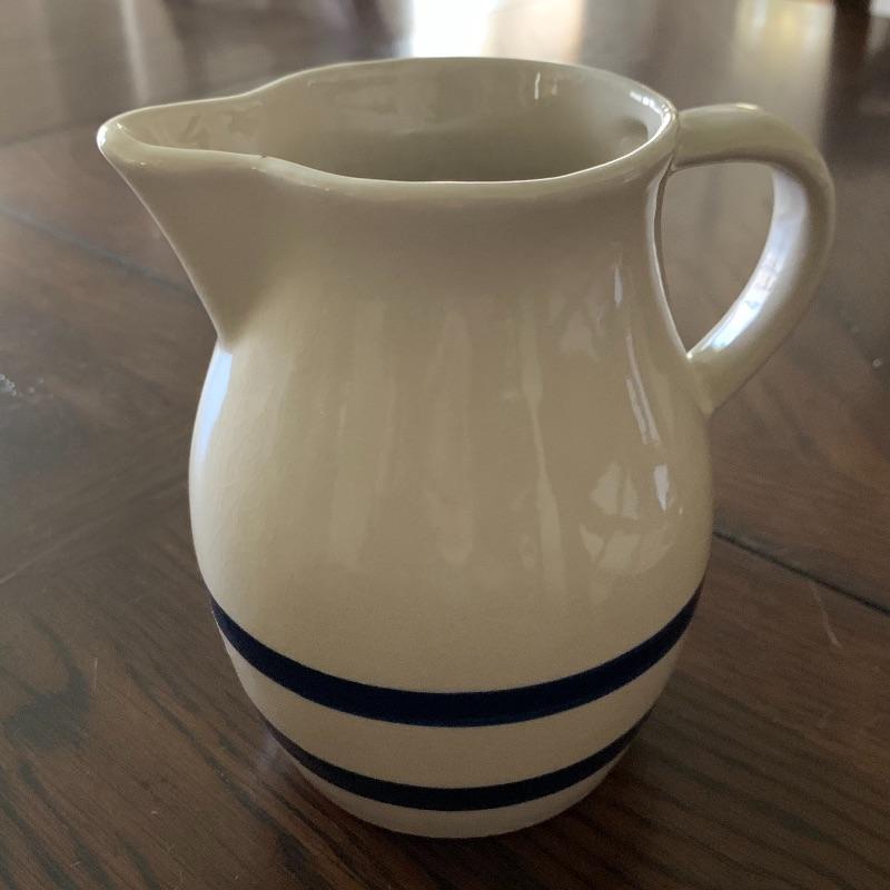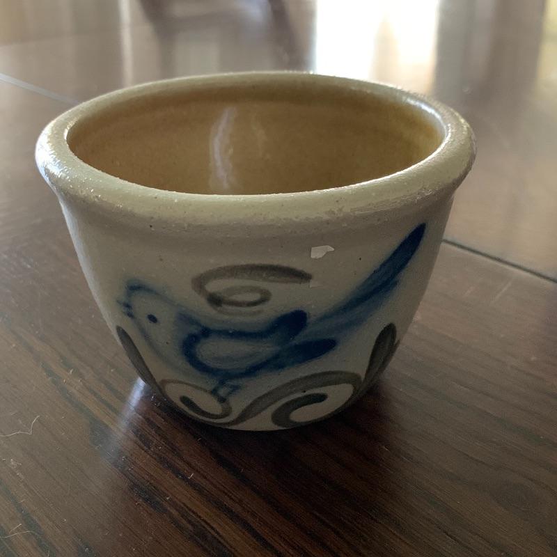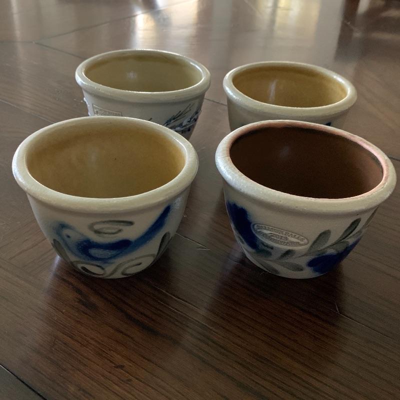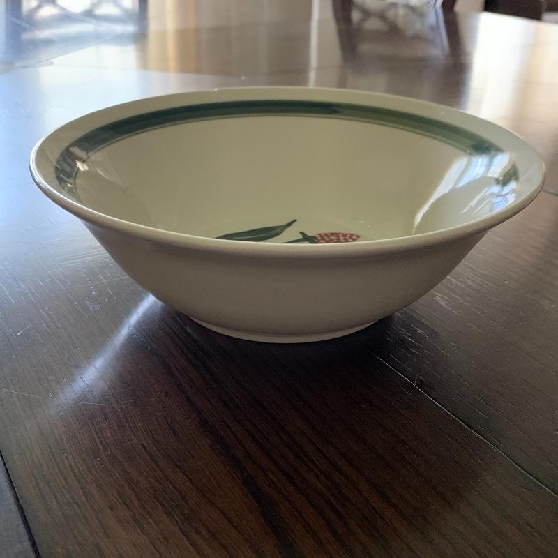 This lot includes a set of four Salmon Falls Stoneware bowls, a brown hand thrown ceramic bowl, a larger white bowl with strawberries painted on the bottom, a ceramic pitcher, and a ceramic garlic container. Shipping available
