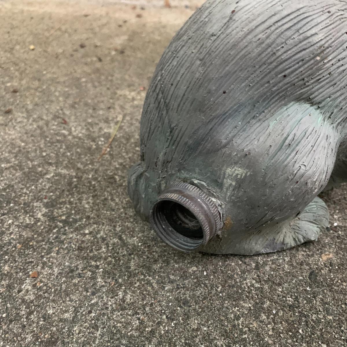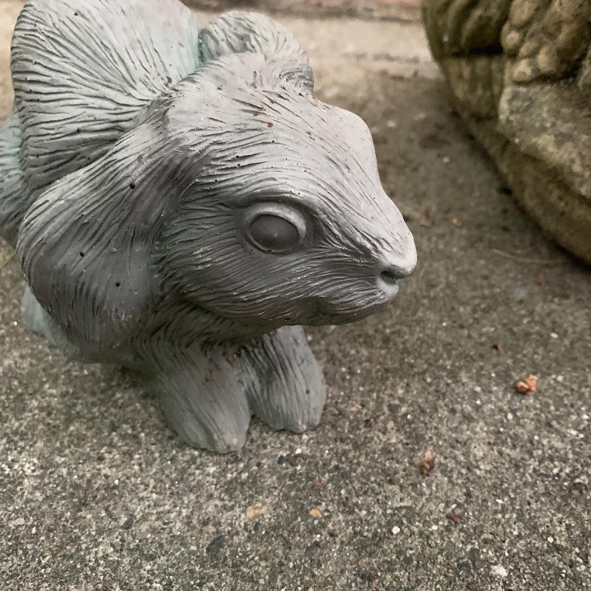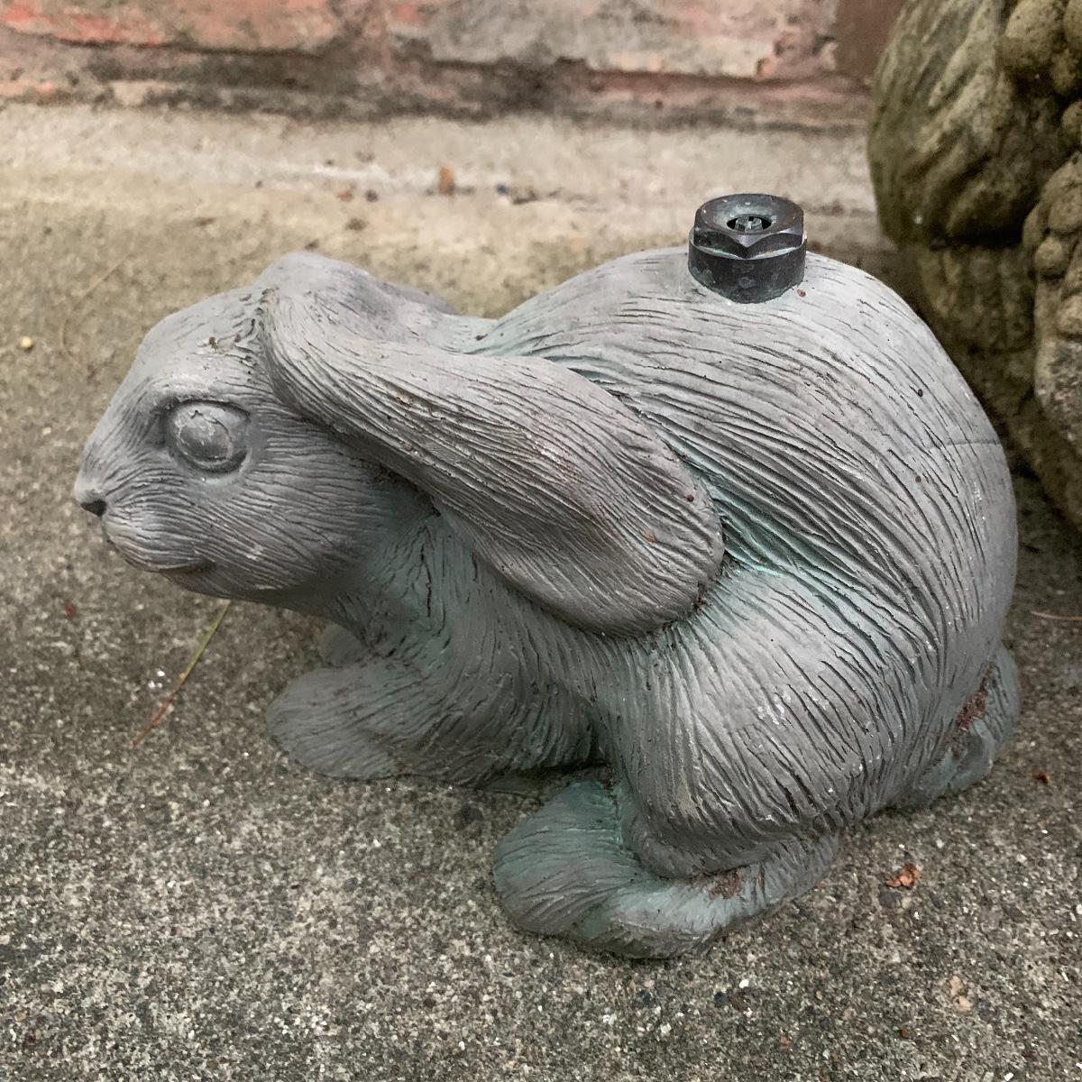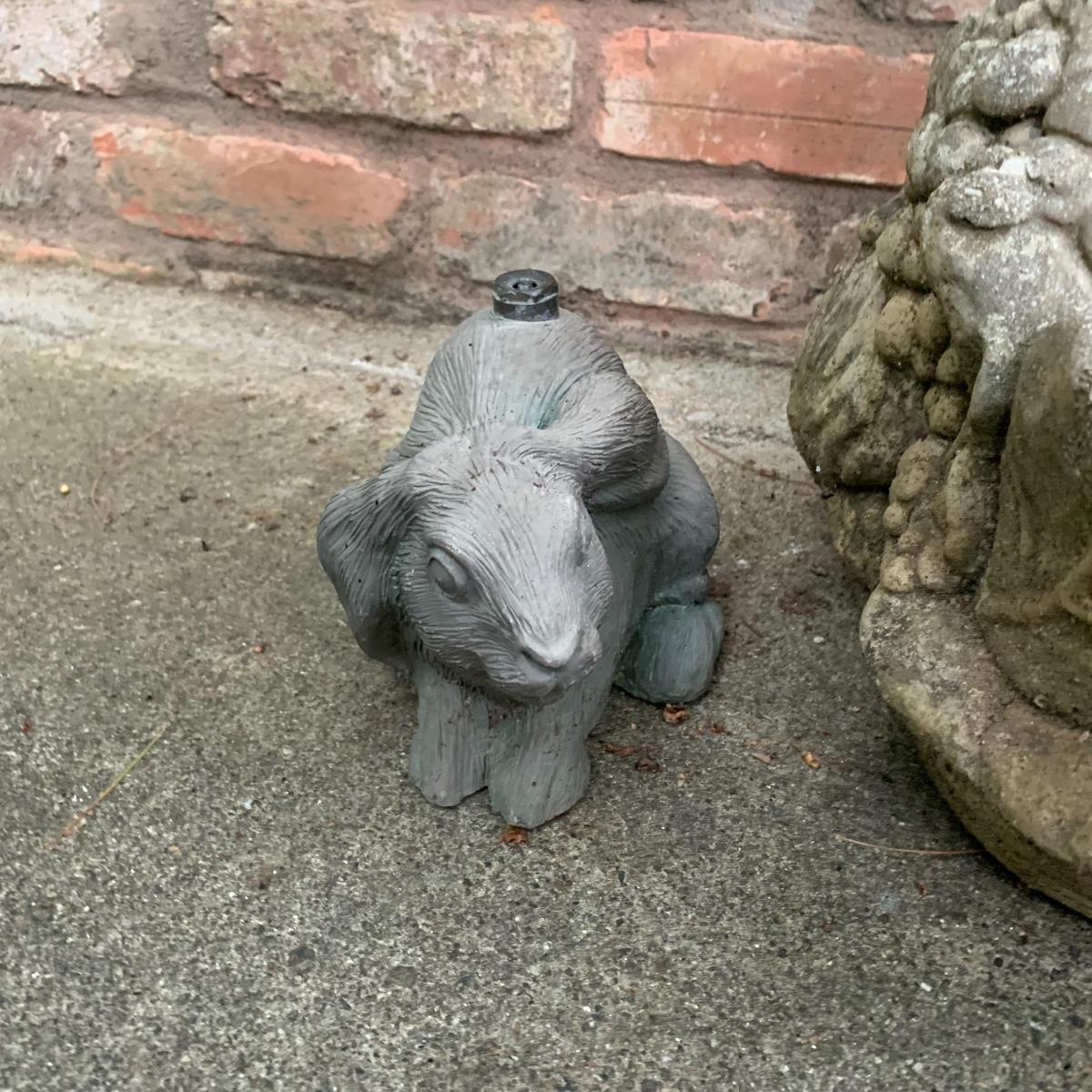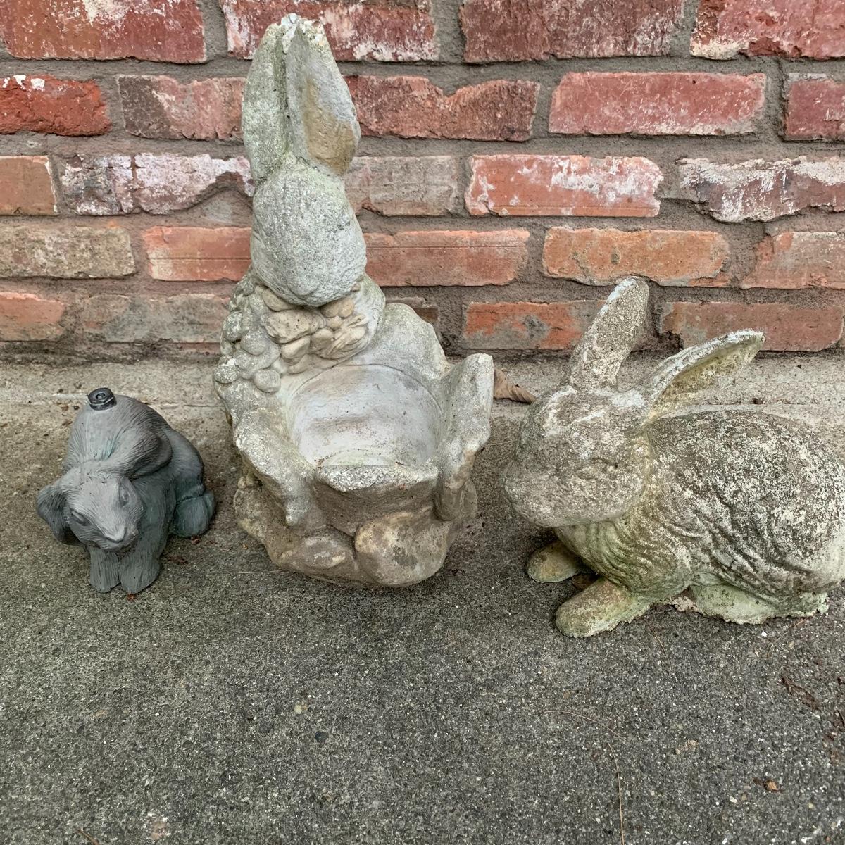 Look at this cute trio! The bunny on the left is actually a sprinkler, and is dark colored with slight light blue accents. The middle bunny stands 17” tall and doubles as a planter. It’s solid cast concrete and in good condition except a little chip off the top of its right ear. The last bunny sits on all fours, is cute as a button, and also cast concrete. Hop through pics to see detail. Local pickup only.