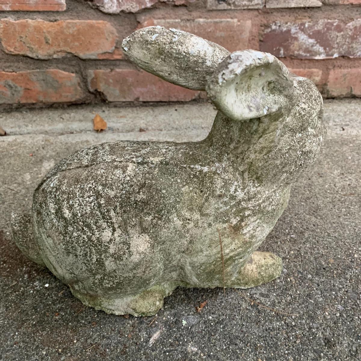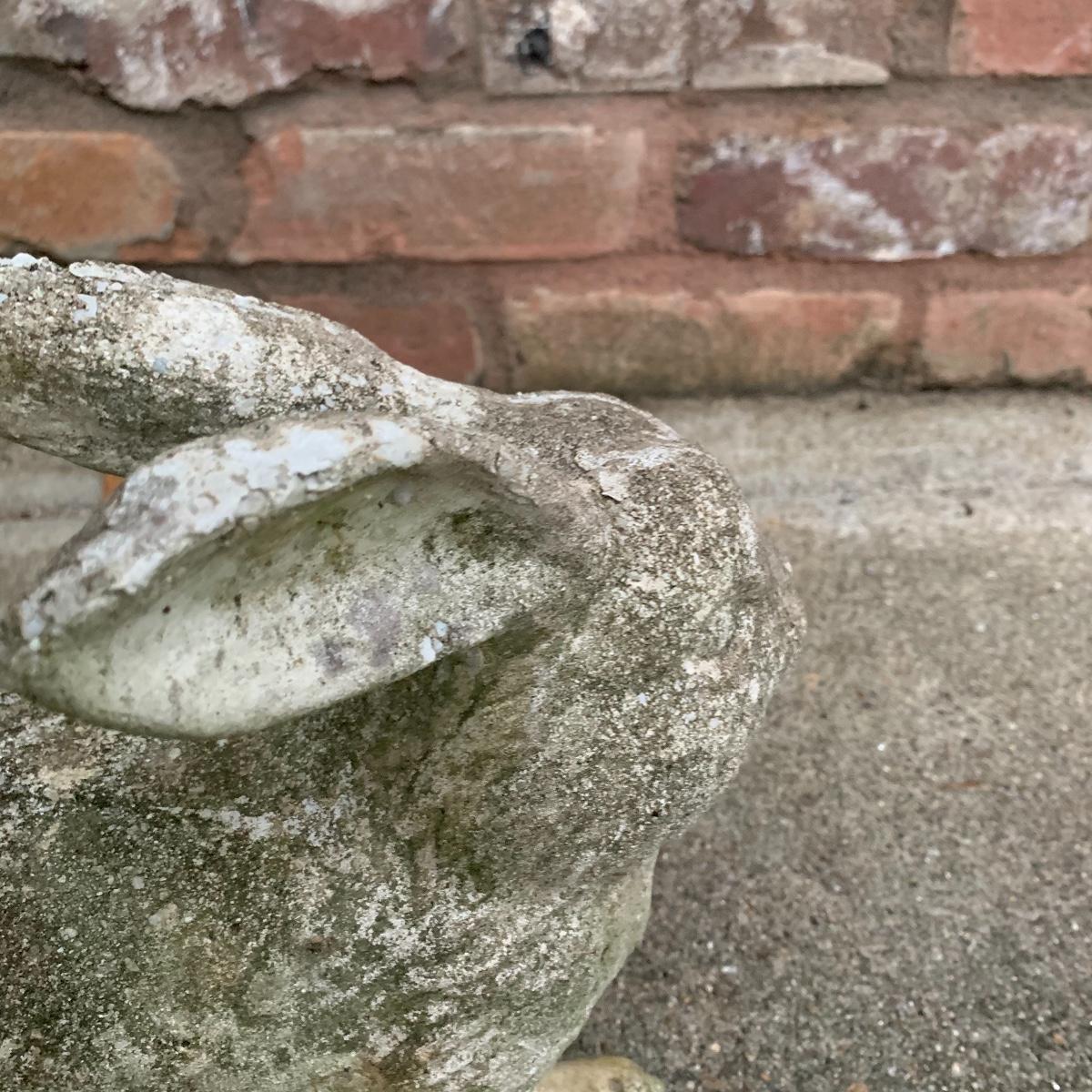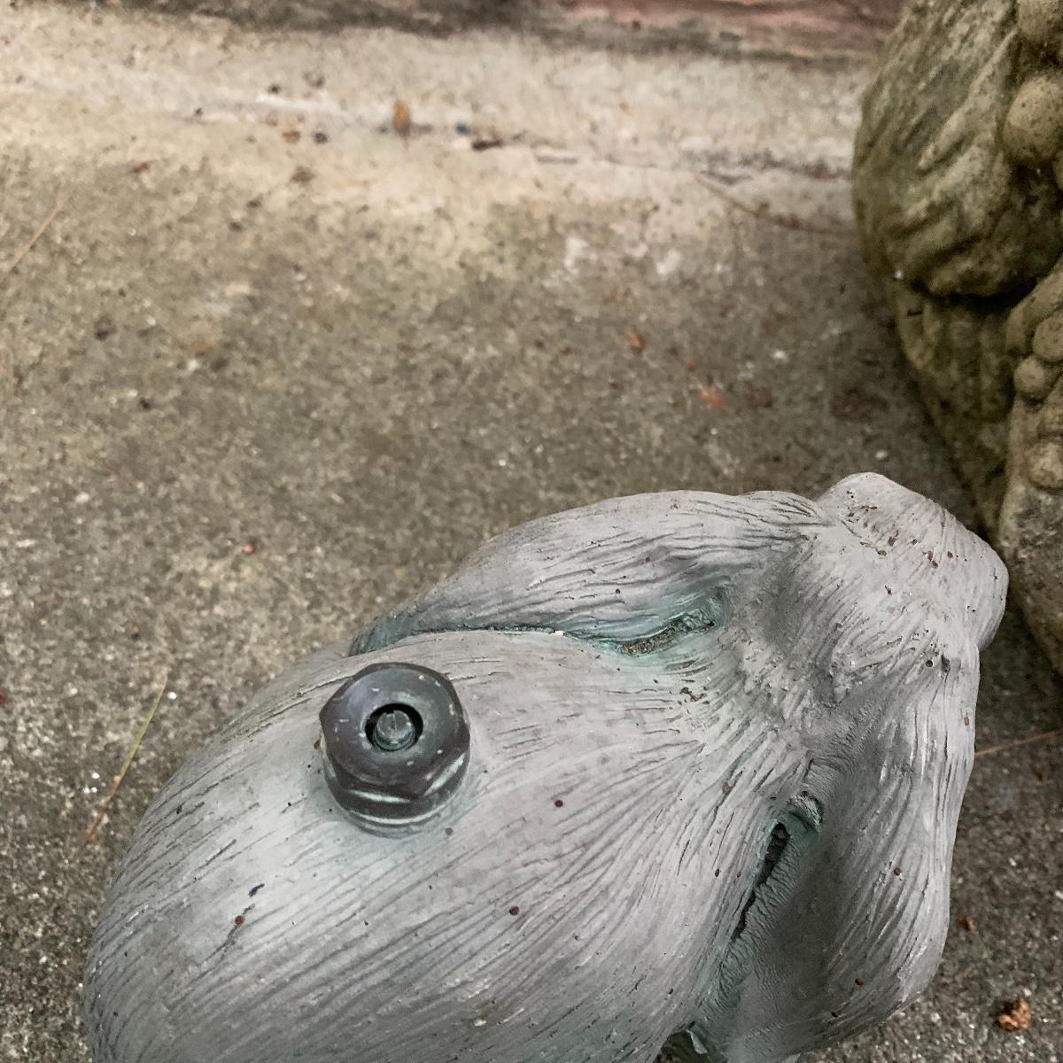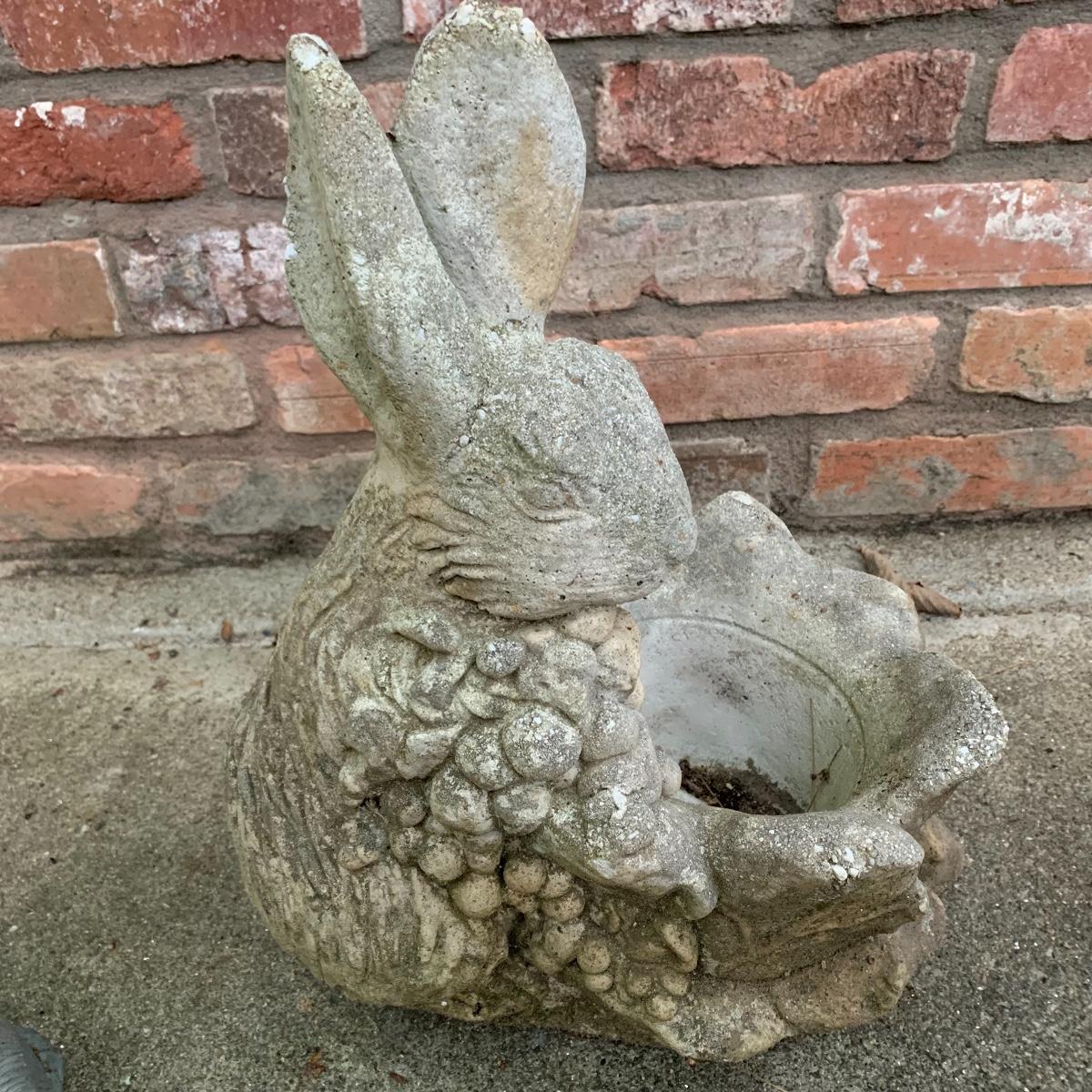 Look at this cute trio! The bunny on the left is actually a sprinkler, and is dark colored with slight light blue accents. The middle bunny stands 17” tall and doubles as a planter. It’s solid cast concrete and in good condition except a little chip off the top of its right ear. The last bunny sits on all fours, is cute as a button, and also cast concrete. Hop through pics to see detail. Local pickup only.