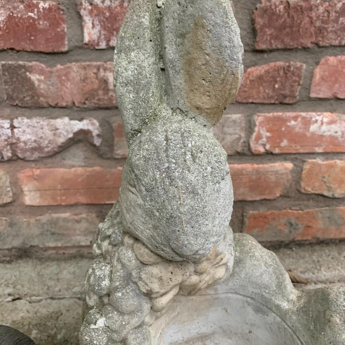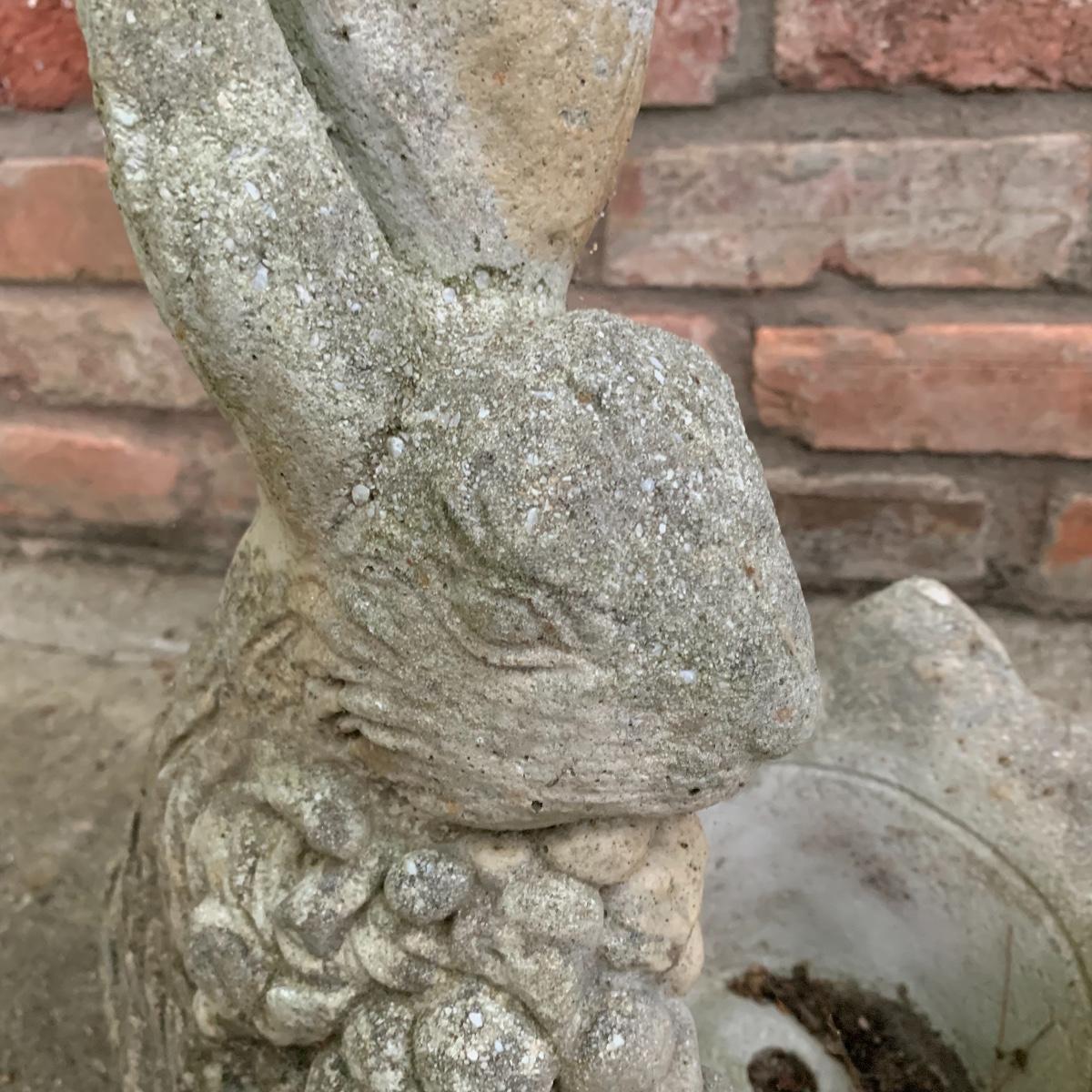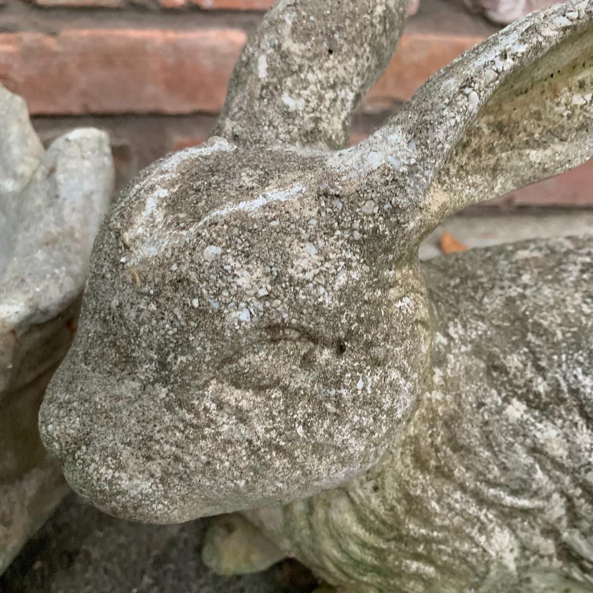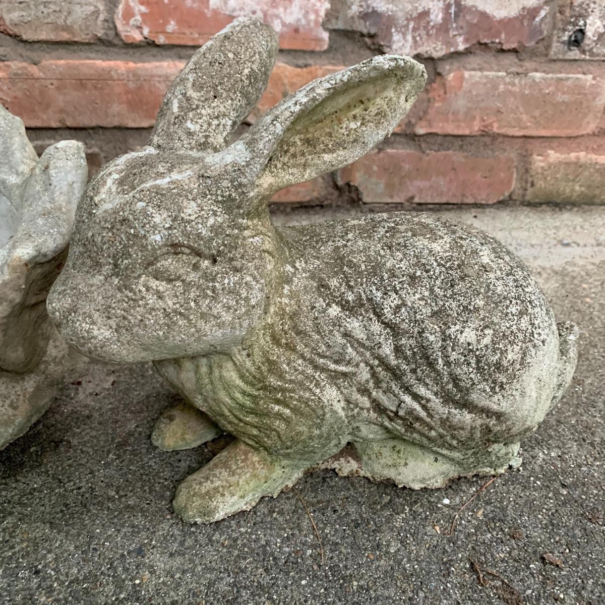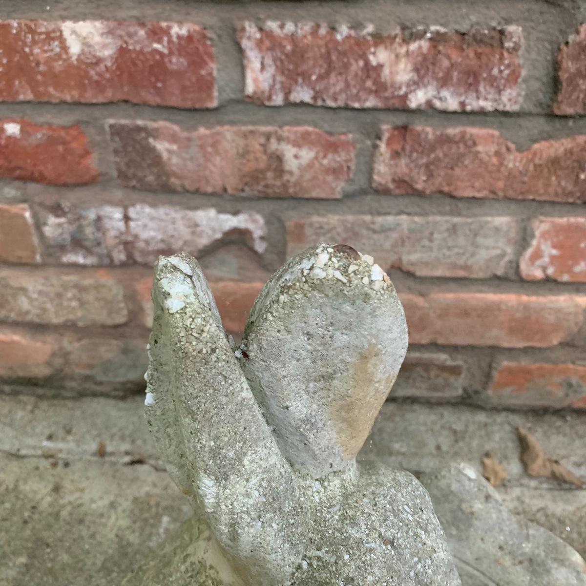 Look at this cute trio! The bunny on the left is actually a sprinkler, and is dark colored with slight light blue accents. The middle bunny stands 17” tall and doubles as a planter. It’s solid cast concrete and in good condition except a little chip off the top of its right ear. The last bunny sits on all fours, is cute as a button, and also cast concrete. Hop through pics to see detail. Local pickup only.