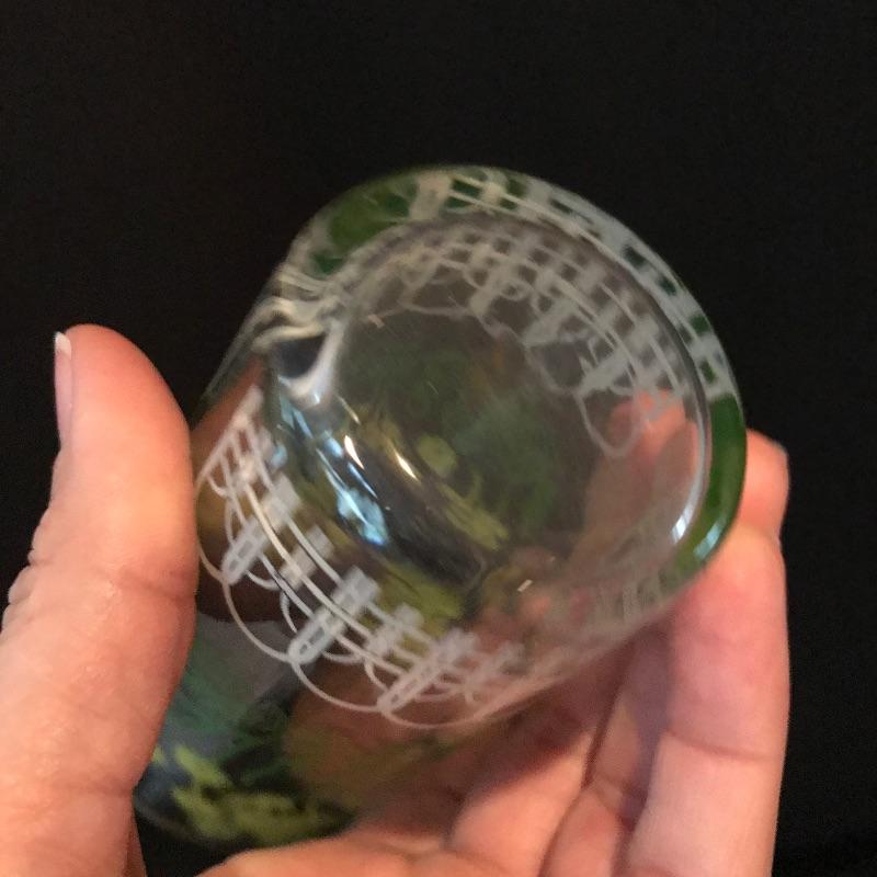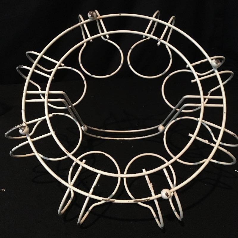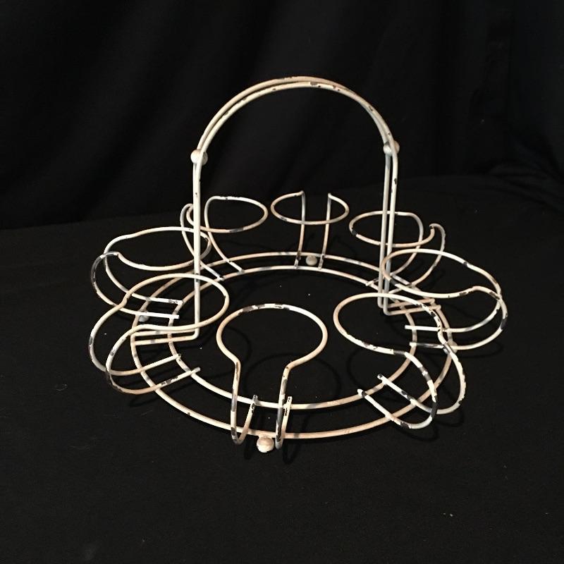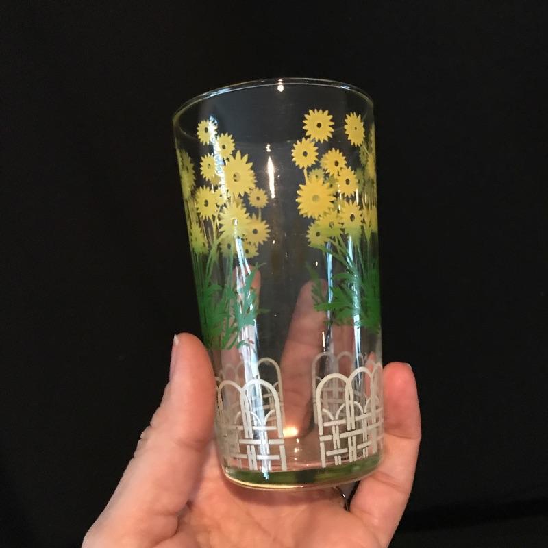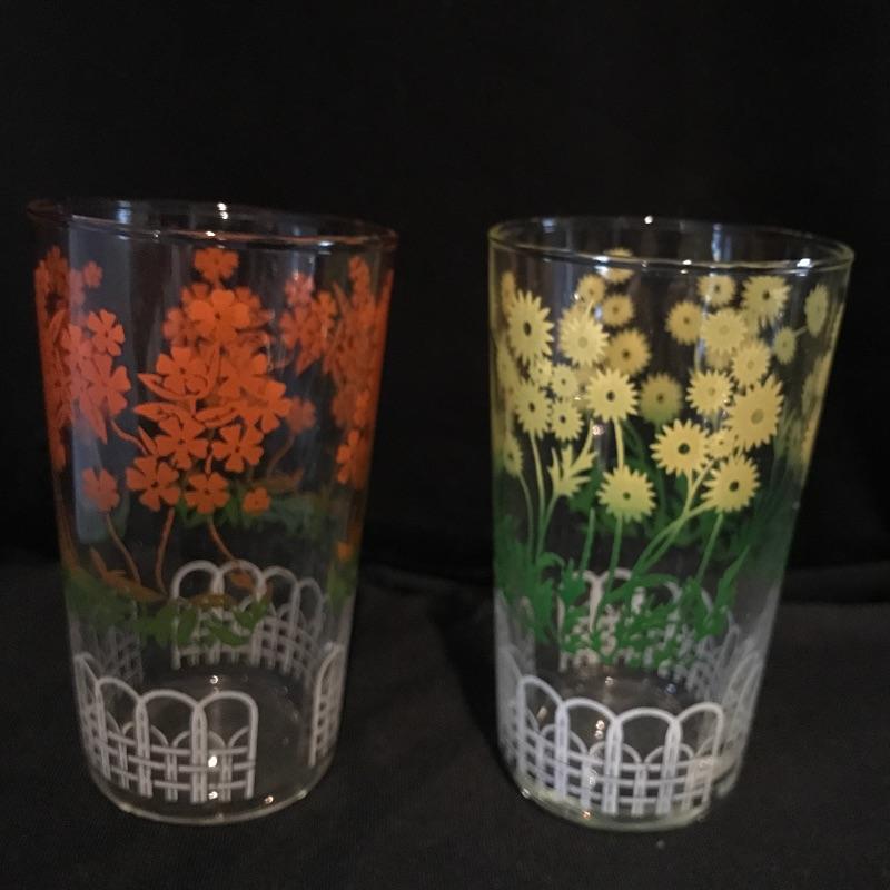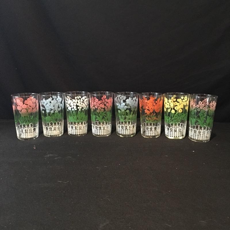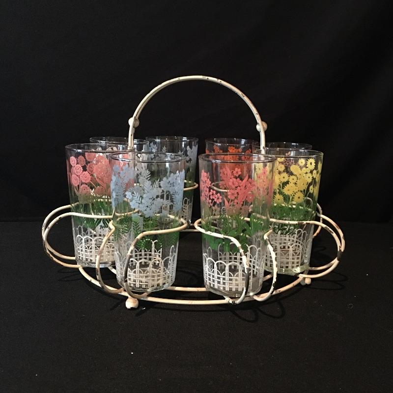 The cutest glass set ever. This lot has a vintage glasses and metal holder. Eight floral design glasses with a circular metal tray to carry them will be great for you garden party. Tray measures 12.5”D x 8”. Tray has been well loved.