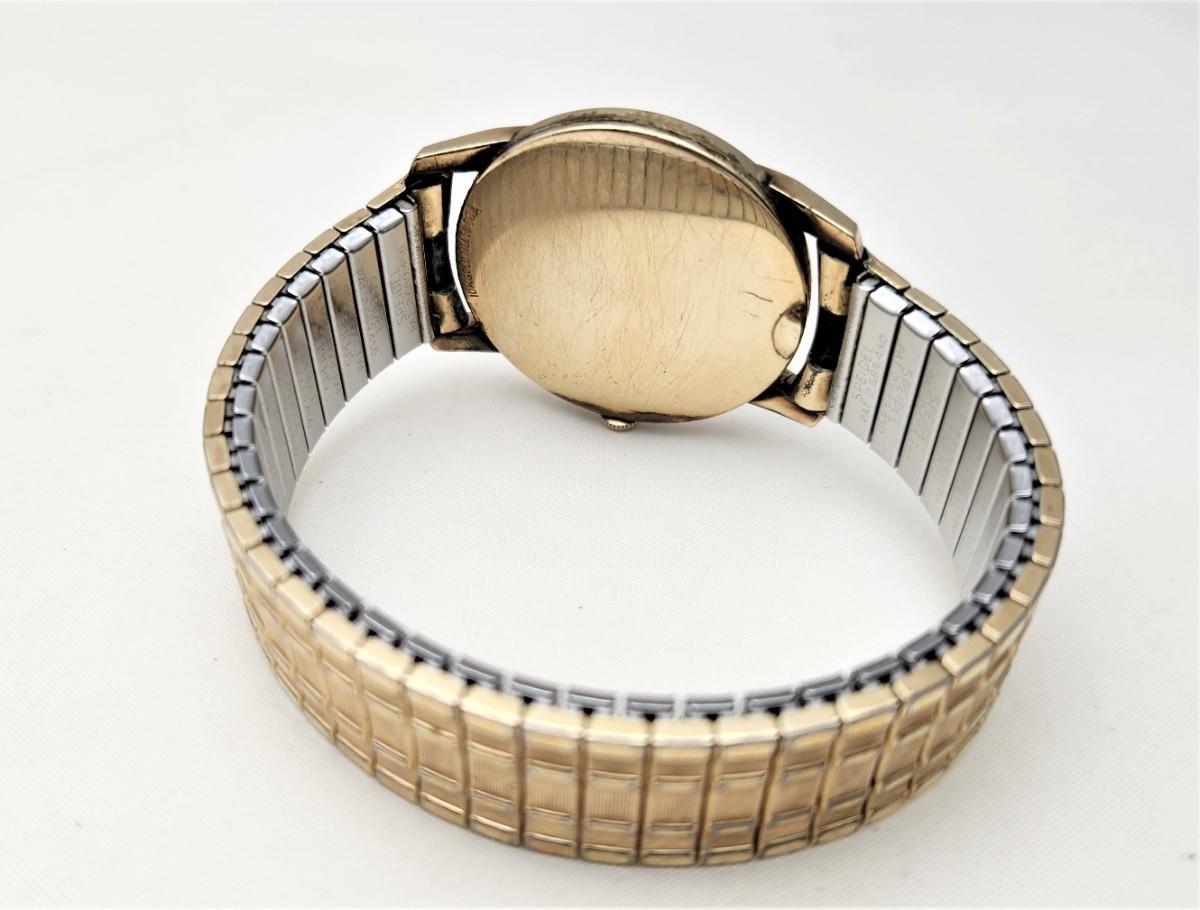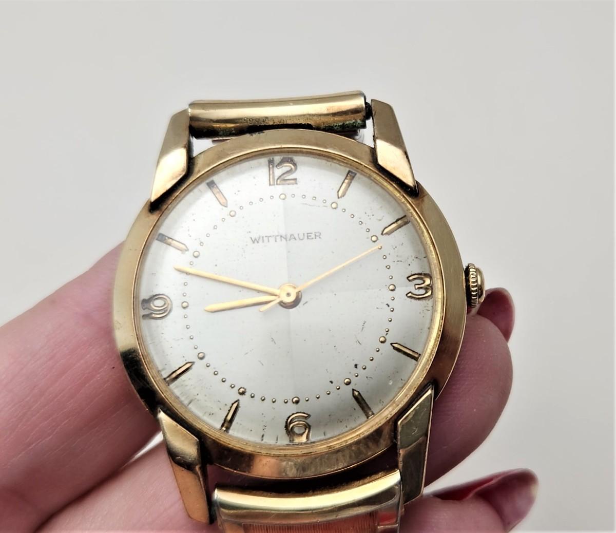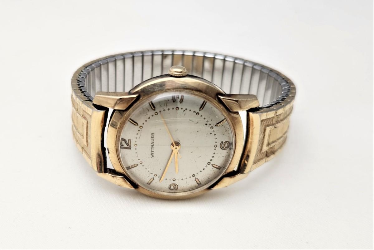 Vintage gold filled men's Wittnaur wristwatch - windup, not quartz - works. Band has been changed - originally came on a leather band, face is 1.5" across. Good vintage condition.