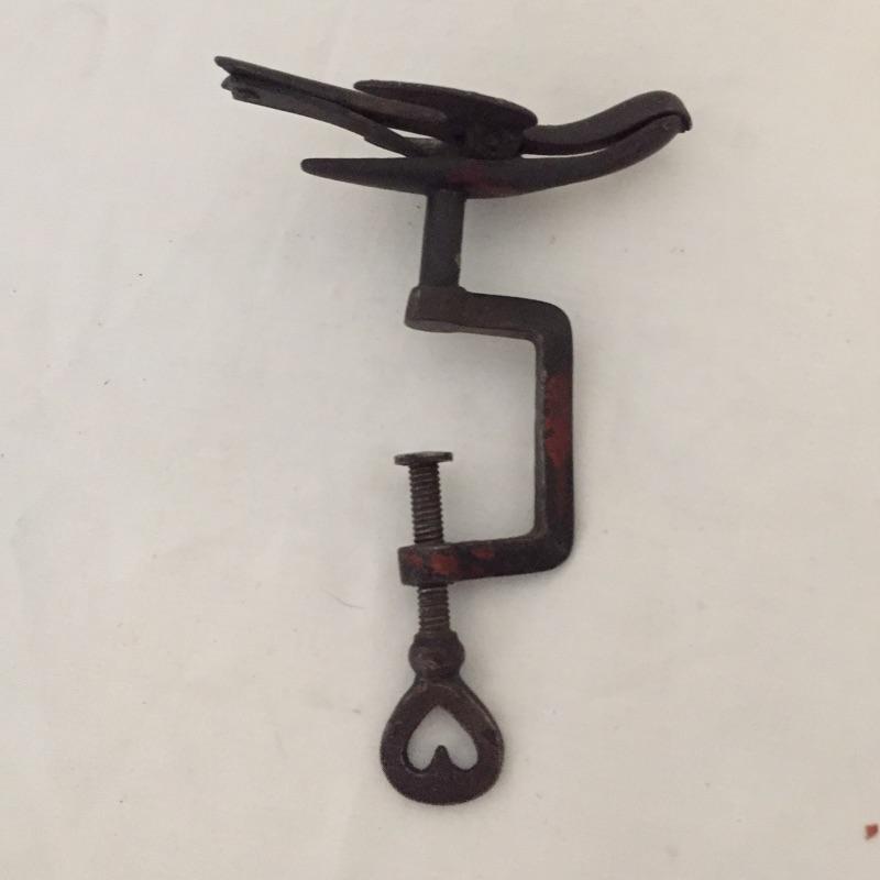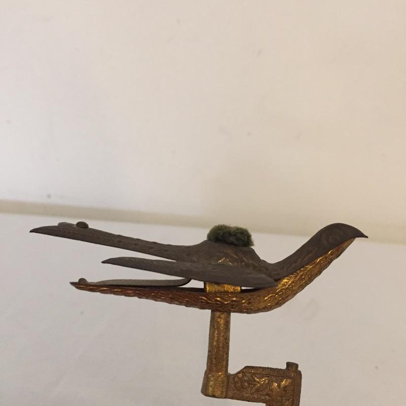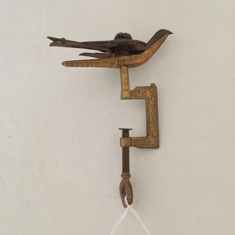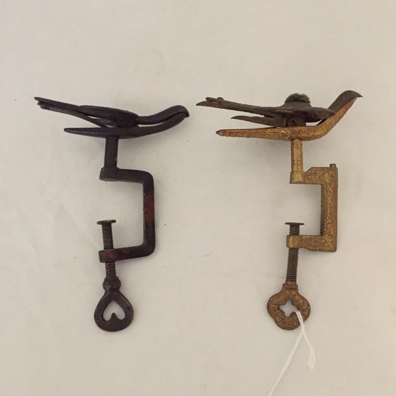 Pair of sewing birds used to hold fabric. One bird appears to be brass. Largest bird measures 4.5” tall. Makes a great gift for your sewing friends.