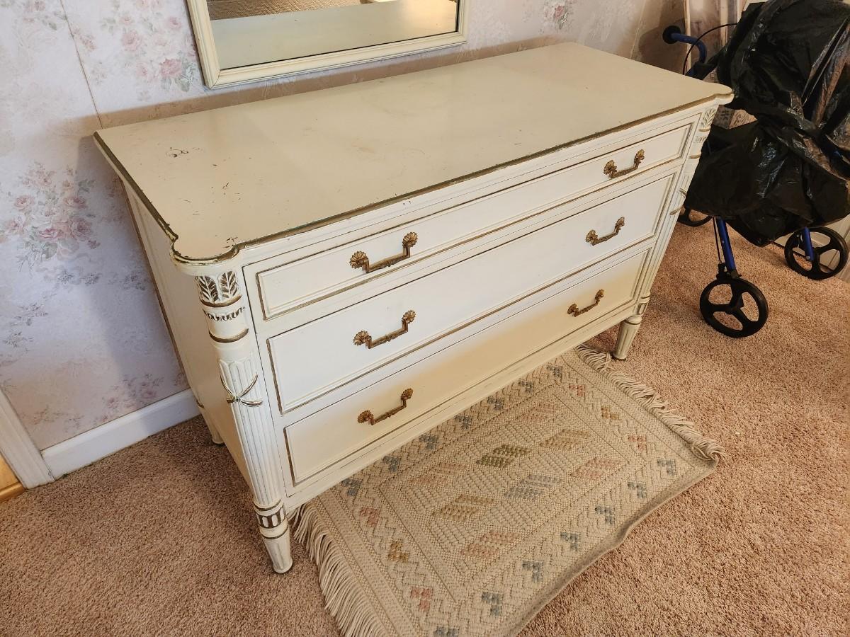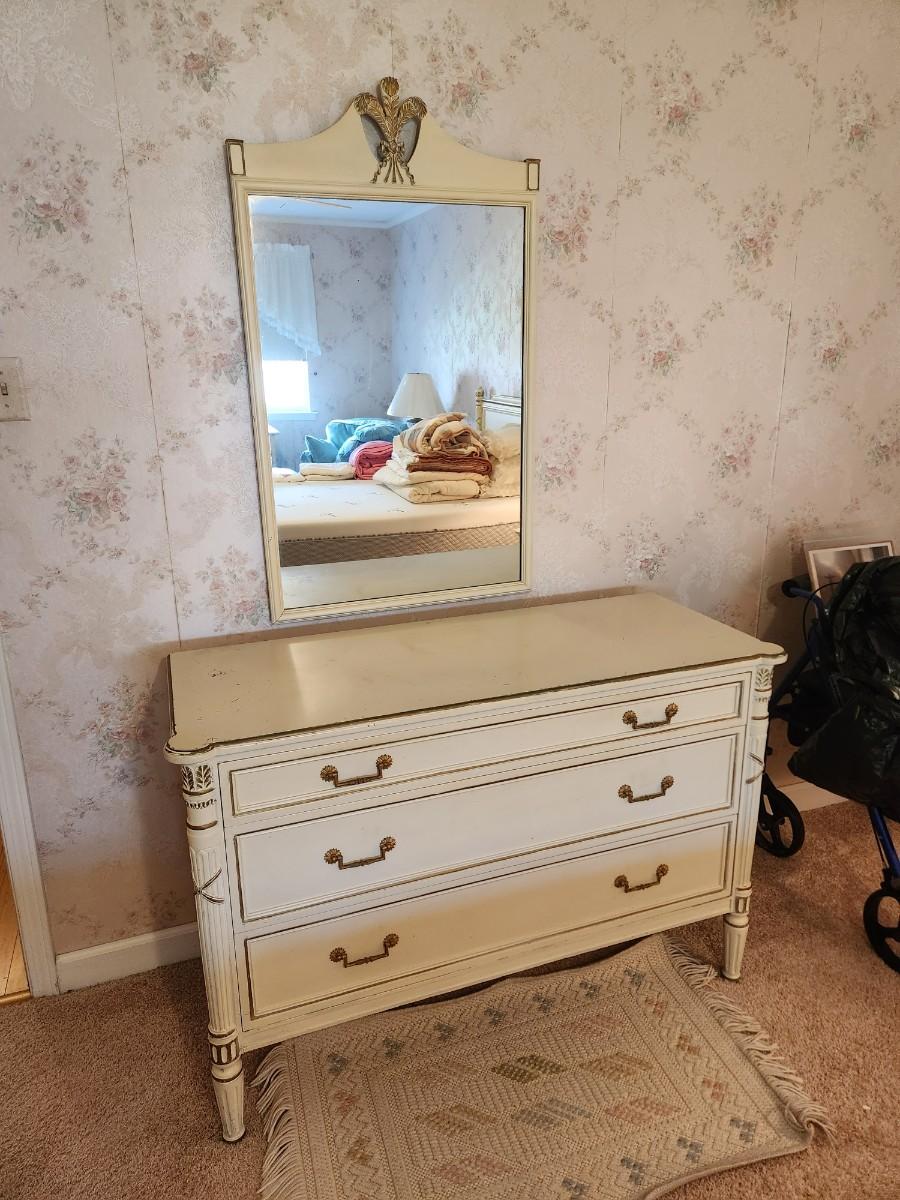 This is a versatile piece of furniture that could really be used anywhere in the house - Thomasville French Provincial Style (1970s) dresser - 3 drawers - with matching wall mirror. Dresser is 32" tall, 4 feet across, 19" deep. Mirror is 25.5" across and 41" tall. Good used condition.