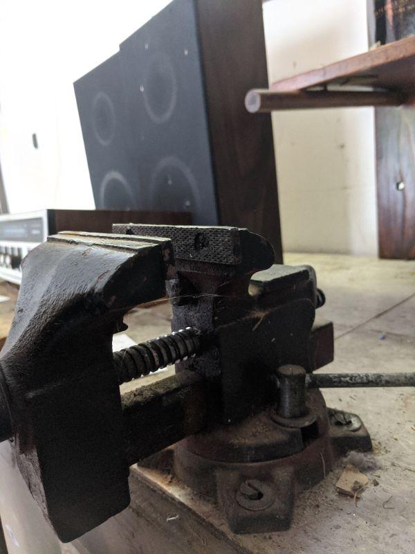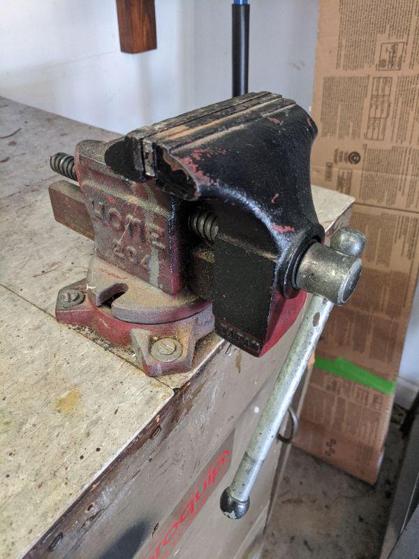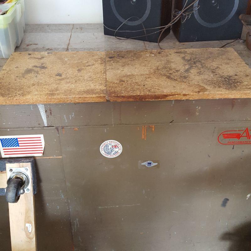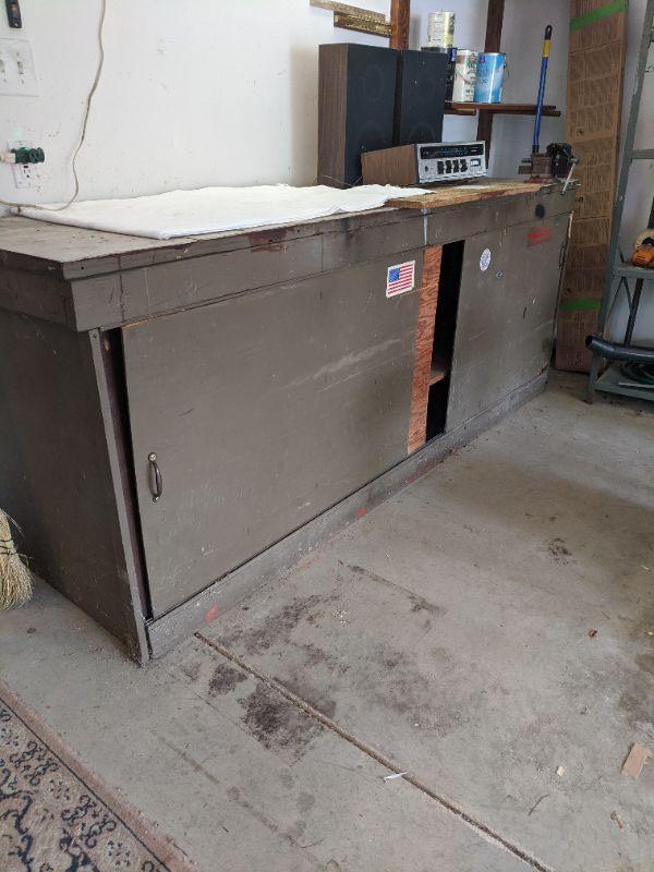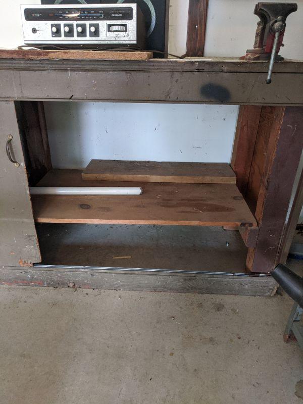 This workbench has two wooden sliding doors that hide a shelf. The doors are a little sticky to open, but will. The surface is made out of floor tile, which has some stains on them and there is a wooden plank nailed to the front of the bench. On the right side of this bench there is a vice, it is a Home 204 4". The dimensions: height 3'1", width 8', length 2'3". Local pick up only. Please bring help to load, it's not too heavy, but the size is a challenge. Located in garage with easy access to driveway.