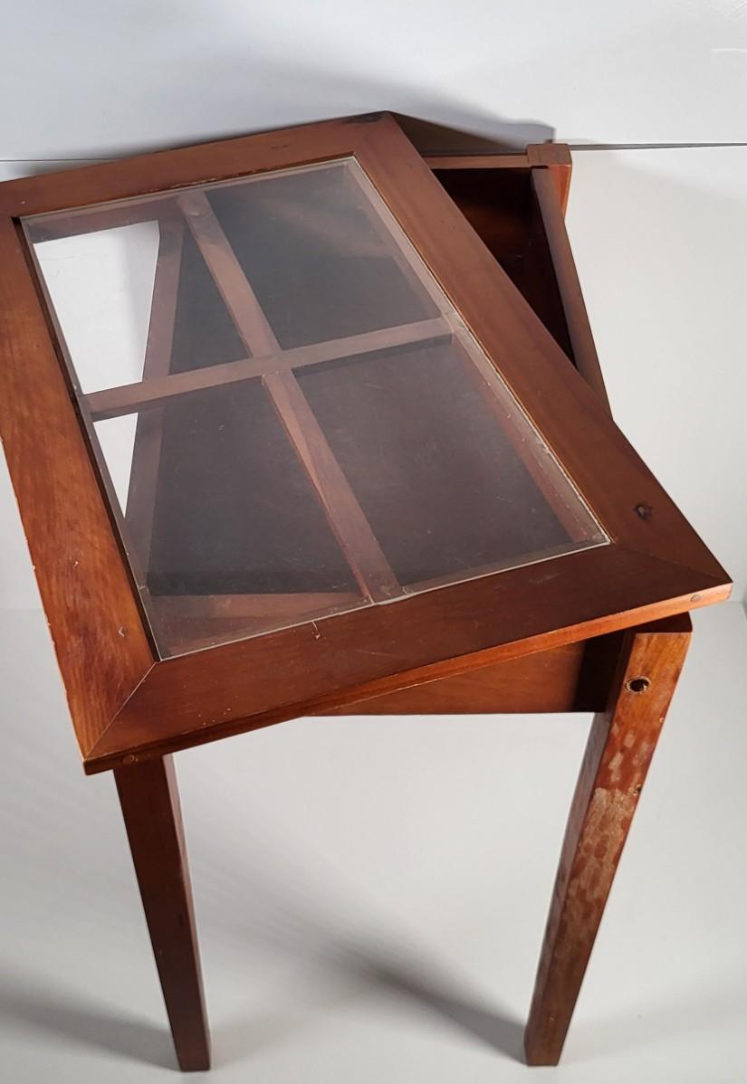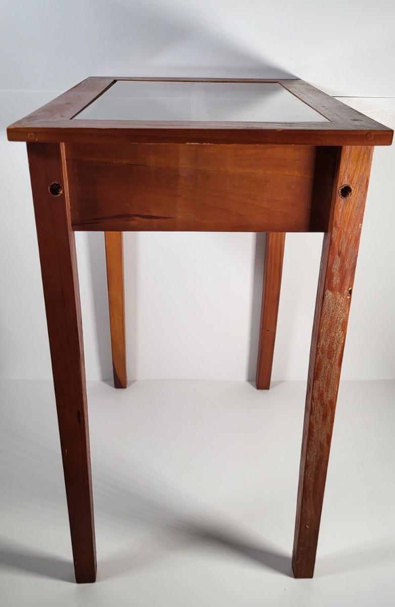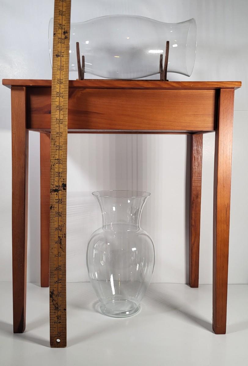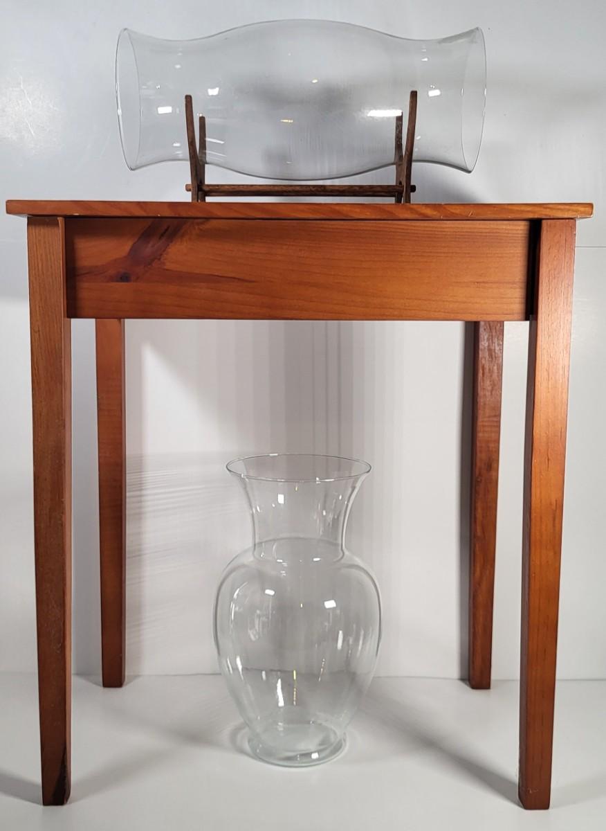 LOT 163G: Small Display End Table with Vase and Glass Display on Rack