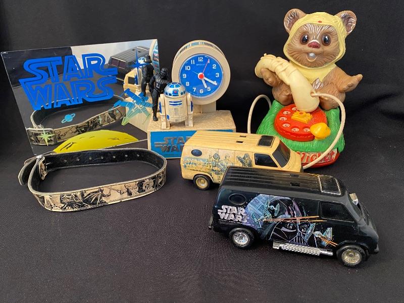 Vintage Star Wars mirror, alarm clock, child’s belt, set of vans and a Wicket phone. All collectibles have been photographed from every angle as they are the best representation of the item. While items may be listed as new, they are vintage or new old stock, and have been stored for some time. Please check all pictures for the edges of the packaging, as these are vintage the glue from the seal may have come loose, and if so, a picture will show. Please see pictures for exactly what you are getting and the condition. Anything extra about the condition will be noted at the beginning of the description. Thank you for looking and have fun bidding.