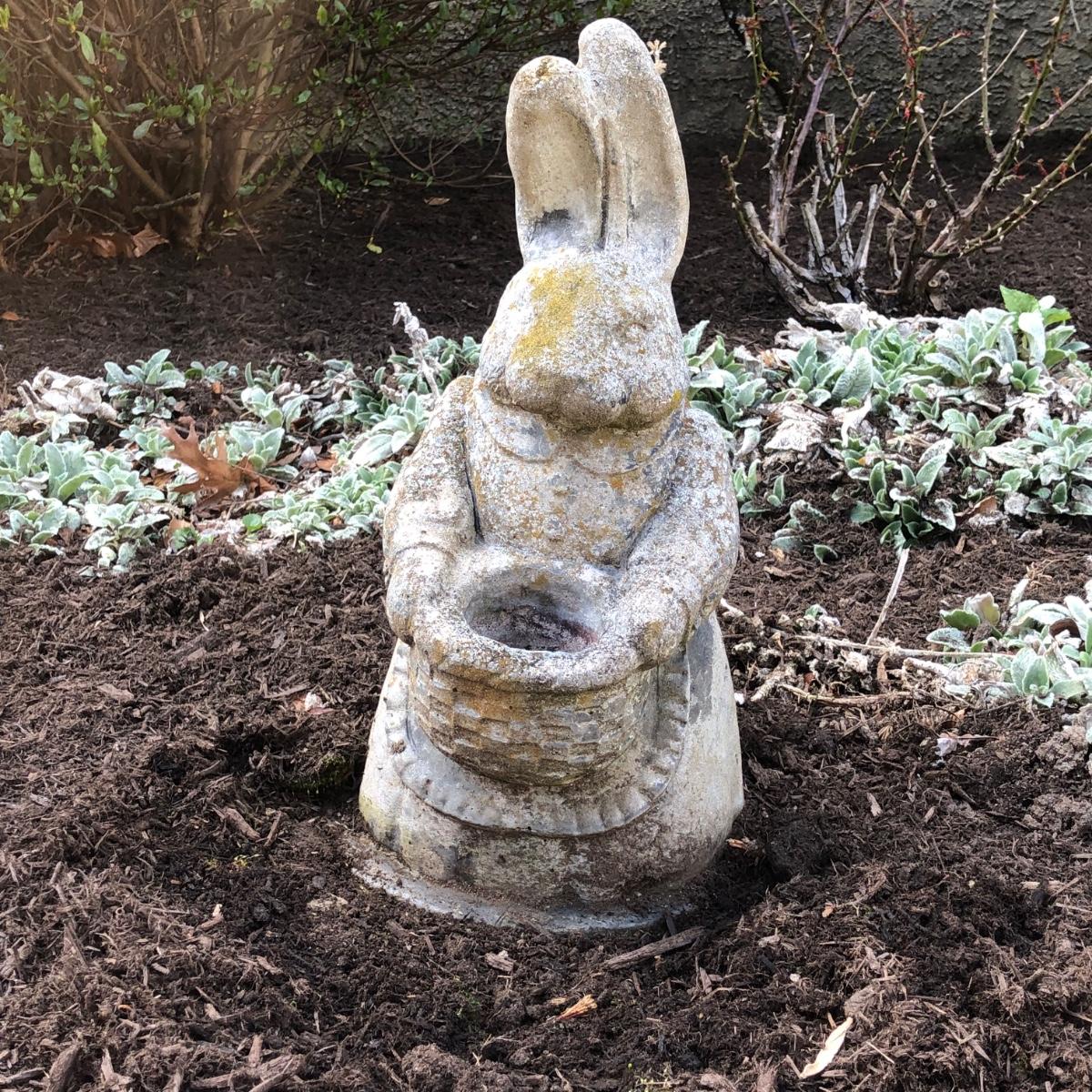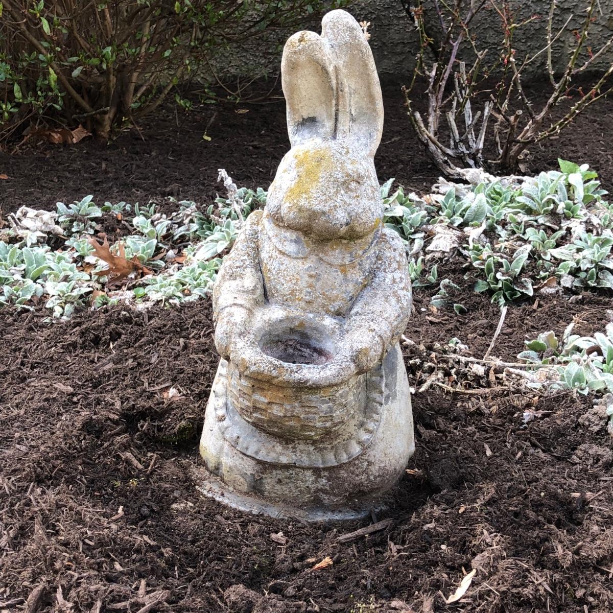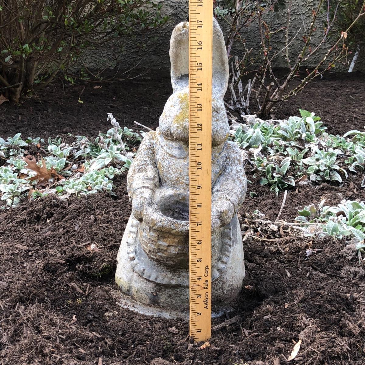 One cement statue of a rabbit with a dress holding a basket. Condition is weathered, as it has been outside in the elements.