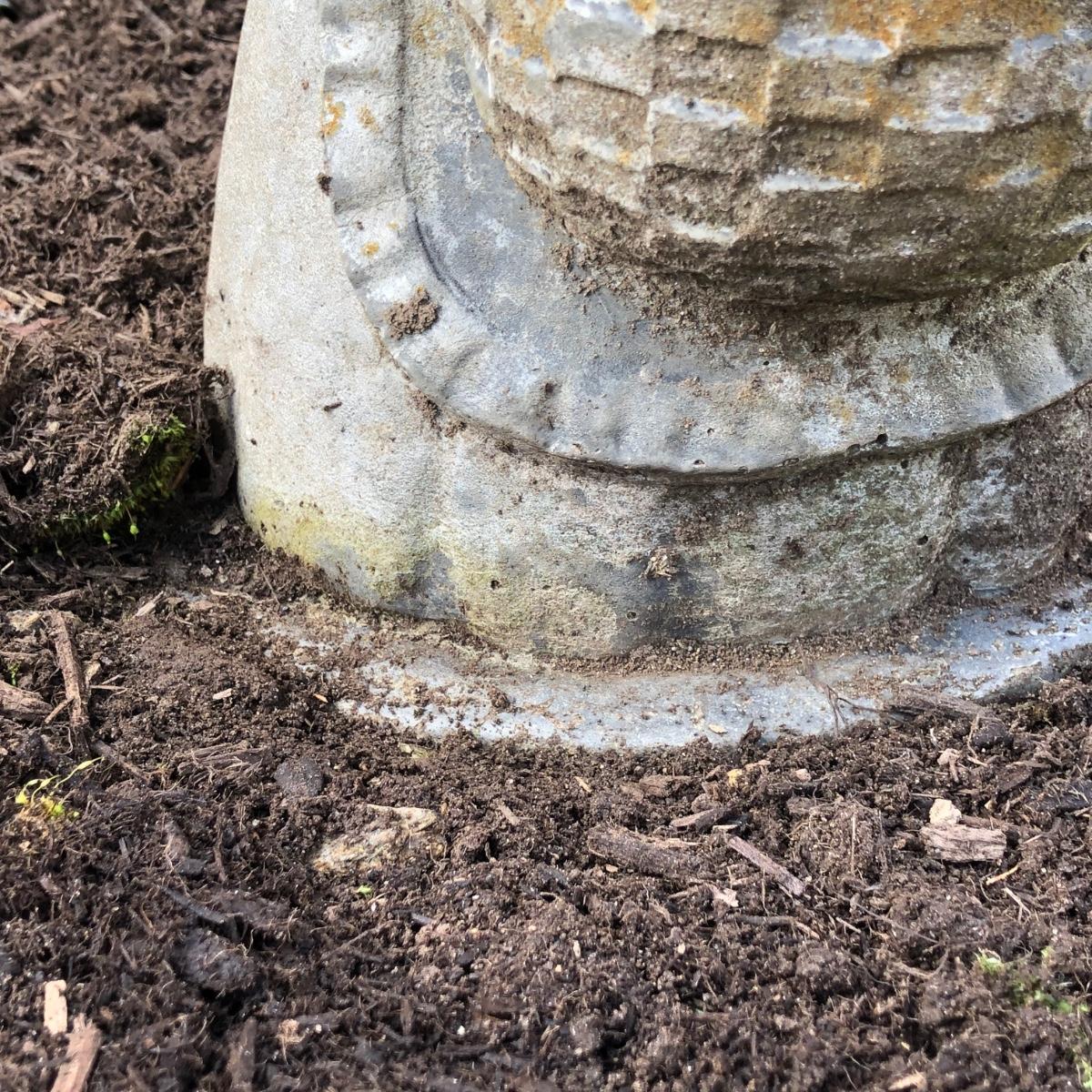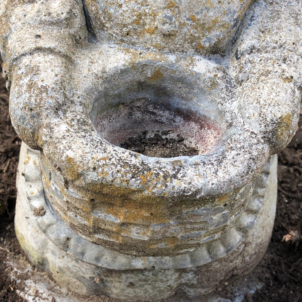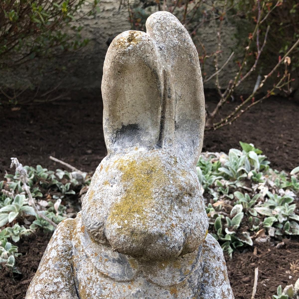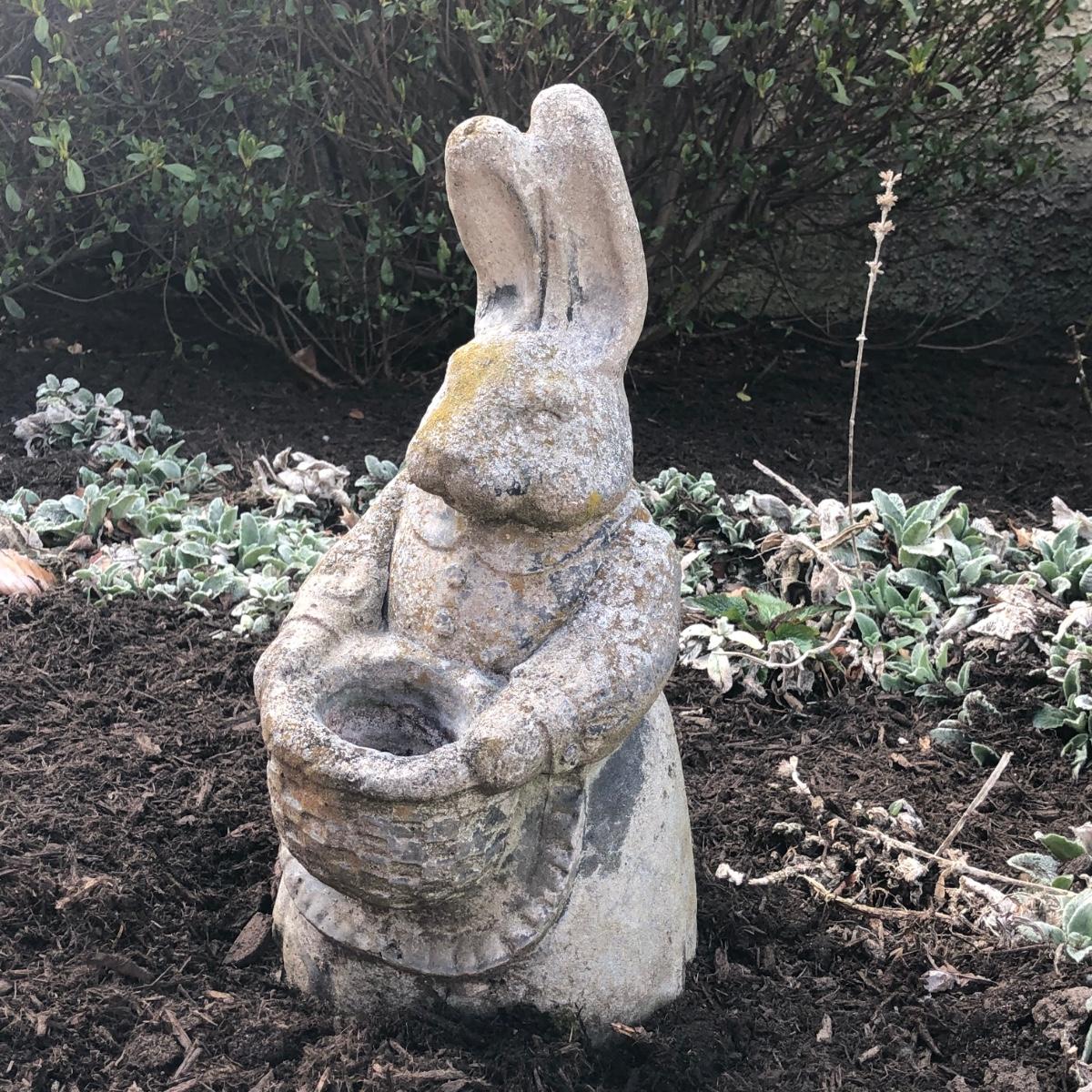 One cement statue of a rabbit with a dress holding a basket. Condition is weathered, as it has been outside in the elements.
