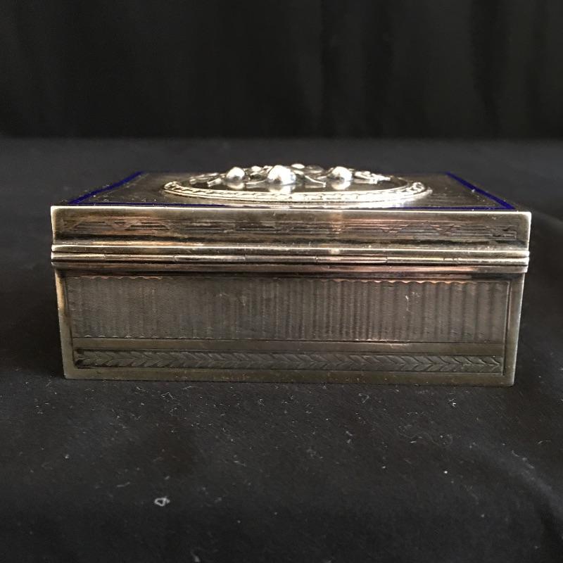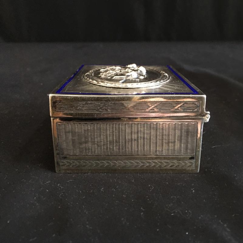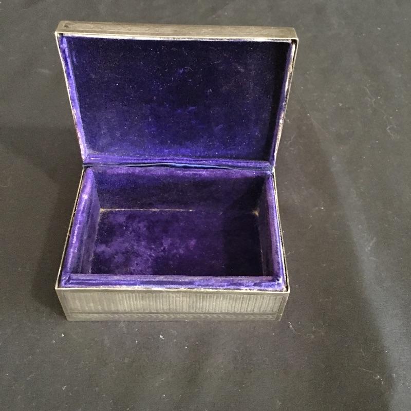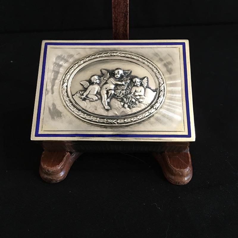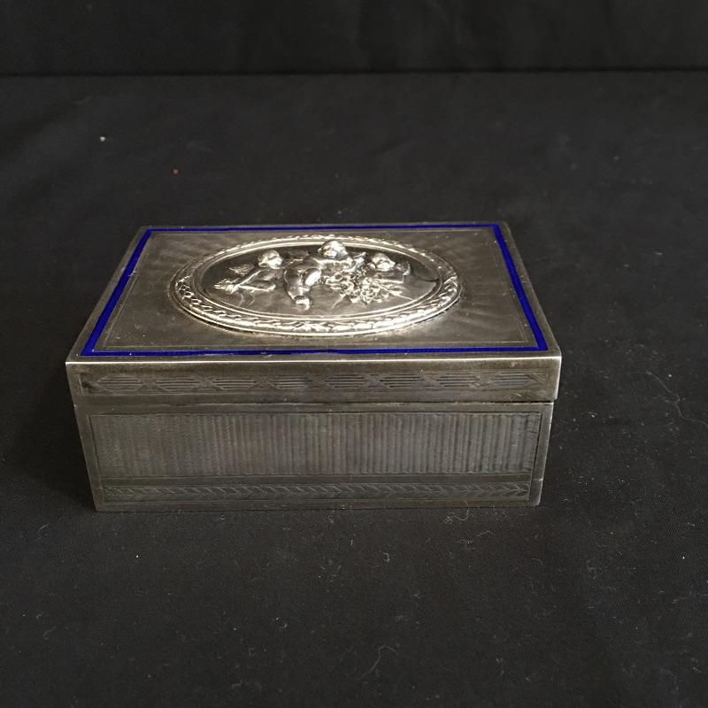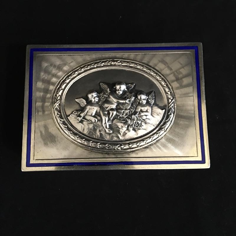 Beautiful silver box marked 935 with blue velvet lining and what s appears to be Cupid and angels on the top of box. A lovely box to display and put your precious items in. Box measures 2.75” x 3.75” x 1.5”.