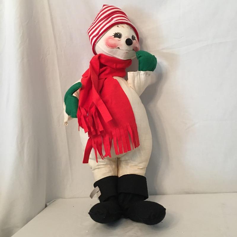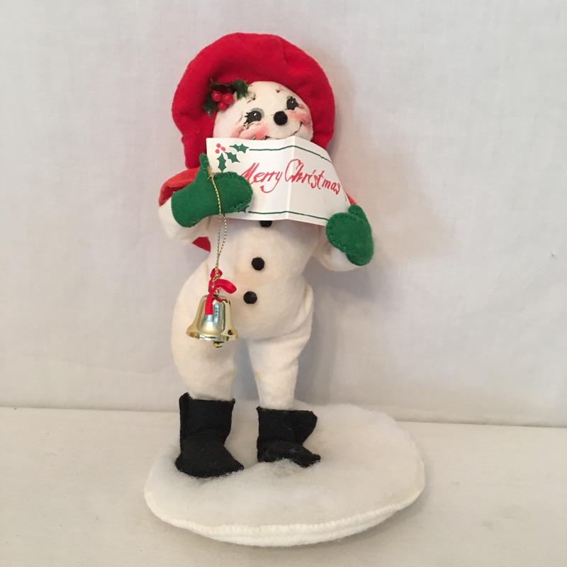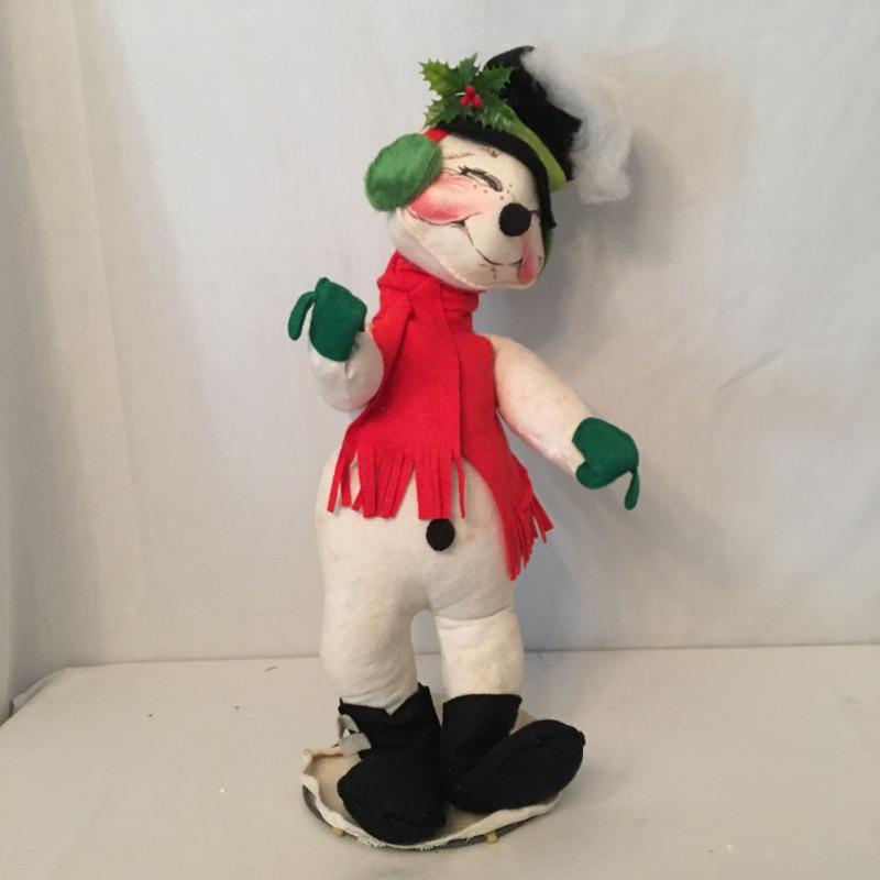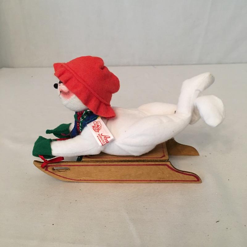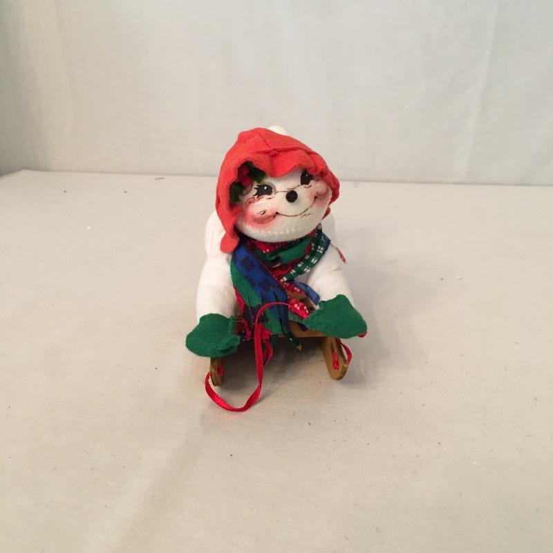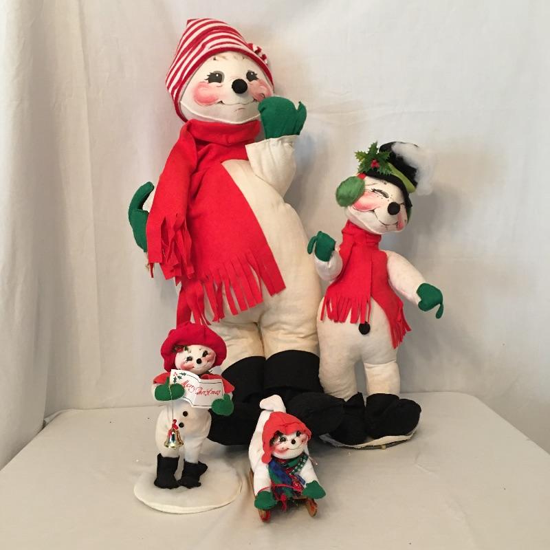 A quartet of Annalee snowmen with the smallest one on a sleigh that has come unglued, but looks like an easy fix, large and medium snowmen are well loved, see pictures. Largest snowman measures 32” tall.
