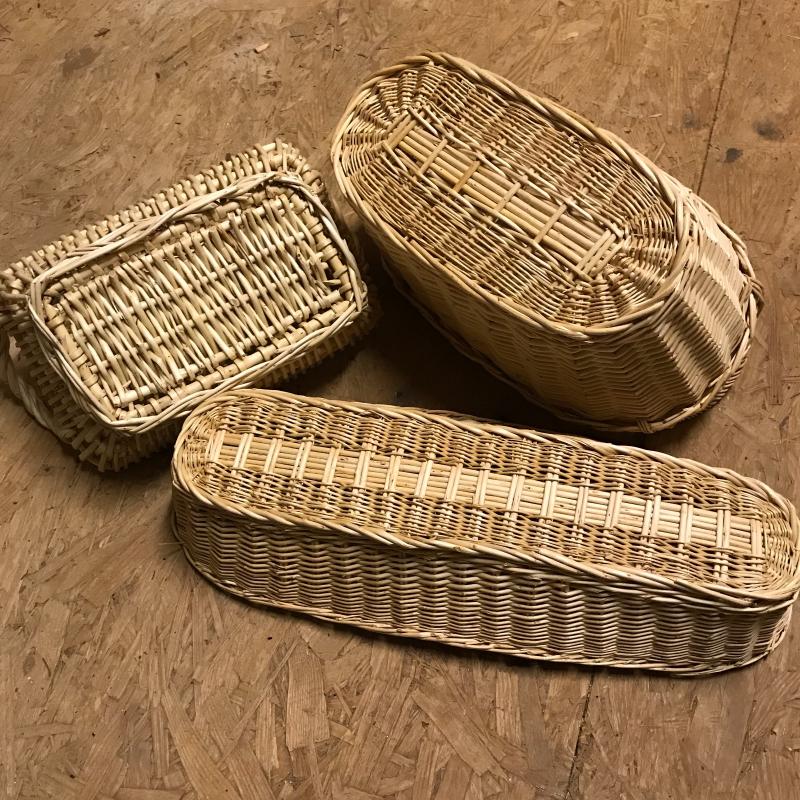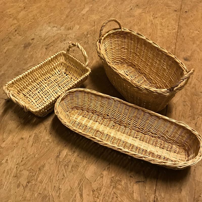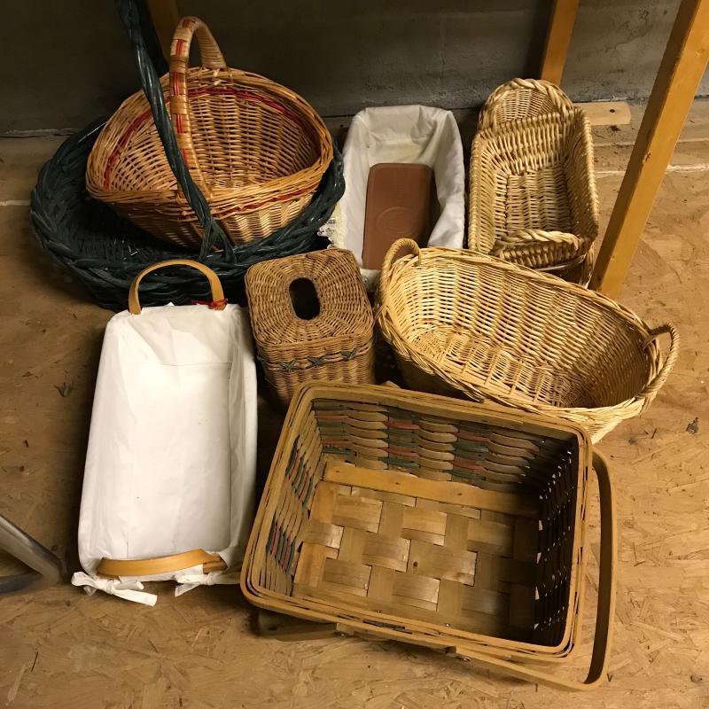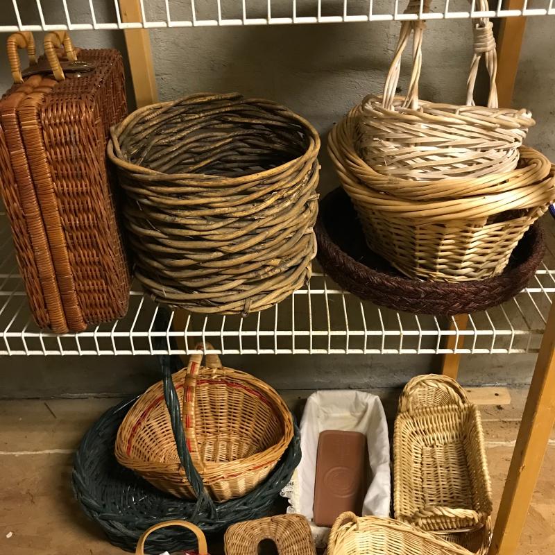 Large lot of baskets in all shapes and sizes, including one bread basket with ceramic bread warmer. See pics.