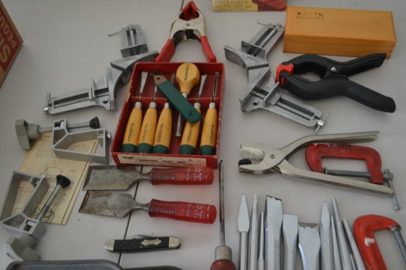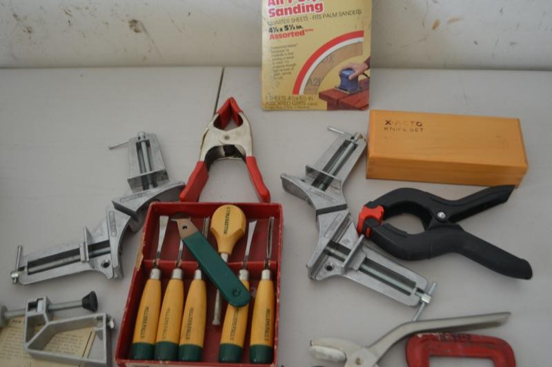 CHISEL SET, VINTAGE POCKET KNIFE, C CLAMPS AND EXACTO SET