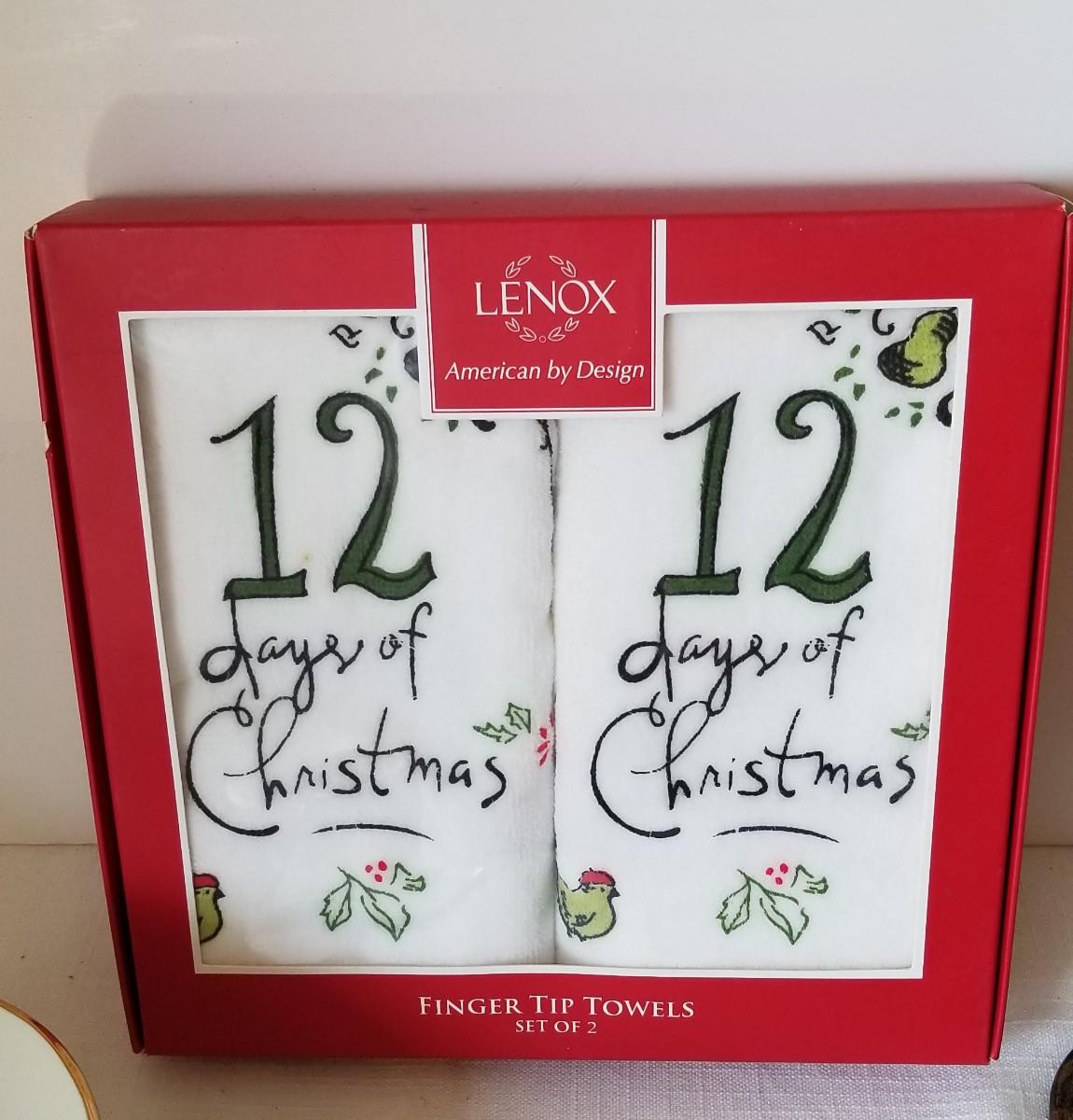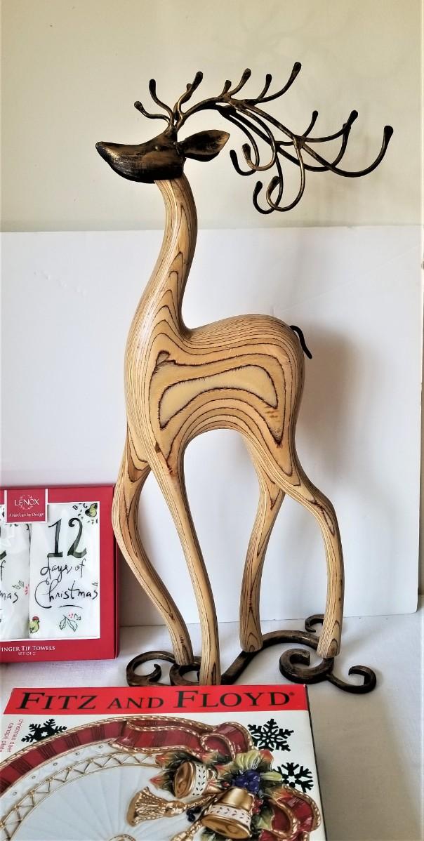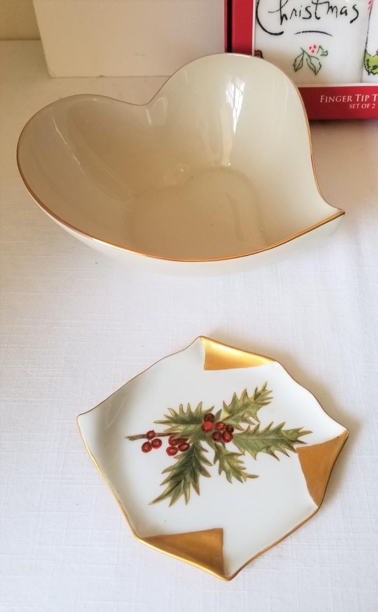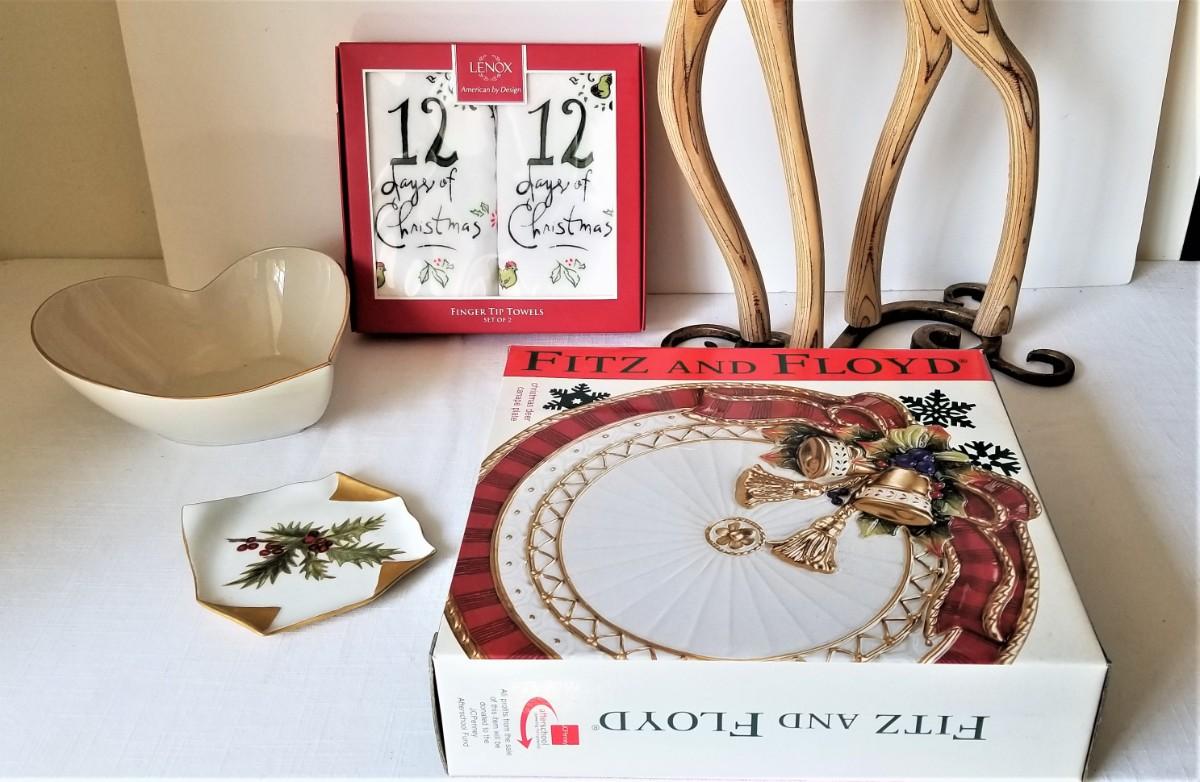 Nice contemporary Christmas Lot - Lenox finger tips towel set (new), Fitz and Floyd Canape plate in box, vintage hand painted holly dish, Lenox heart bowl, decorative reindeer (26" tall). All good condition.