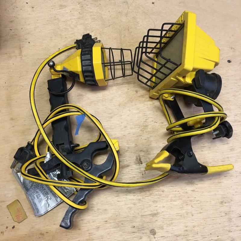 this lot has two clamp lights, two Kreg clamps, Irwin quick grip clamps, two Jorgensen clamps and more clamps. Both lights worked when tested. Longest clamp measures 28”.