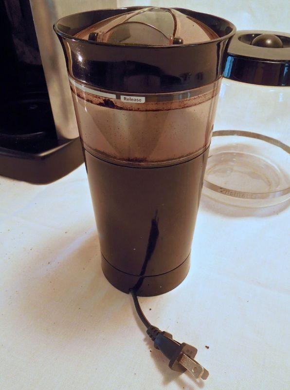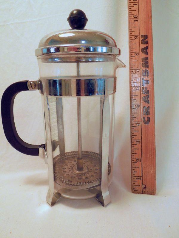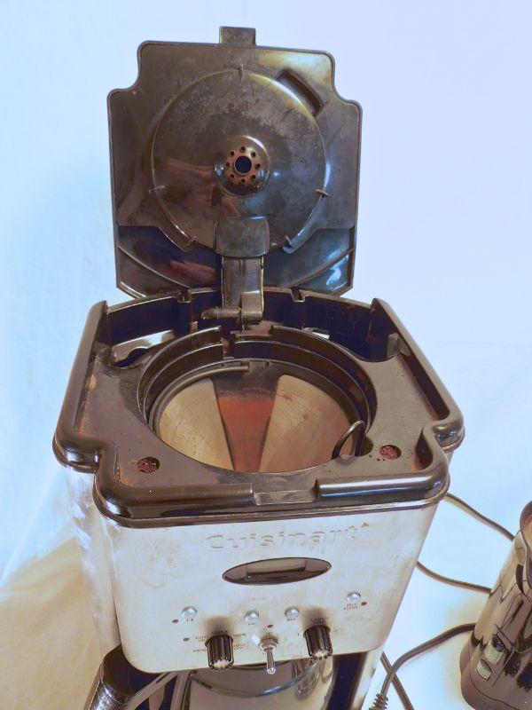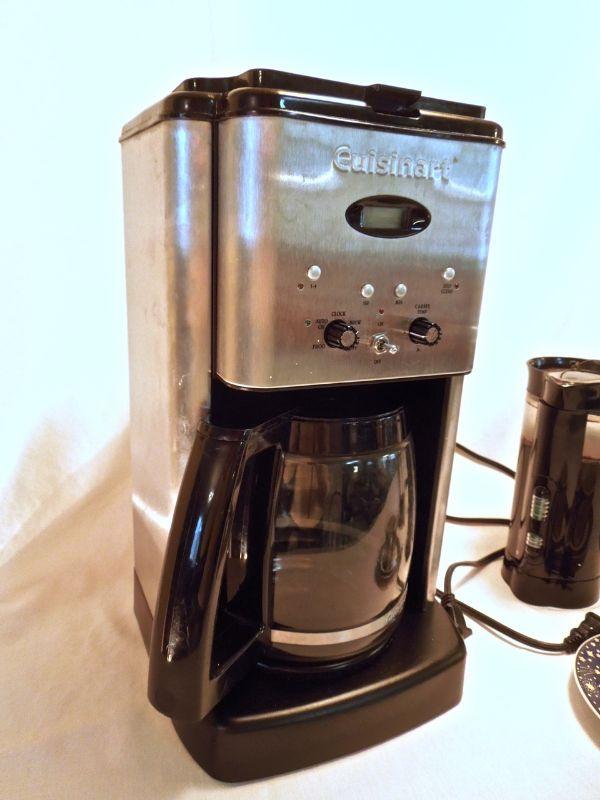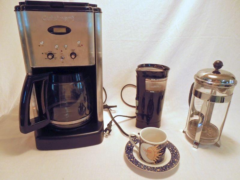 Cuisinart DCC1200 stainless drip 12 cup coffee maker; Mr. Coffee IDS 77 electric coffee grinder; a Bodum french press; and a Vitromaster sun and moon espresso cup and saucer.
