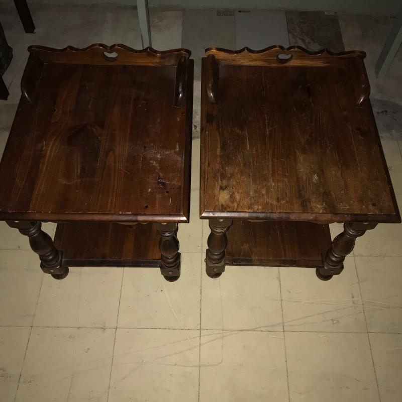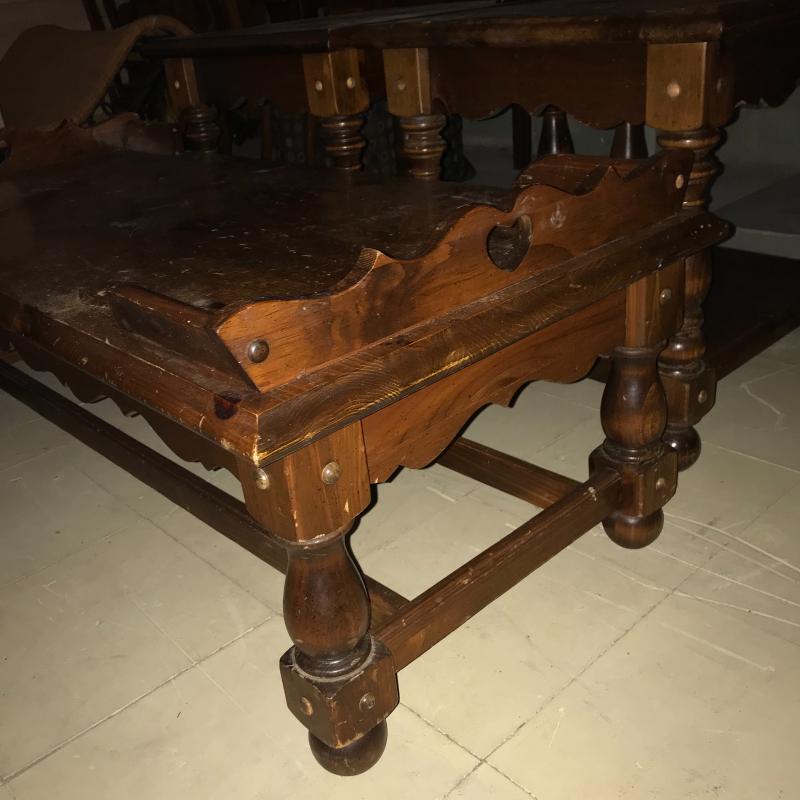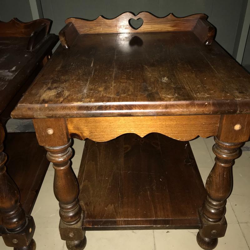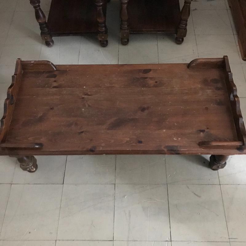 Wood tables are matching with some scuff marks but very sturdy. A good paint project, perhaps. Coffee table measures 48” x 22” x 17” and two side tables each measure 26” x 22” x 25”. Lot is available for local pick up in Maggie Valley, NC only.