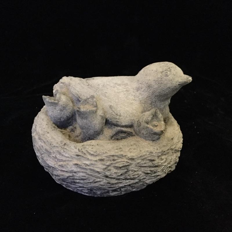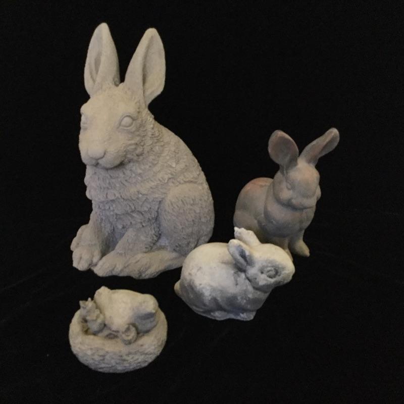 Includes: Three heavy, solid concrete bunny statues and a concrete mama bird and baby birds in their nest.